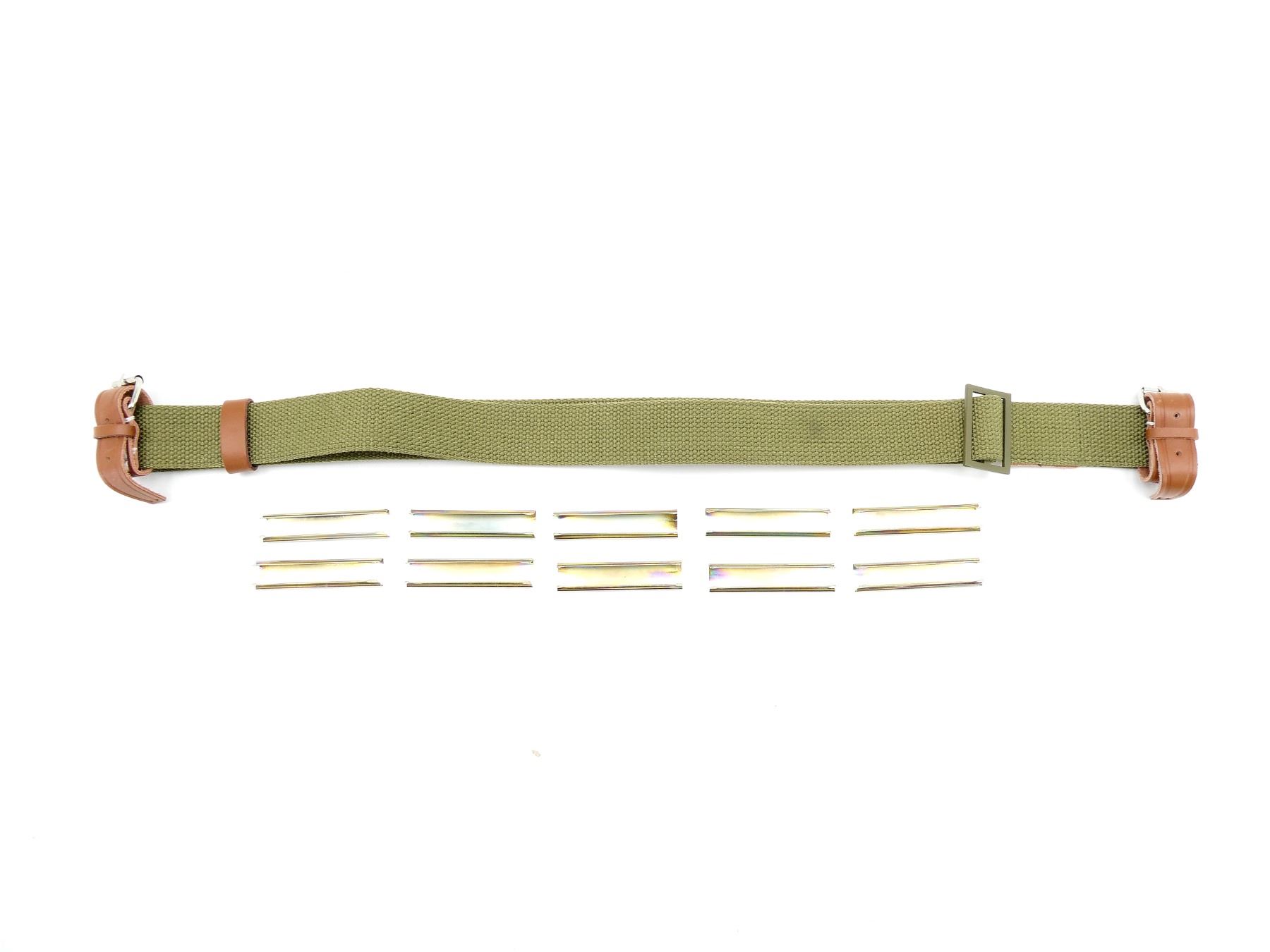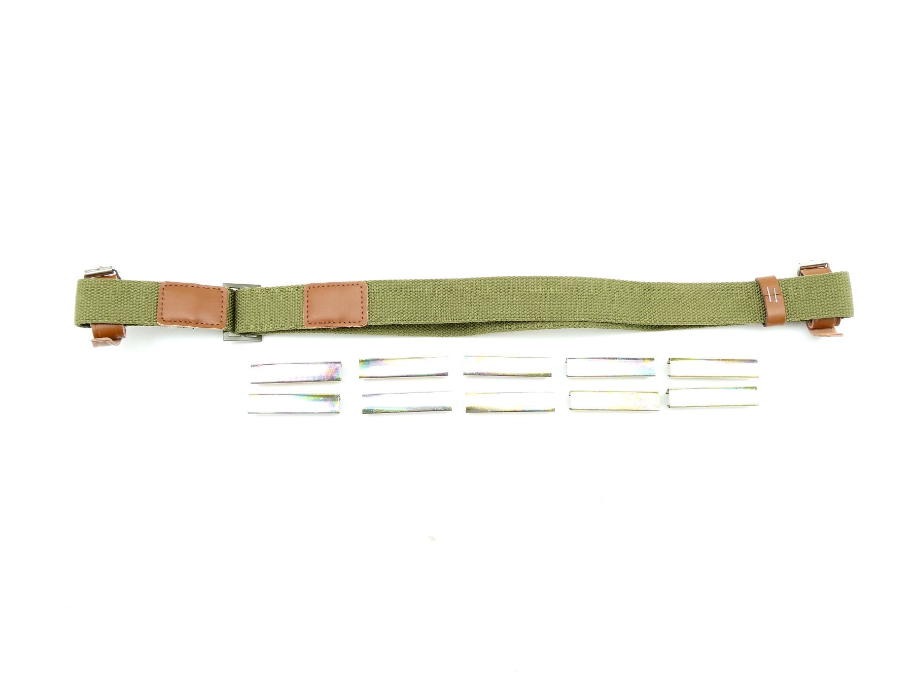 LOT INCLUDES; (1) NEW MANUFACTURE MOSIN NAGANT SLING, NO VISIBLE MARKINGS, OAL APPROX. 41.5", ADJUSTABLE & (10) REPRODUCTION MOSIN NAGANT STRIPPER CLIPS, FITS M38, M44 & M91/30 RIFLES, 7.62X54R 5-RND, NO VISIBLE MARKINGS. SEE PHOTOS.