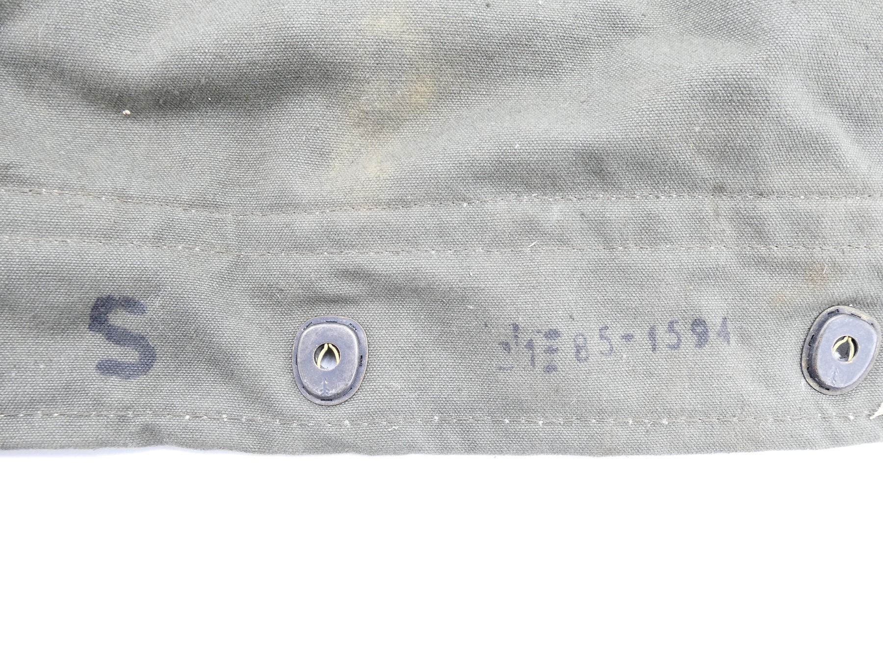 LOT INCLUDES; (1) GREEN RUBBER GAS MASK, EYE PIECES INTACT, MARKED: "M-59", "S", "21-85-1594", BLACK ELASTIC HEAD STRAPS, (1) GREEN PAINTED FILTER, MARKED: "21-85-1594" & (1) CANVAS CARRY BAG WITH SHOULDER STRAP, BAG MARKED: "S" & "21-85-1594", APPROX. 13" X 4" X 10.5". SEE PHOTOS.