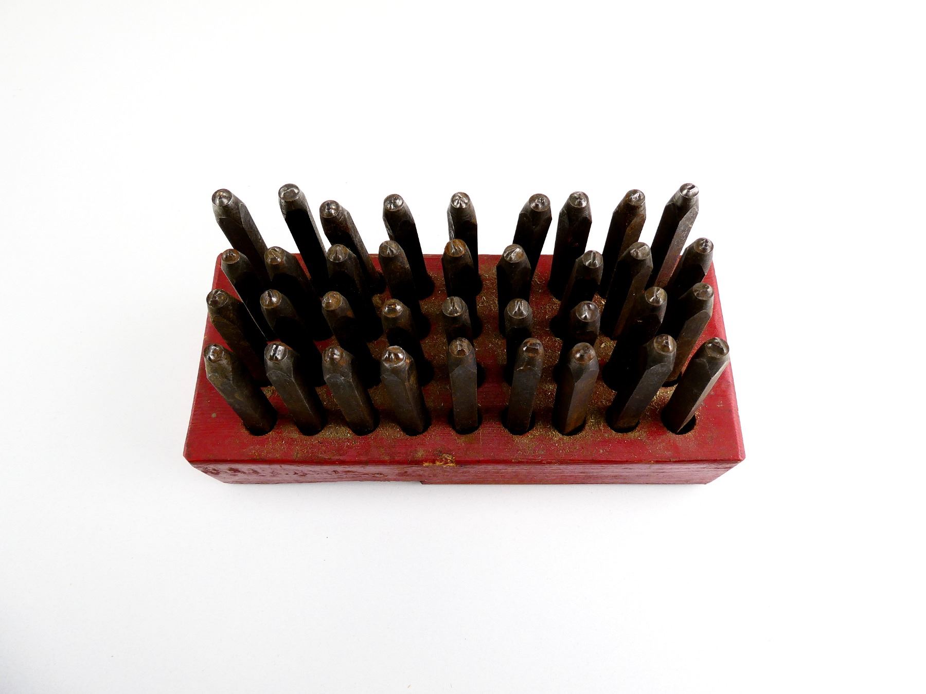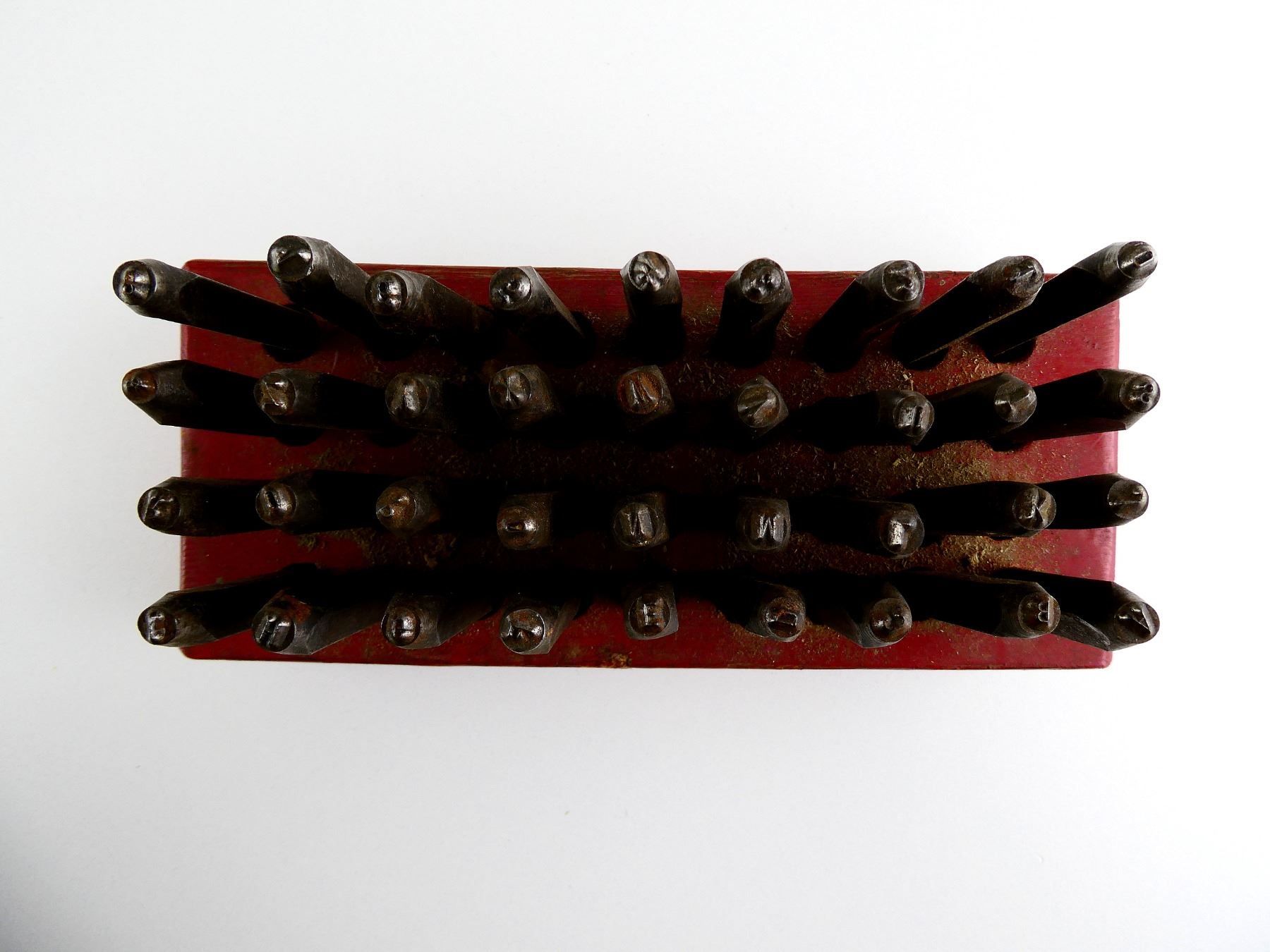 LOT INCLUDES; APPROX. (36) METAL STAMPS WITH RED PAINTED WOODEN HOLDER, LETTERS A TO Z, NUMBERS 0 TO 8, LAST STAMP IS THE "&" SIGN, NO VISIBLE MARKINGS, OAL'S OF STAMPS APPROX. 3.25", WOODEN HOLDER APPROX. 8" X 3.5" X 1.5". SEE PHOTOS.