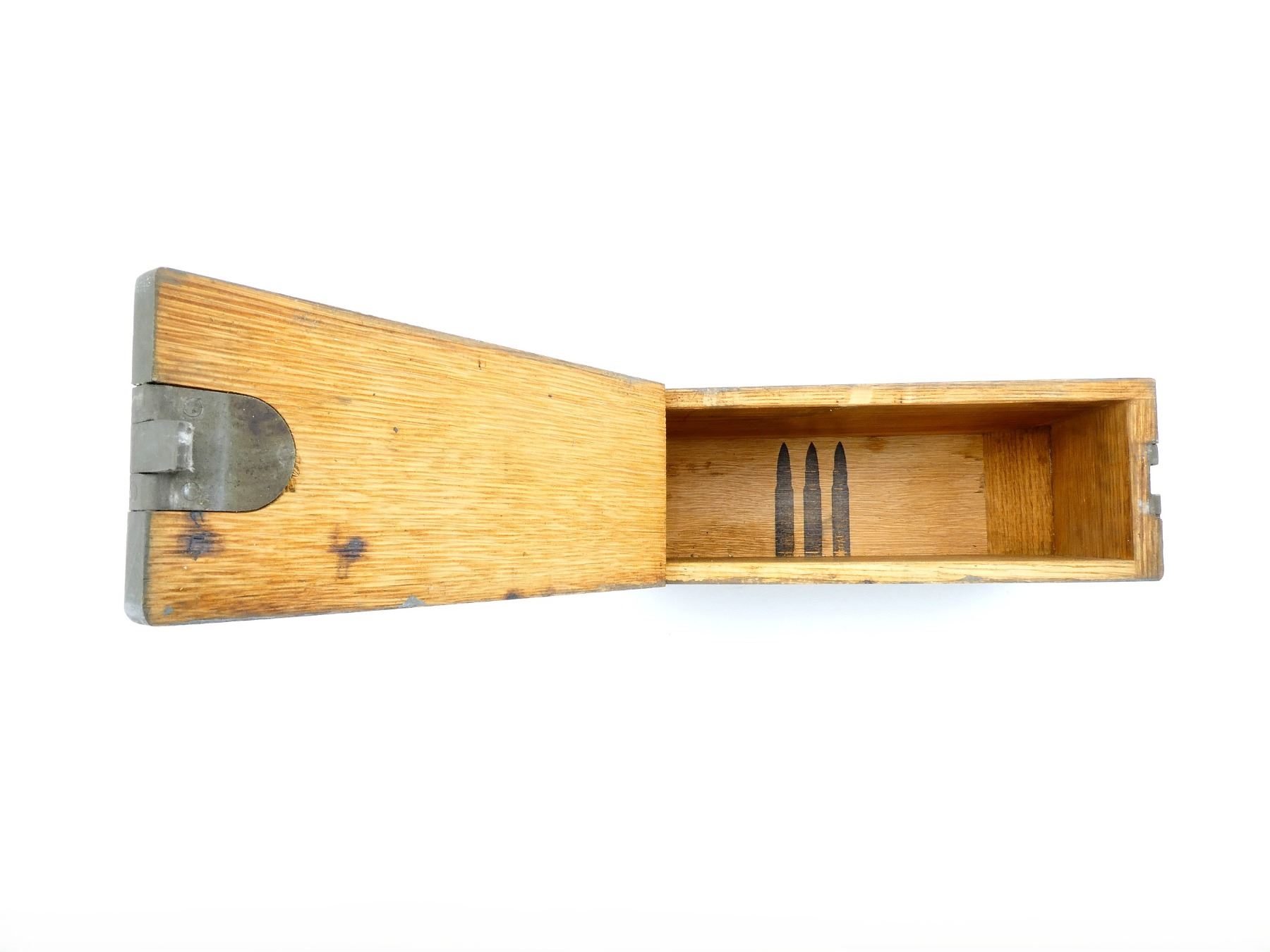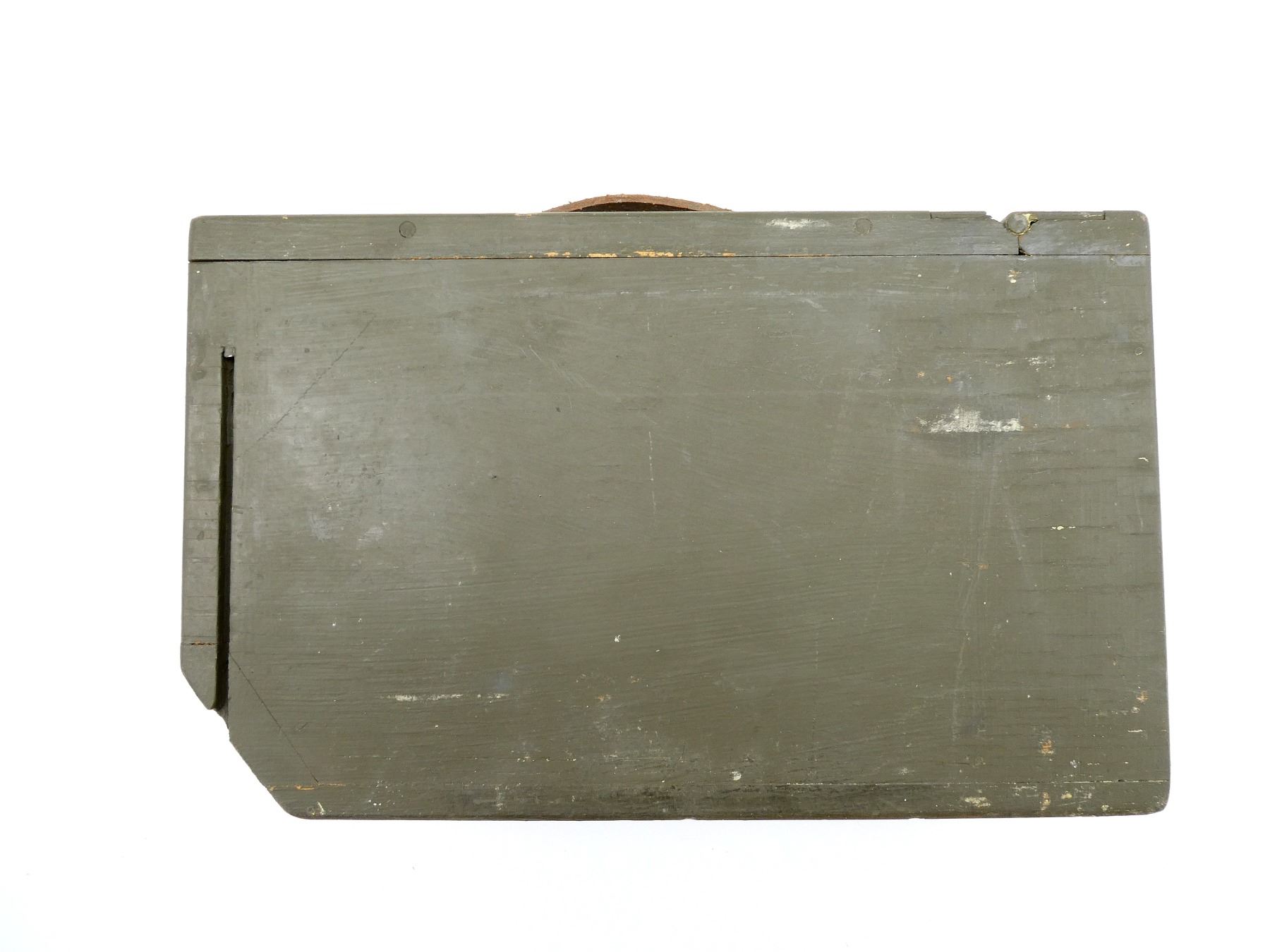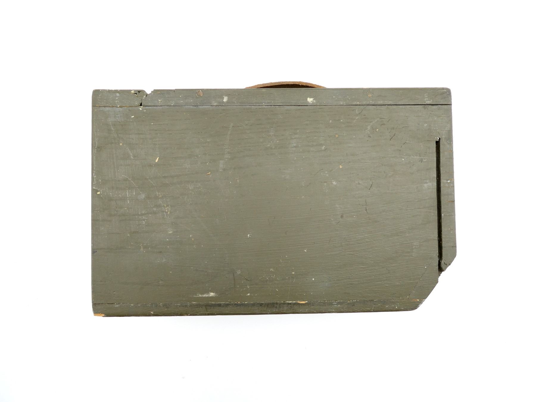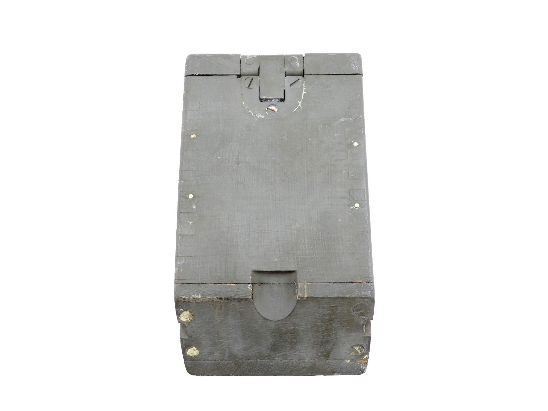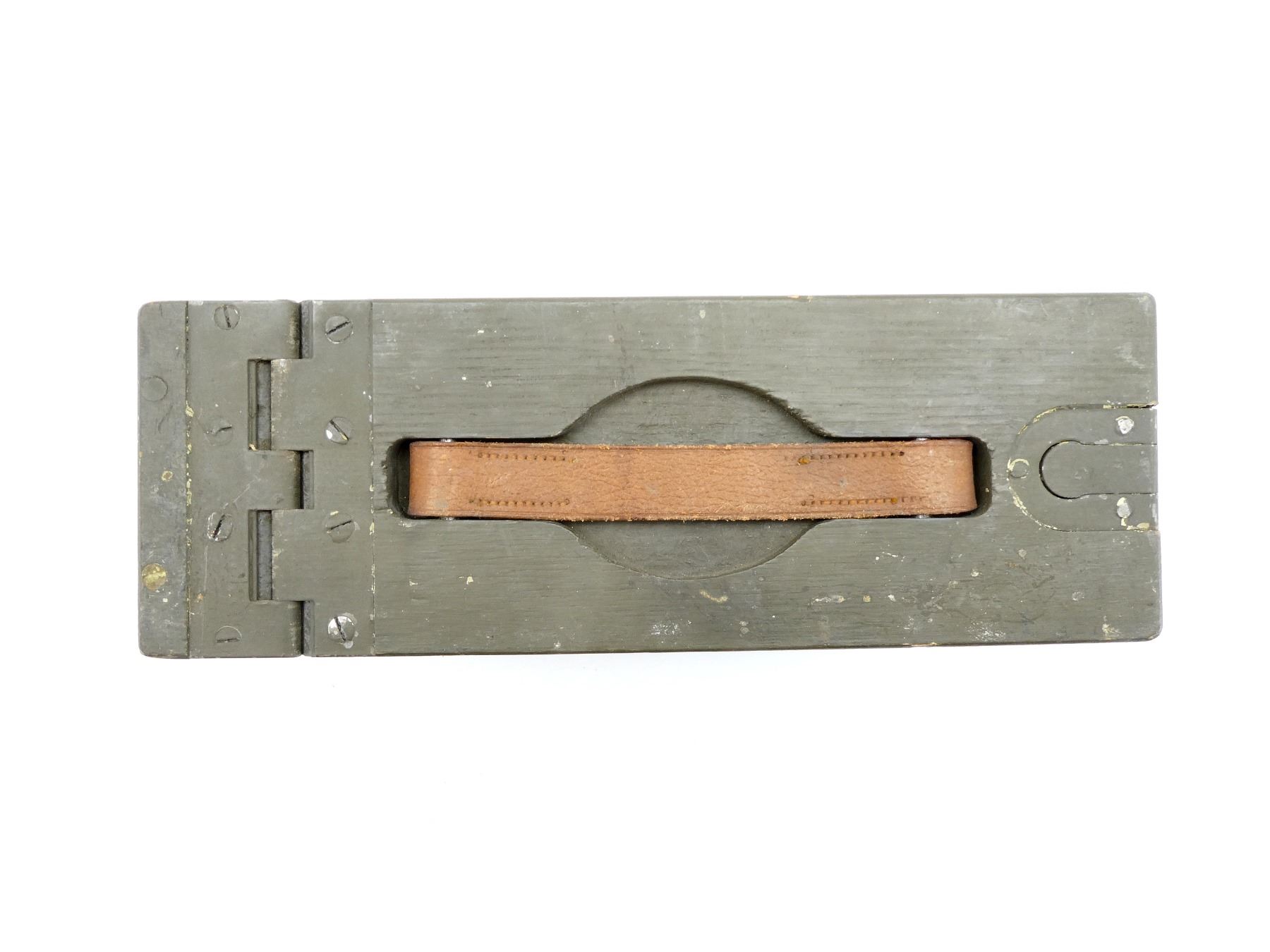 (1) FITS 1917 .30-06 CLOTH BELTS, GREEN PAINTED WOOD, LEATHER HANDLE, METAL HINGES / LATCH, LATCH WORKS, NO VISIBLE MARKINGS, BULLET SHAPE STENCILED ON THE BASE OF THE BOX INSIDE, APPROX. 12.75" L X 4.5" W X 8" H. SEE PHOTOS.