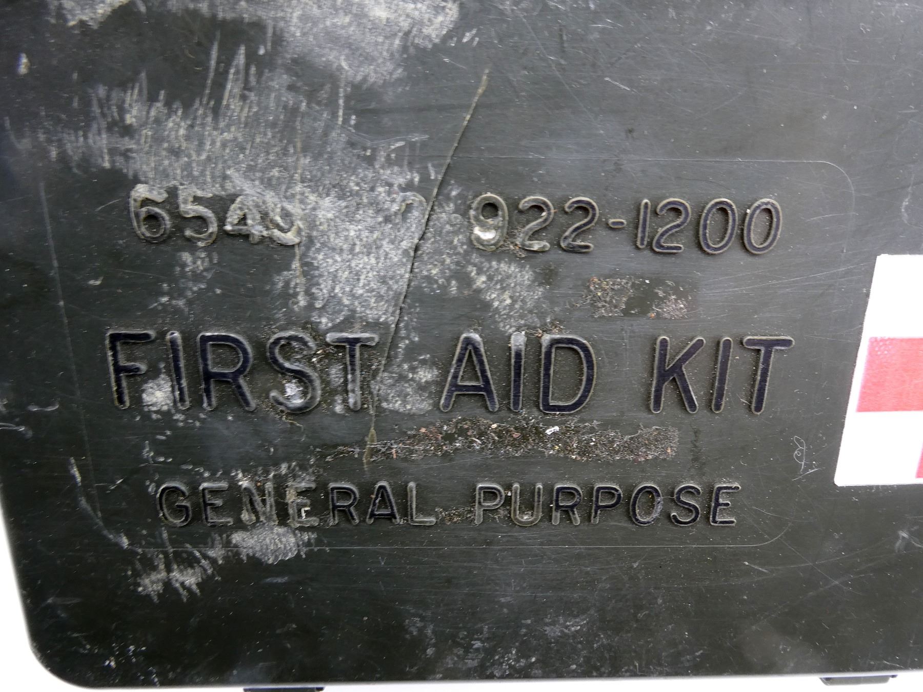 LOT INCLUDES; (2) FIRST AID KITS, ONE IS EMPTY, OTHER HAS CAMO COMPRESS & BANDAGE, CAMO FIELD DRESSINGS, PETROLATUM GAUZE, ETC., CONTAINERS MARKED: "6545-00-922-1200, FIRST AID KIT, GENERAL PURPOSE" WITH MEDICAL SYMBOL, APPROX. 8.25" X 5.75" X 3". SEE PHOTOS.