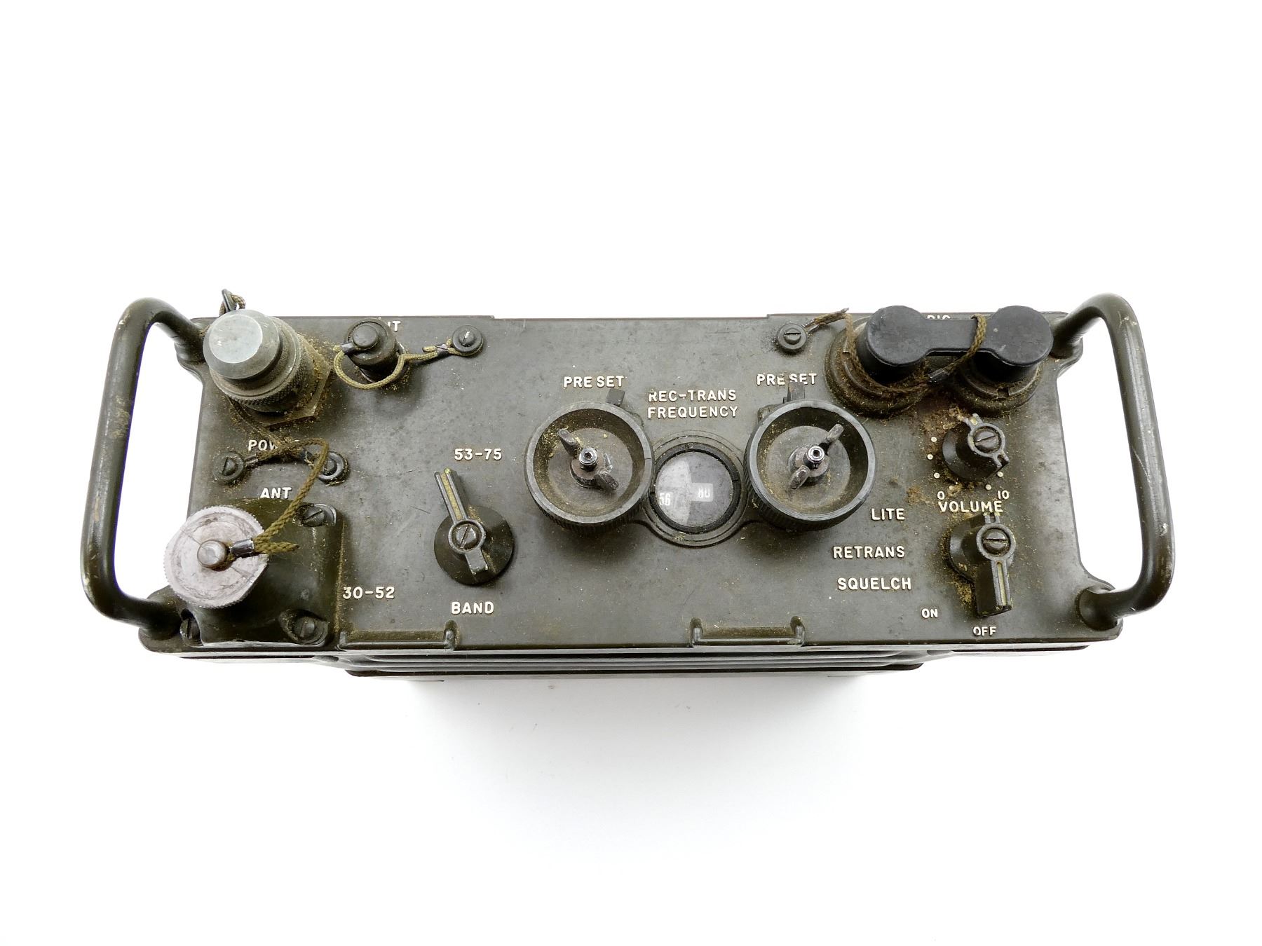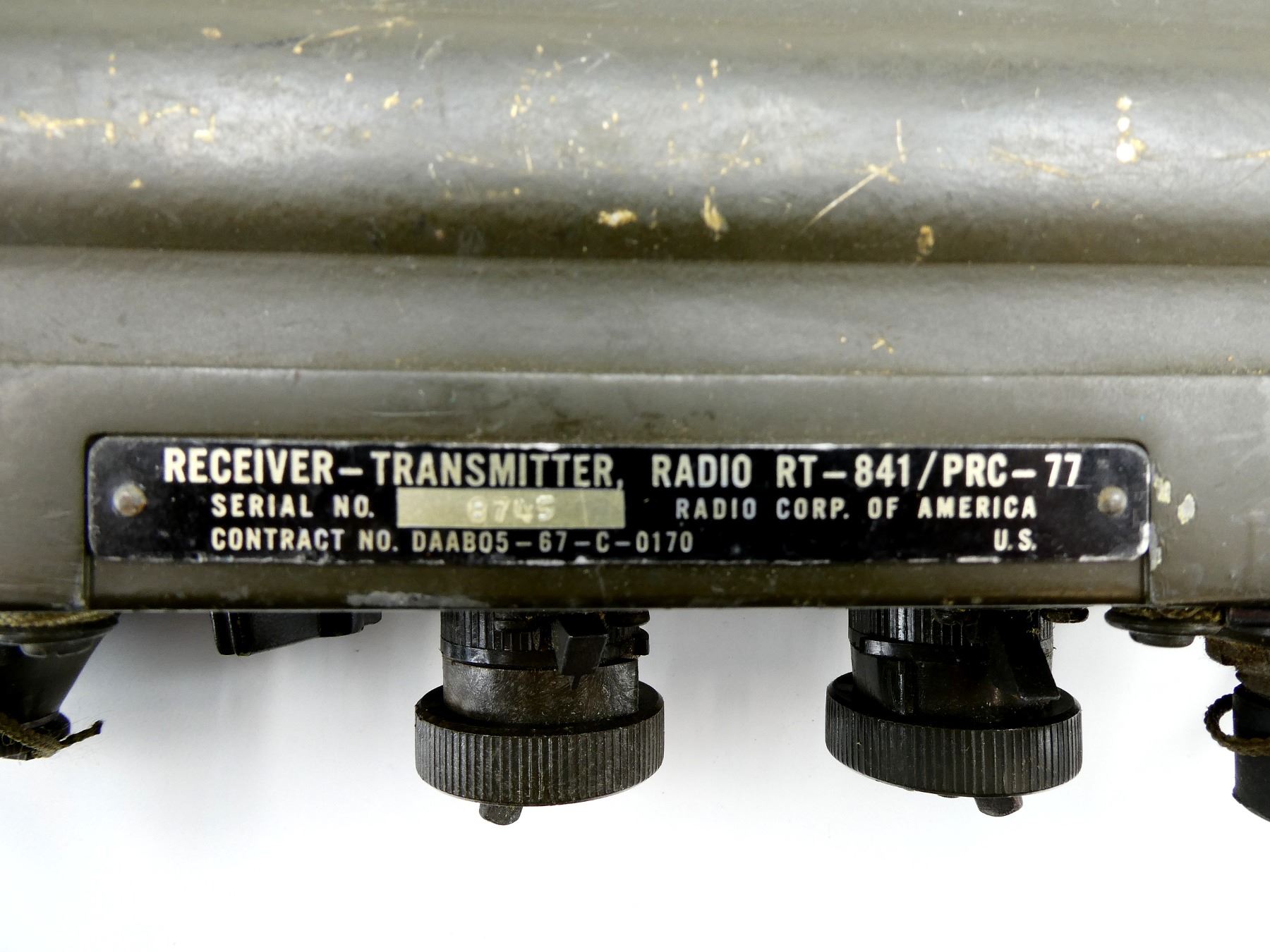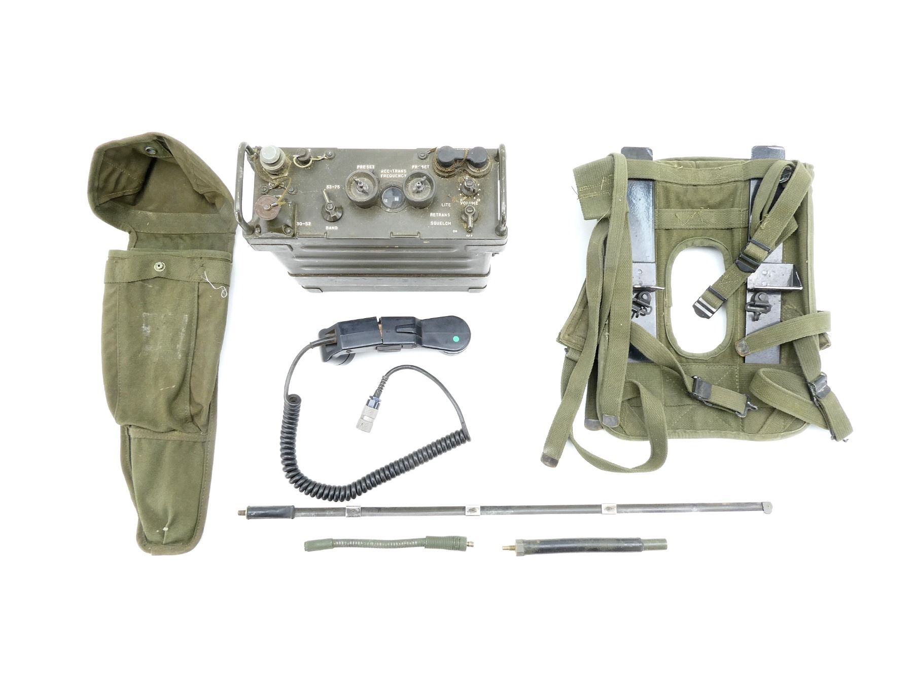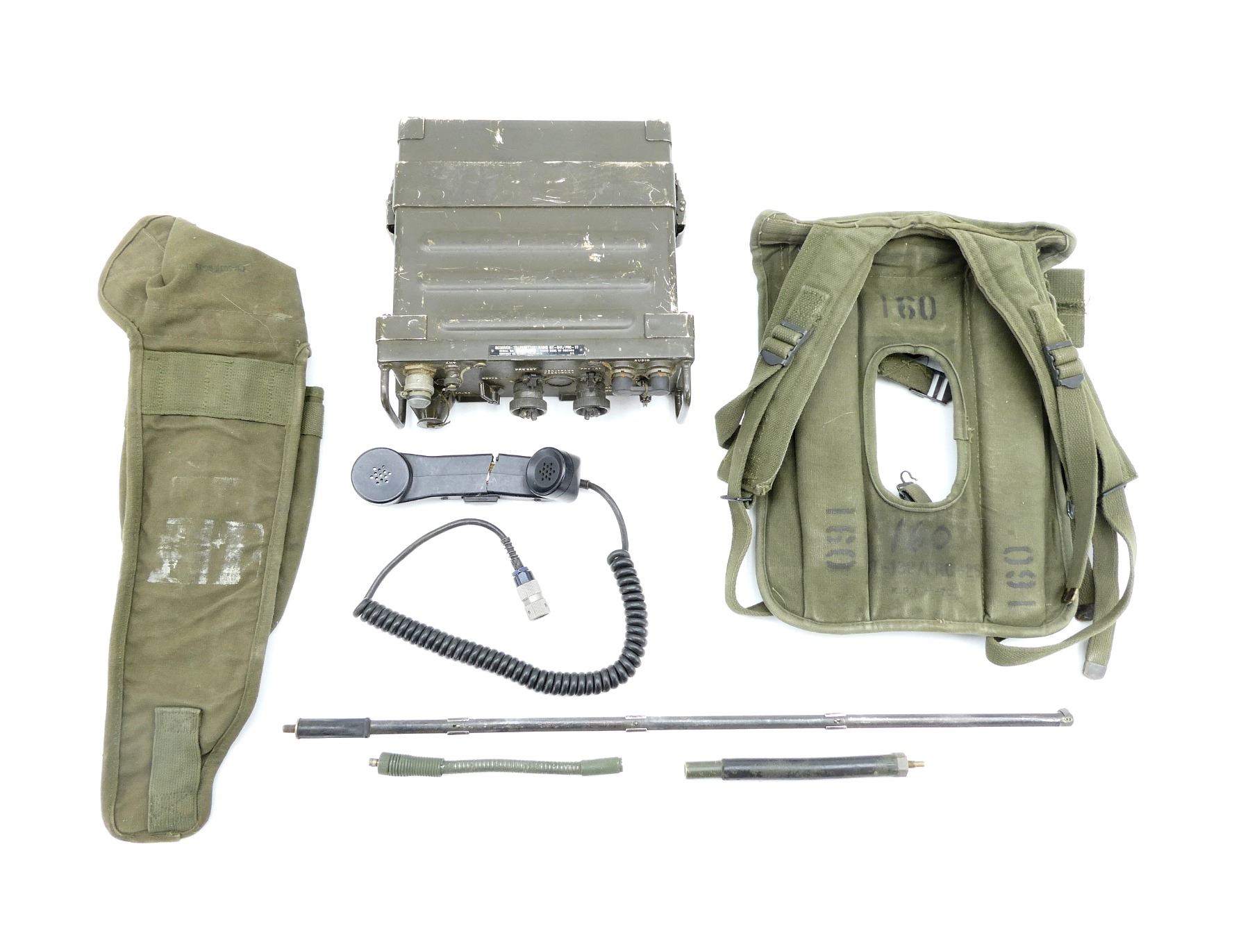 LOT INCLUDES; (1) RT-841/PRC-77 RADIO RECEIVER / TRANSMITTER, UN-TESTED, GREEN PAINTED METAL CONSTRUCTION, WITH DATA PALTE, MARKED: "RECEIVER-TRANSMITTER RADIO RT-841/PRC-77, SERIAL NO. 8745, RADIO CORP. OF AMERICA, U.S." ETC., VARIOUS SWITCHES / DIALS, METAL CARRY HANDLES, BOTTOM COMPARTMENT, SHOWS WEAR, APPROX. 11" X 11" X 4.25", (1) BLACK POLYMER HANDSET WITH CONNECTOR CABLE, UN-TESTED, VARIOUS MARKINGS, MIDDLE OF HANDSET CRACKED / BROKEN, SHOWS WEAR / TEAR, (1) GREEN CANVAS ANTENNA BAG WITH VARIOUS ANTENNA PIECES, UN-SURE IF COMPLETE, UN-TESTED, NO VISIBLE MARKINGS ON PIECES, BAG MARKED: "CW-503/PRC-25", SHOWS WEAR & (1) GREEN CANVAS BACKPACK WITH METAL FRAME / BRACKETS, MARKED: "160, ST-132/PRC-25" & VARIOUS OTHER MARKINGS, SHOWS WEAR. SEE PHOTOS.