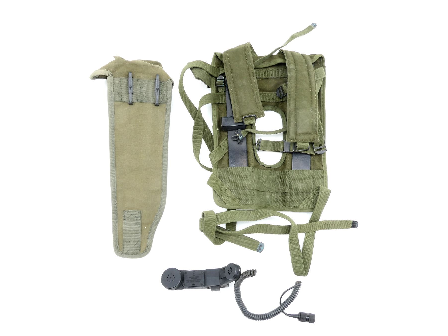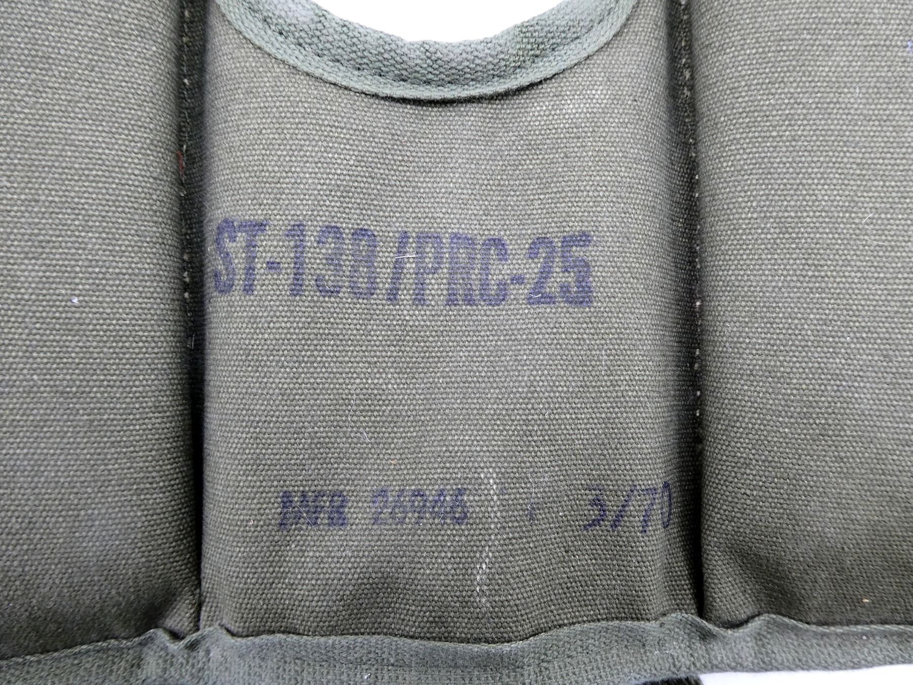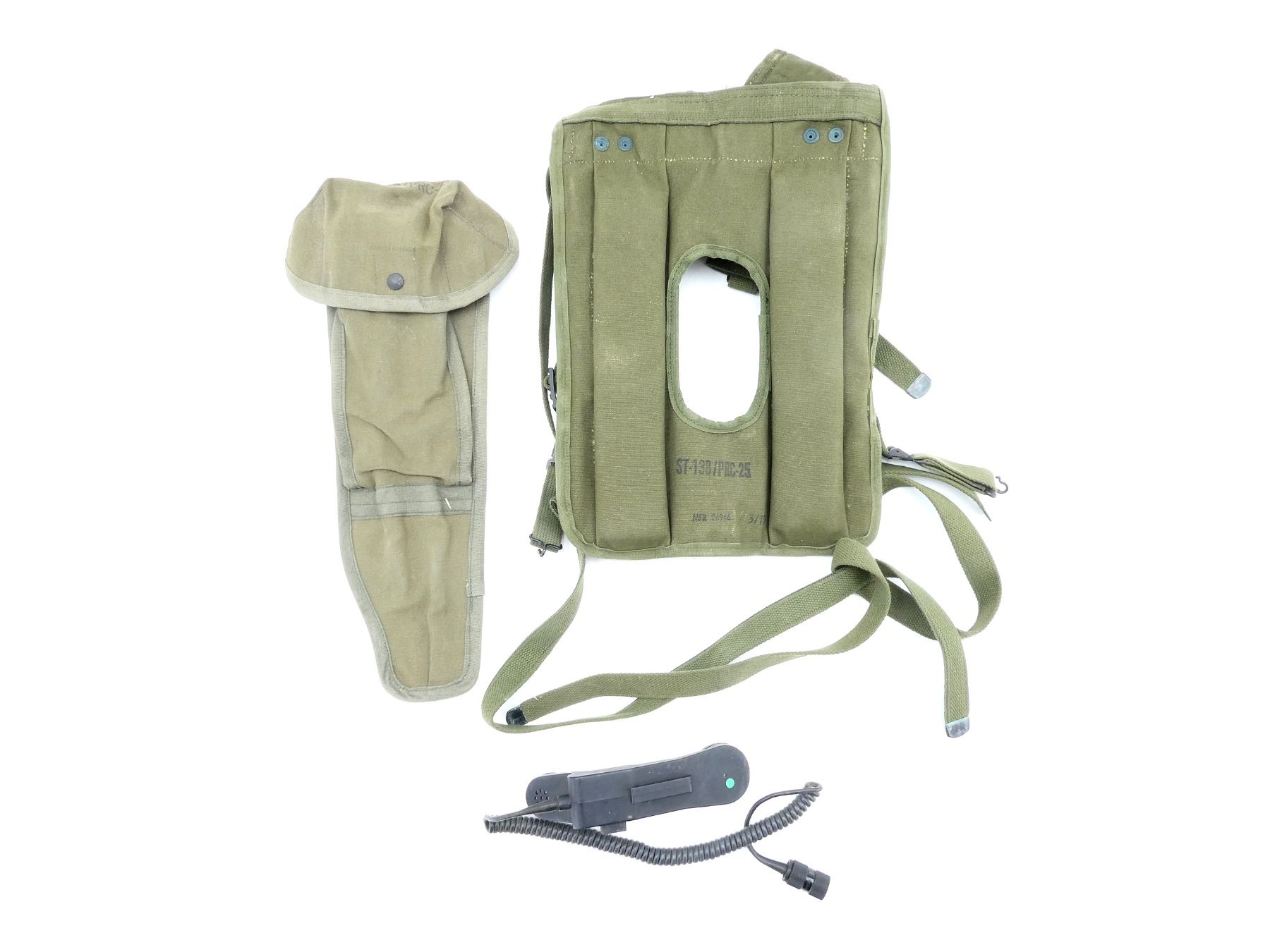 NO RADIO, LOT INCLUDES; (1) BLACK POLYMER HANDSET WITH CONNECTOR CABLE, UN-TESTED, VARIOUS MARKINGS, (1) GREEN CANVAS ANTENNA BAG, NO ANTENNAS, BAG MARKED: "CW-503/PRC-25", BELT HOOKS, SHOWS WEAR & (1) GREEN CANVAS BACKPACK WITH METAL FRAME / BRACKETS, MARKED: "ST-138/PRC-25, MFR 26946, 3/70", SHOULDER STRAPS / VARIOUS STRAPS. SEE PHOTOS.
