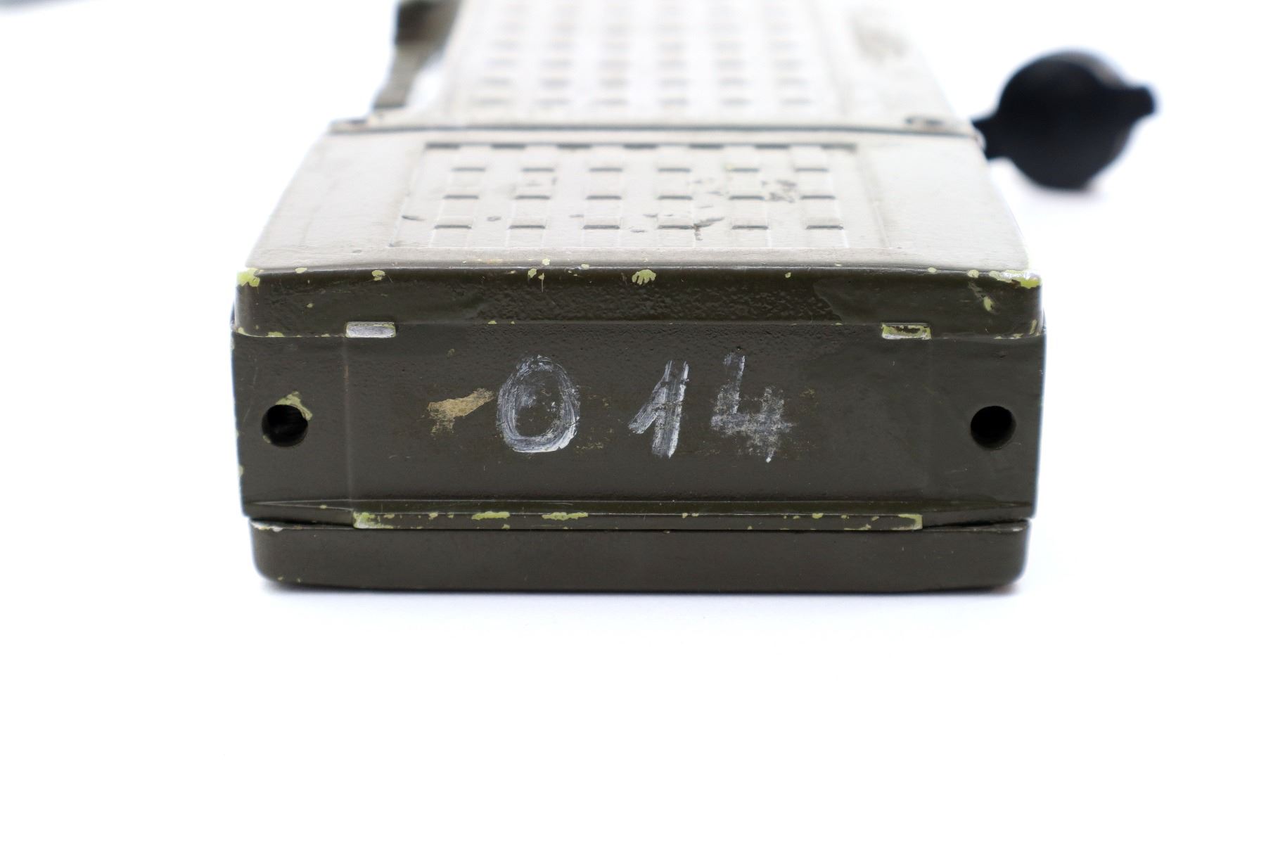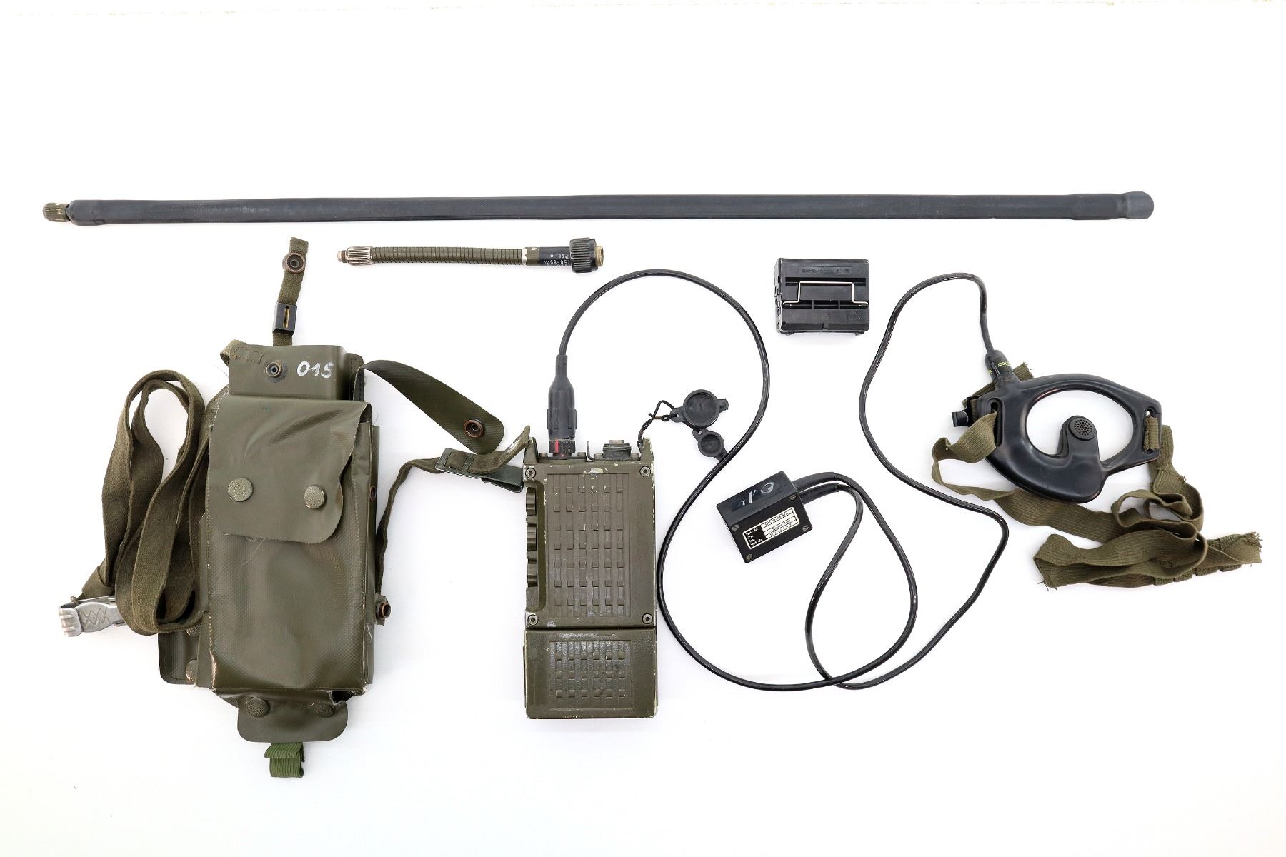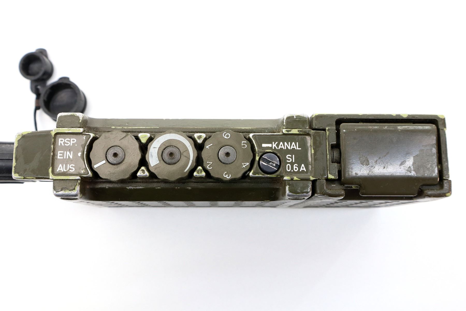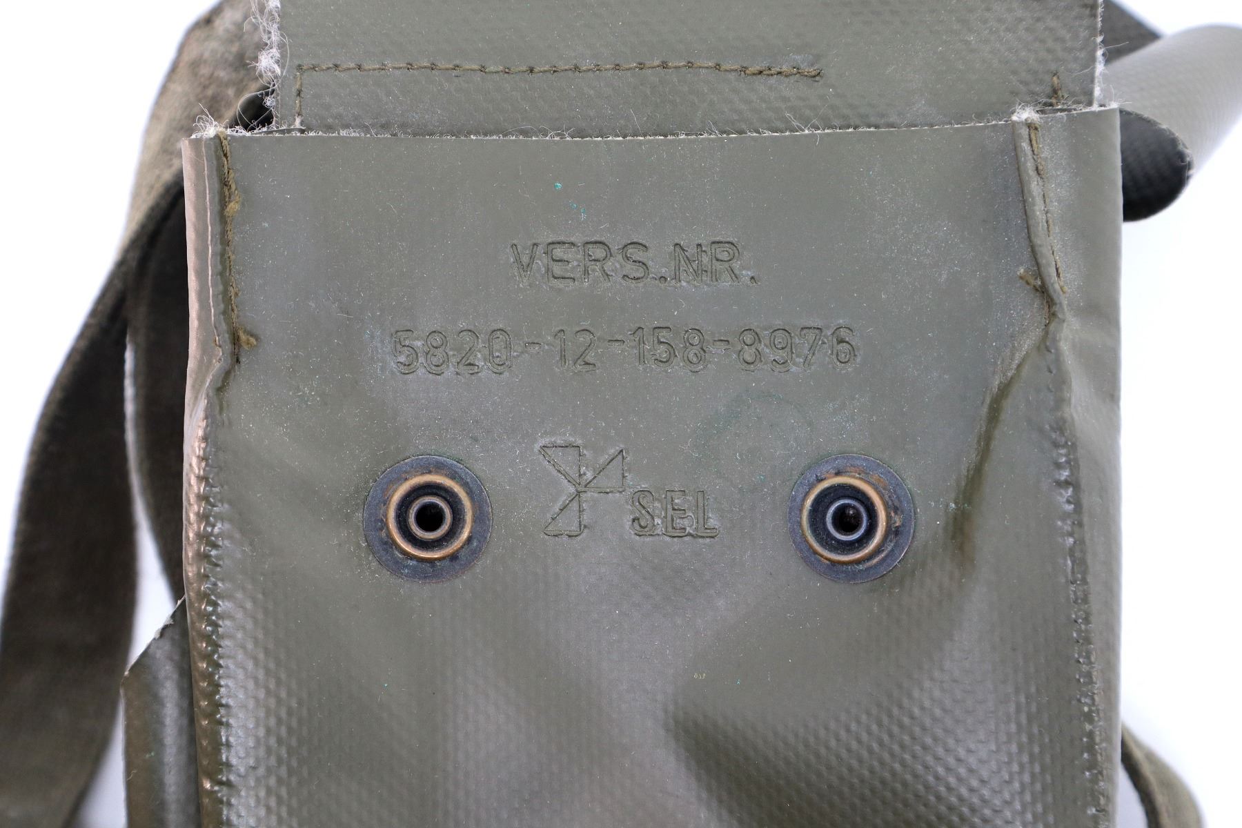 (1) SEM-52A RADIO WITH TAPE WHIP ANTENNA, MICROPHONE AND/OR EAR PIECE & GREEN RUBBER / NYLON CARRY CASE, UN-TESTED, VARIOUS MARKINGS ON RADIO, MISSING ONE DATA PLATE, MICROPHONE AND/OR EAR PIECE MARKED: "VERBINDUNG NICHT LOSBAR", VARIOUS FAINT / UN-CLEAR MARKINGS ON HEAD BAND, GREEN RUBBER / NYLON CASE WITH CANVAS STRAPS, CASE MARKED: "VERS.NR., 5820-12-158-8976, SEL" WITH PROOF MARK, PROOF MARK ON METAL CLIP OF STRAP, ANTENNAS MARKED: "SEL VN 5820-12-158-8973" & "5820-12-158-8974, SEL". SEE PHOTOS.