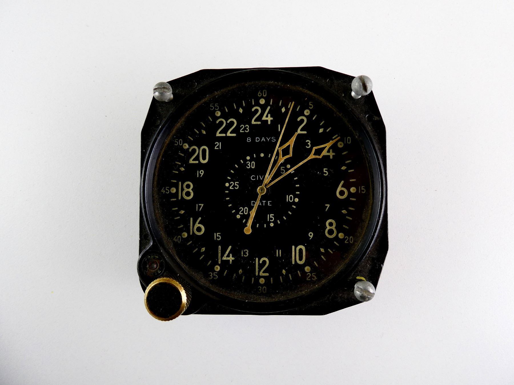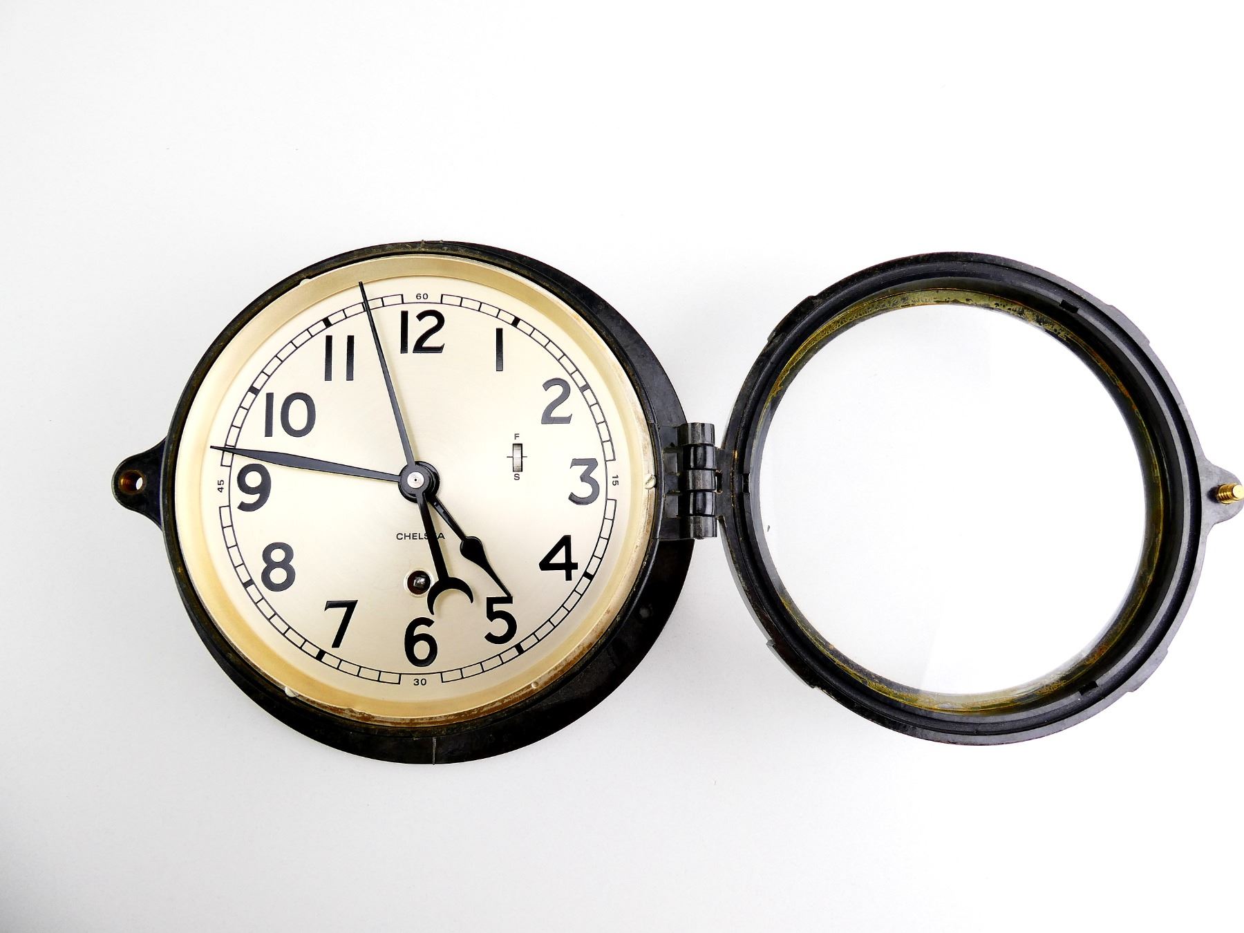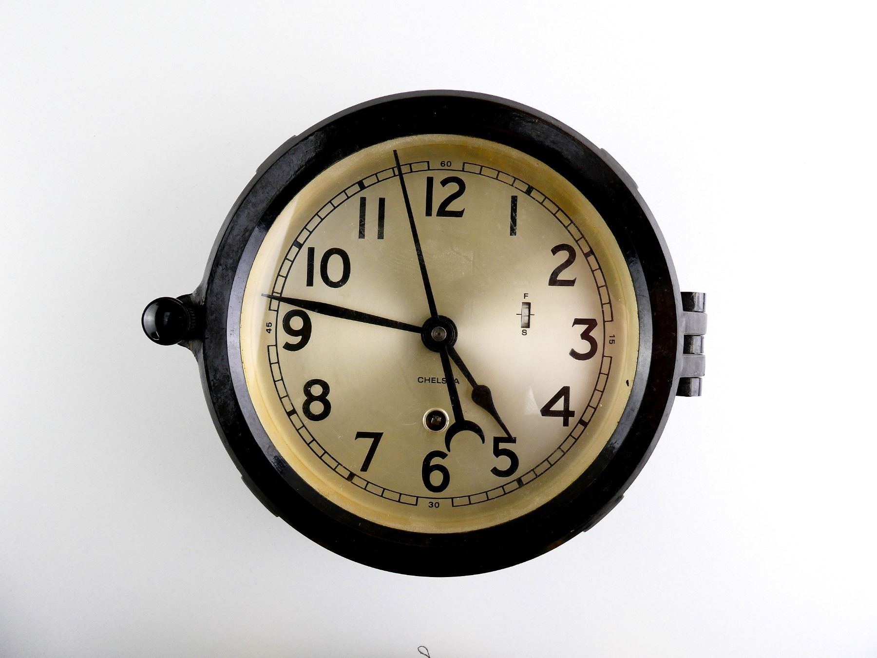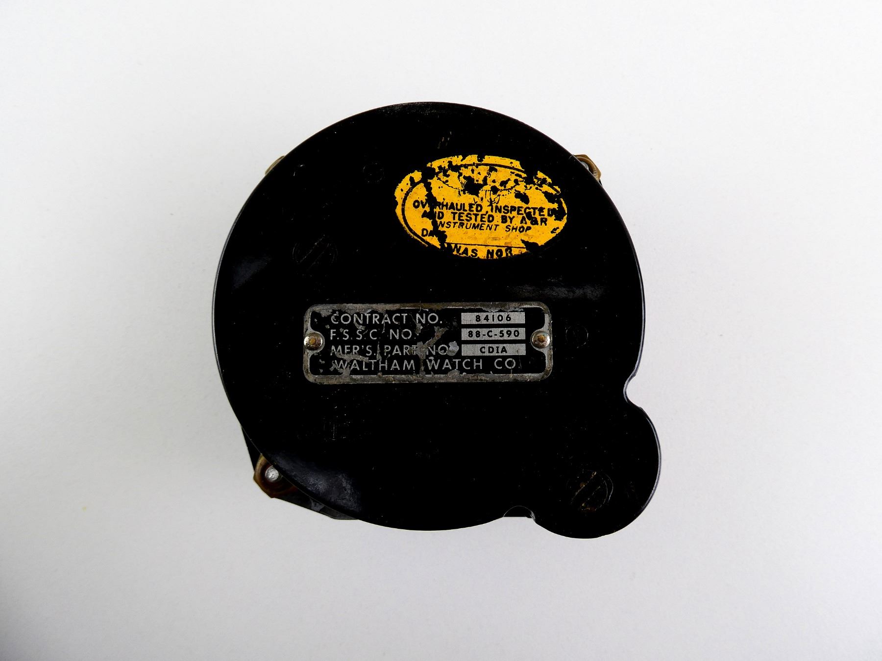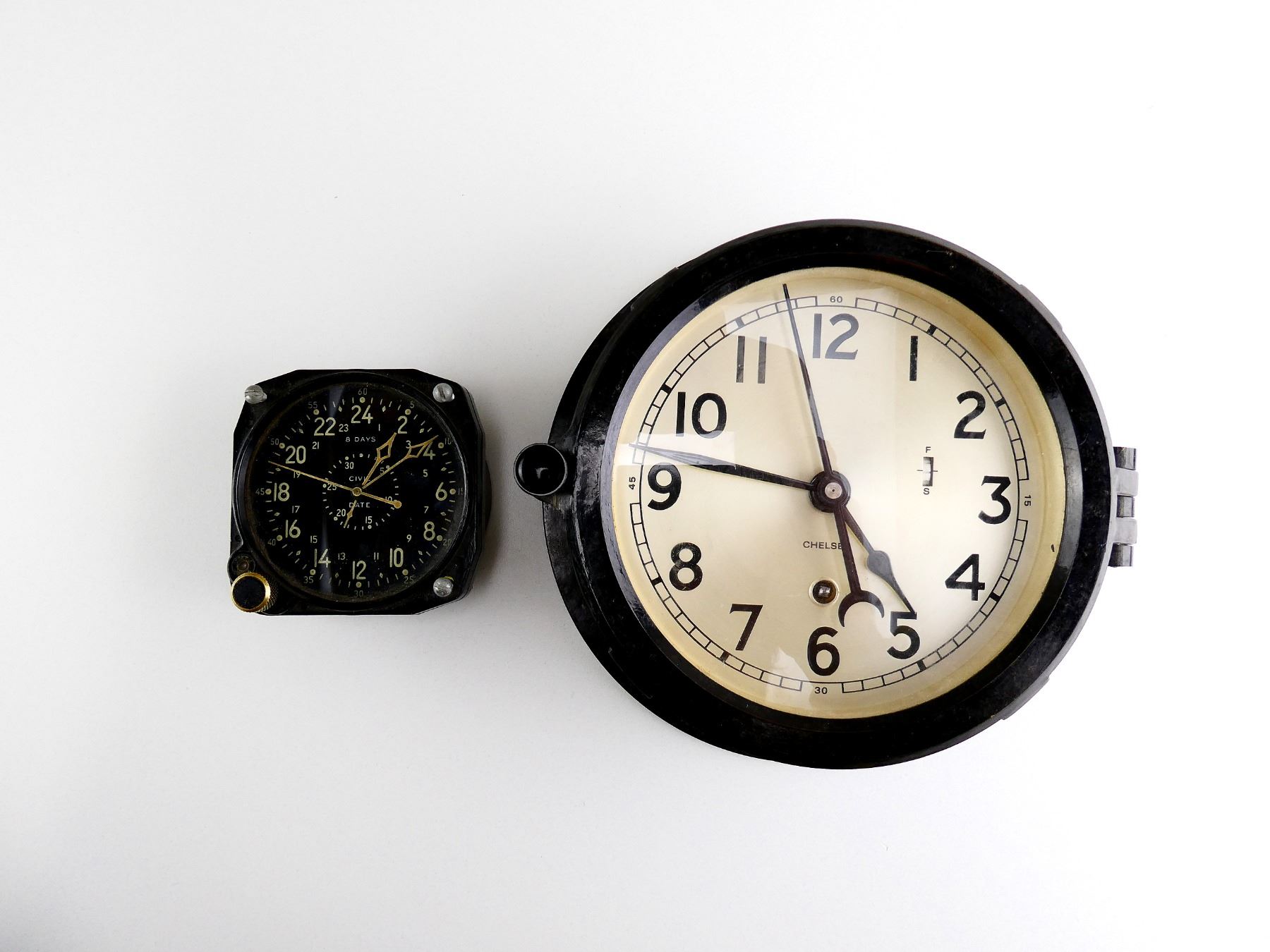 LOT INCLUDES; (1) CONSIGNOR STATES: "AIRCRAFT 24-HOUR CLOCK IN WORKING CONDITION", BACK DATA PLATE MARKED: "CONTRACT NO. 84106, F.S.S.C. NO. 88-C-590, MFR'S PART NO CDIA, WALTHAM WATCH CO", WITH INSPECTION STICKER, BLACK PAINTED METAL CONSTRUCTION, APPROX. 3 1/8" DIA. & (1) BLACK PAINTED METAL / PLASTIC CLOCK, UN-TESTED, FACE MARKED: "CHELSEA", BACK MARKED: "860393, CHELSEA CLOCK CO., BOSTON", APPROX. 7.75" DIA. SEE PHOTOS. *NO GUARANTEE ON GLASS FOR SHIPPING*
