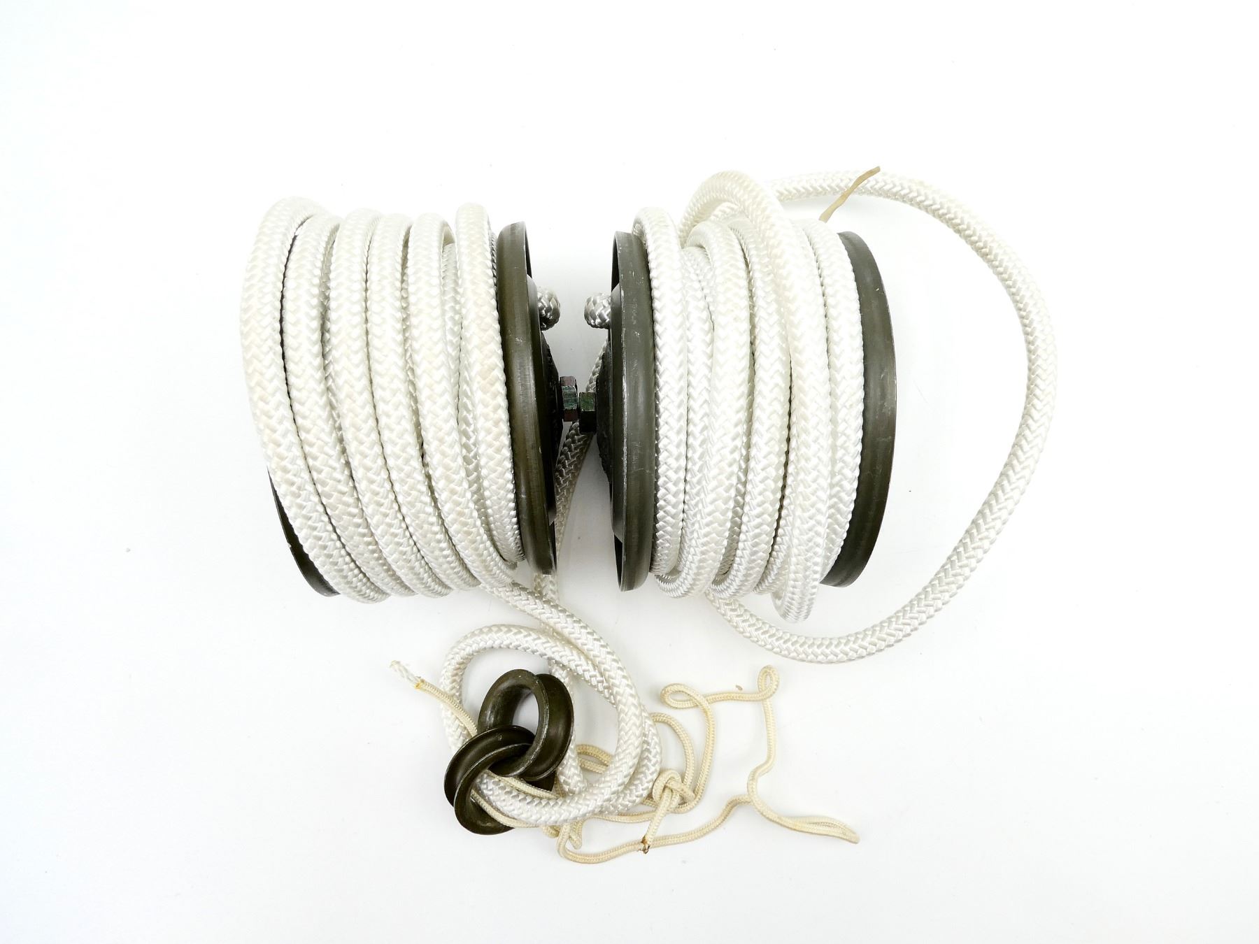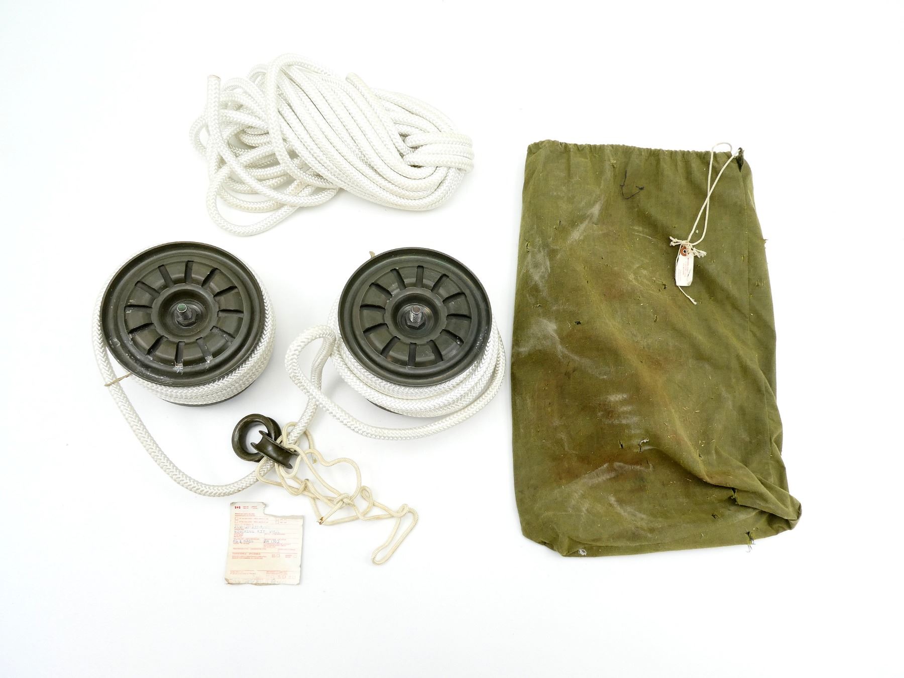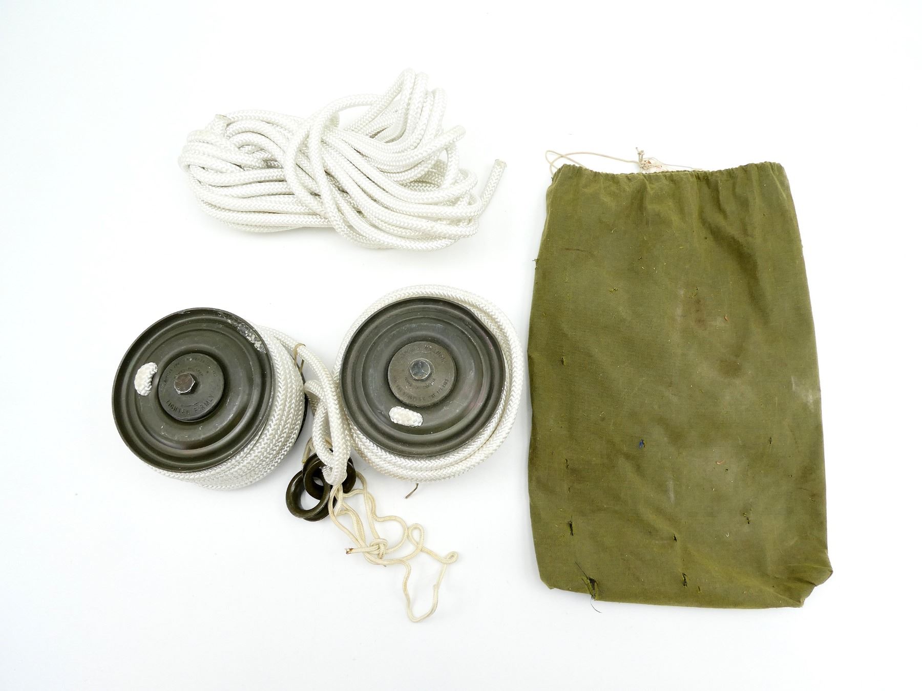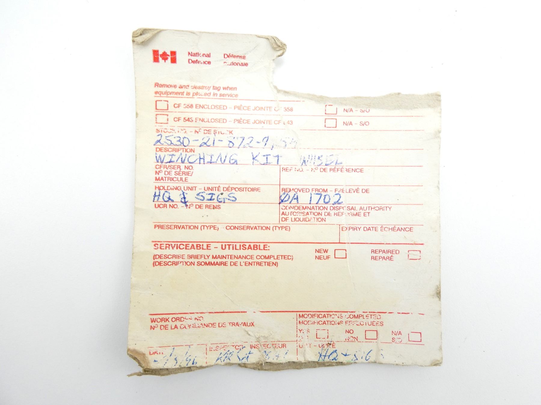(1) WINCH KIT, UN-TESTED, TWO GREEN PAINTED METAL WHEELS / SPOOLS WITH 3/4" ROPE ATTACHED, WHEELS MARKED: "MADE IN CANADA" ETC., EXTRA LENGTH OF 3/4" ROPE WITH KIT, GREEN NYLON DRAW STRING CARRY BAG WITH TAG, TAG FELL OFF BUT WITH KIT, TAG MARKED: "2530-21-872-9?54, WINCHING KIT WHEEL, DATE 5/3/96" ETC., WINCHING WHEELS APPROX. 8 1/8" DIA. SEE PHOTOS. *ADDITIONAL SHIPPING CHARGES MAY APPLY*