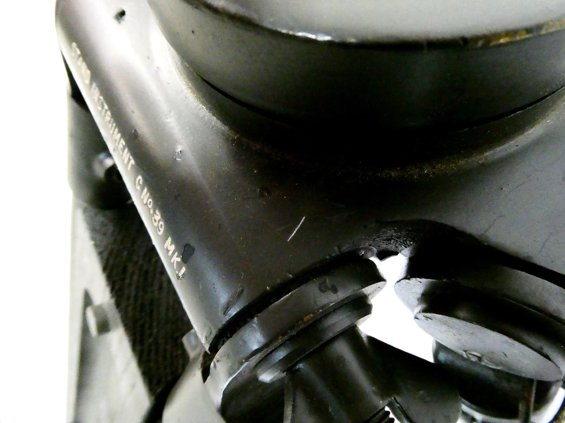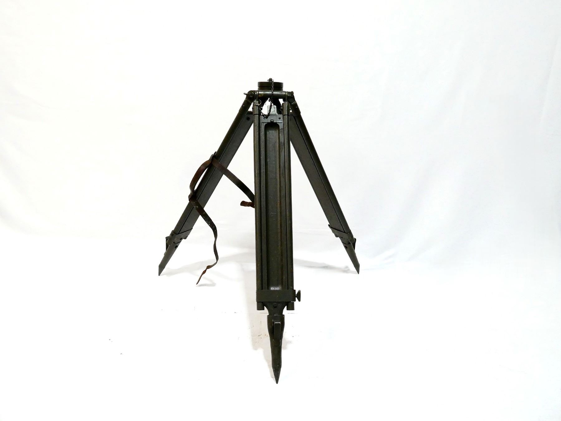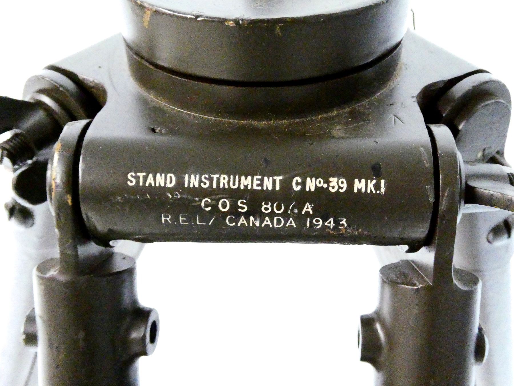 (1) GREEN PAINTED METAL & WOOD CONSTRUCTED TRIPOD, TOP MARKED: "STAND INSTRUMENT C NO.39 MK.I, COS 807A, R.E.L. / CANADA 1943", VARIOUS POSSIBLE PART NUMBERS ON SCREWS, BRACKETS, WASHERS, ETC., WITH LEATHER CARRY STRAP / HANDLE, NUMBERED: "503389" & "503388", AFFIXED TO TRIPOD WITH BRASS SCREWS, OAL APPROX. 39.5". SEE PHOTOS.