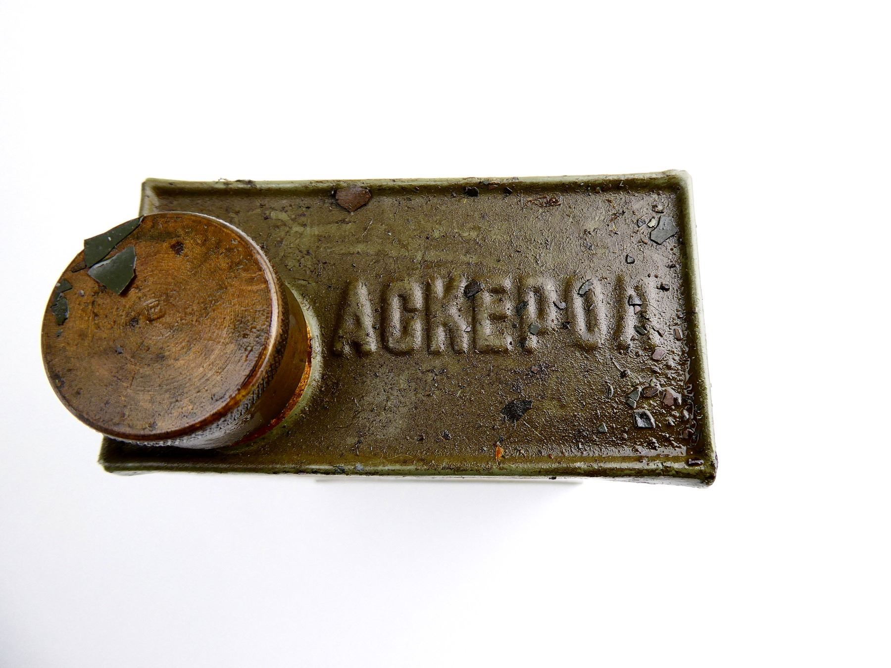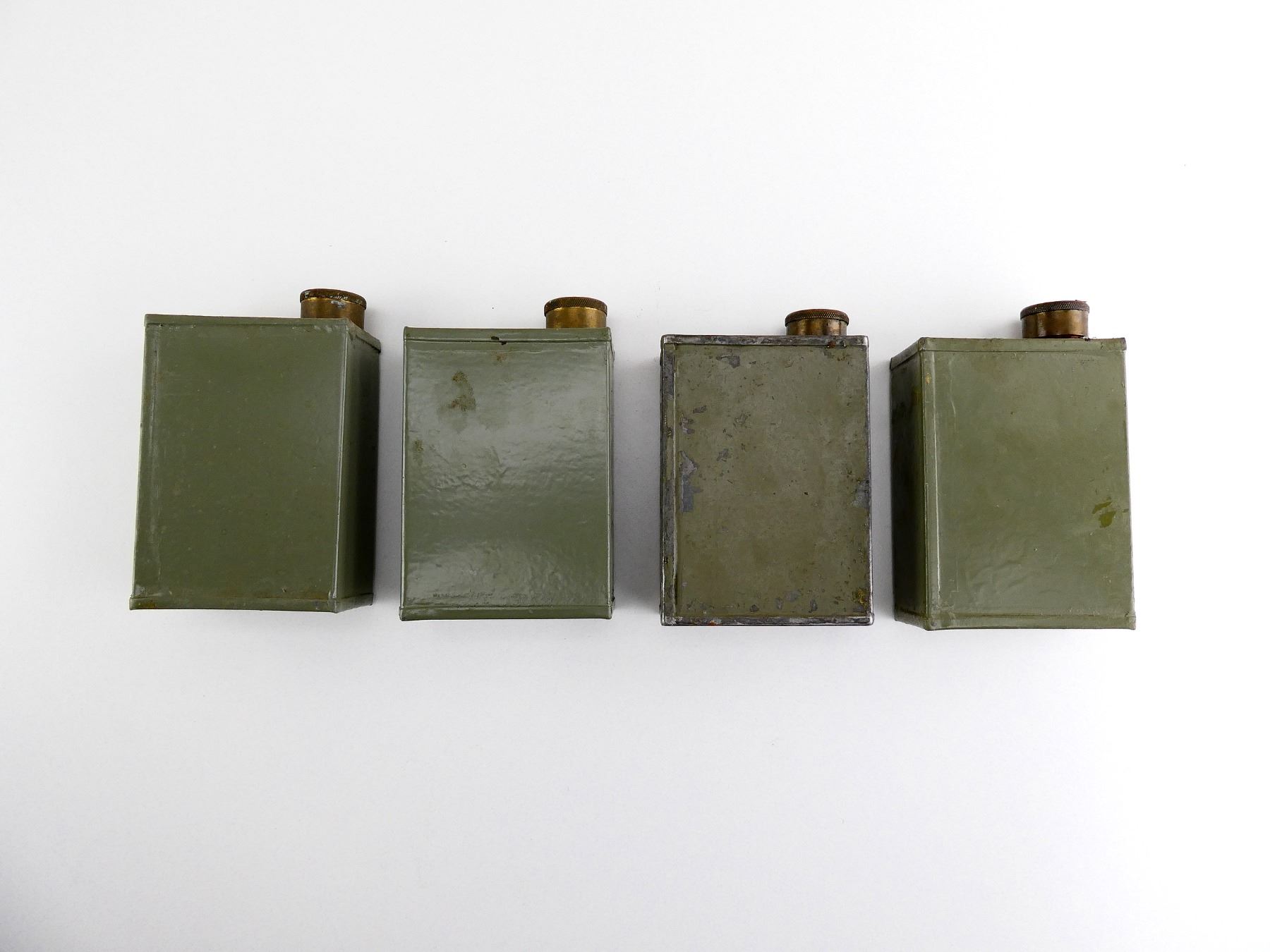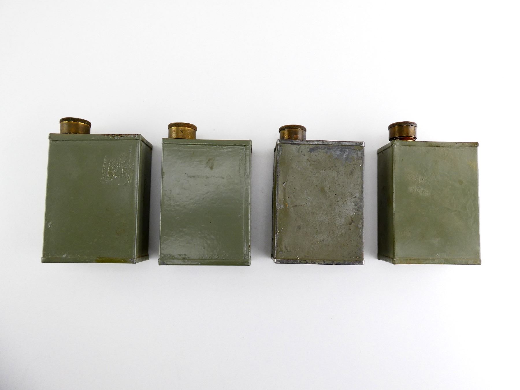 LOT INCLUDES; (4) GREEN PAINTED METAL OILERS, VARIOUS MARKINGS, BRASS CAPS, SHOWS AGE / WEAR, SOME HAVE CHIPPED PAINT, APPROX. 4 1/8" X 3" X 1 5/8". SEE PHOTOS.