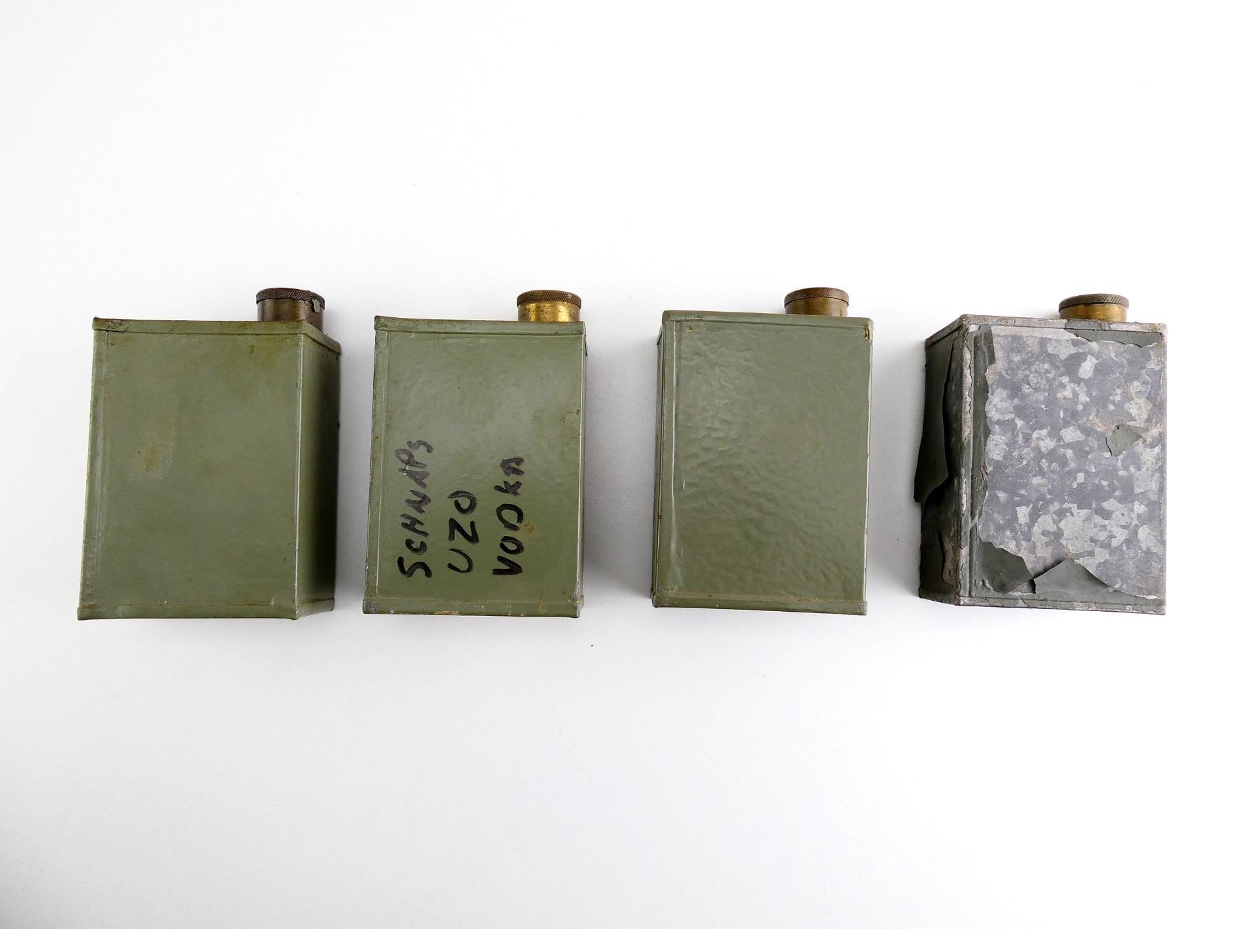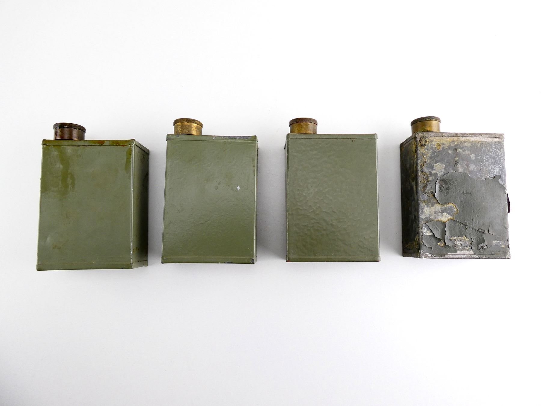 LOT INCLUDES; (4) GREEN PAINTED METAL OILERS, VARIOUS MARKINGS, BRASS CAPS, SHOWS AGE / WEAR, SOME HAVE CHIPPED PAINT, APPROX. 4 1/8" X 3" X 1 5/8". SEE PHOTOS.