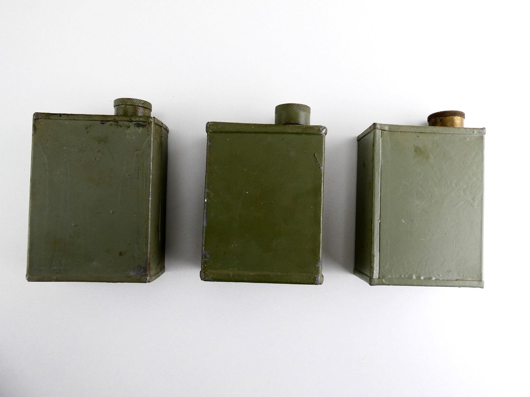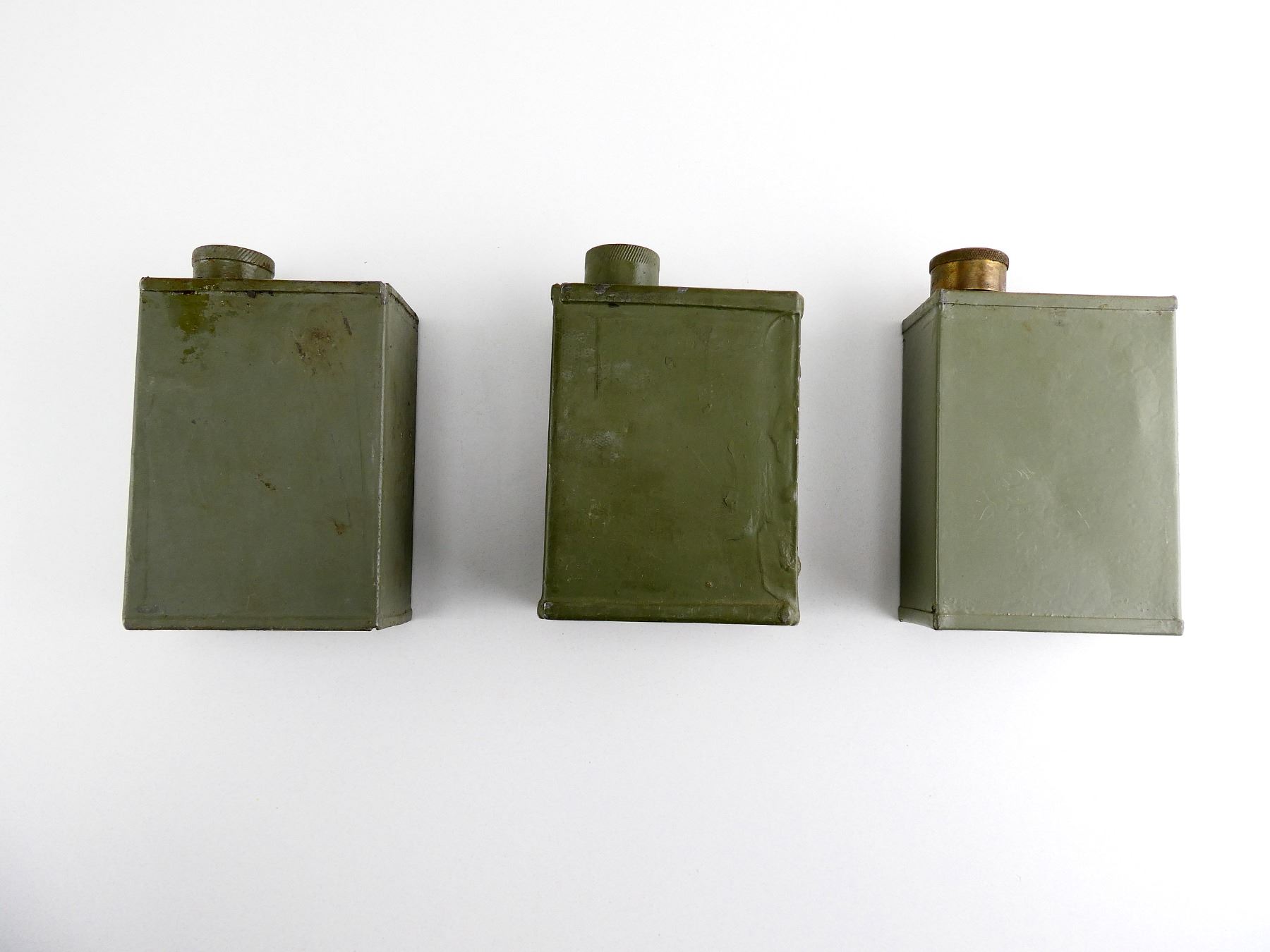 LOT INCLUDES; (3) GREEN PAINTED METAL OILERS, VARIOUS MARKINGS, BRASS CAPS, SHOWS AGE / WEAR, SOME HAVE CHIPPED PAINT, APPROX. 4 1/8" X 3" X 1 5/8". SEE PHOTOS.