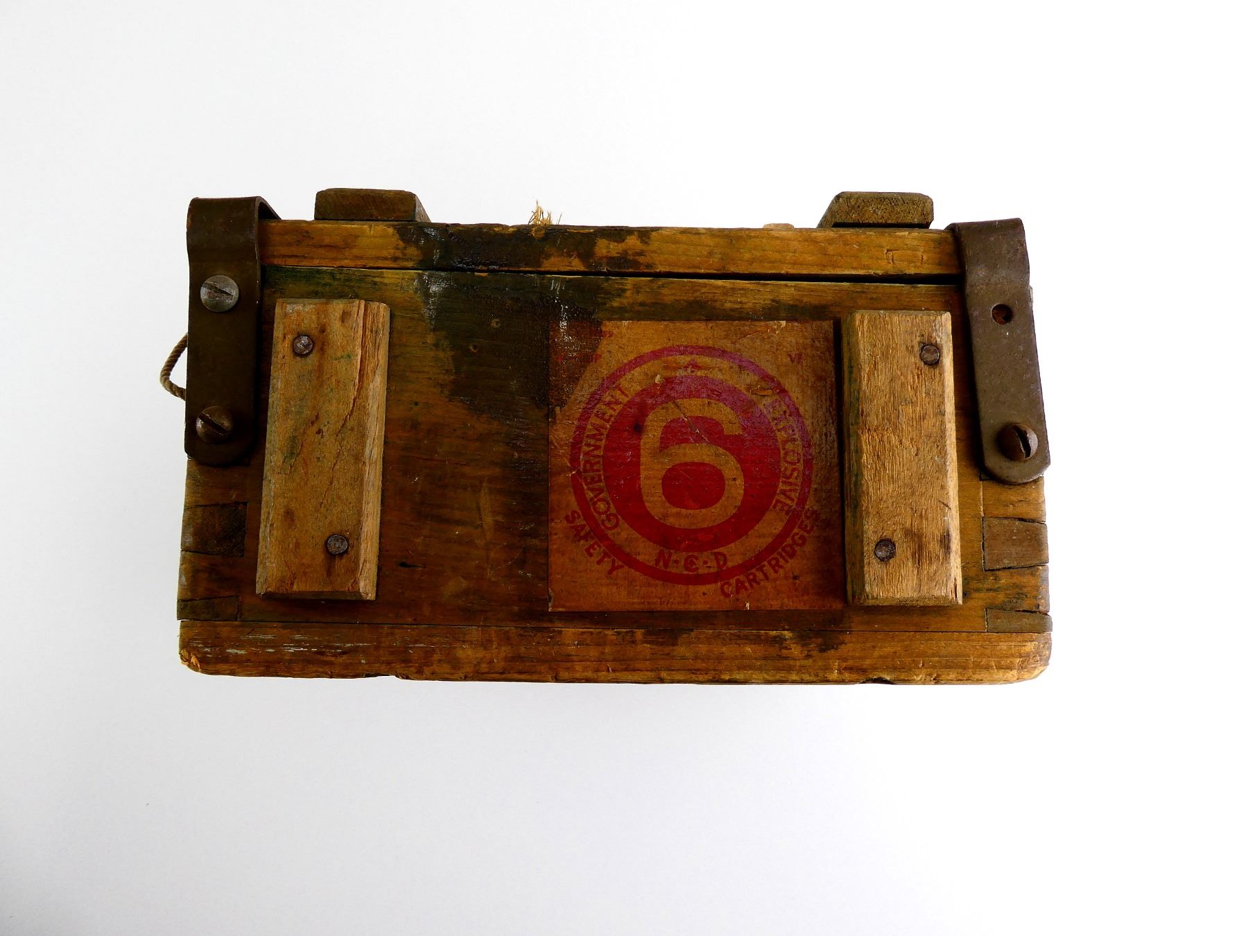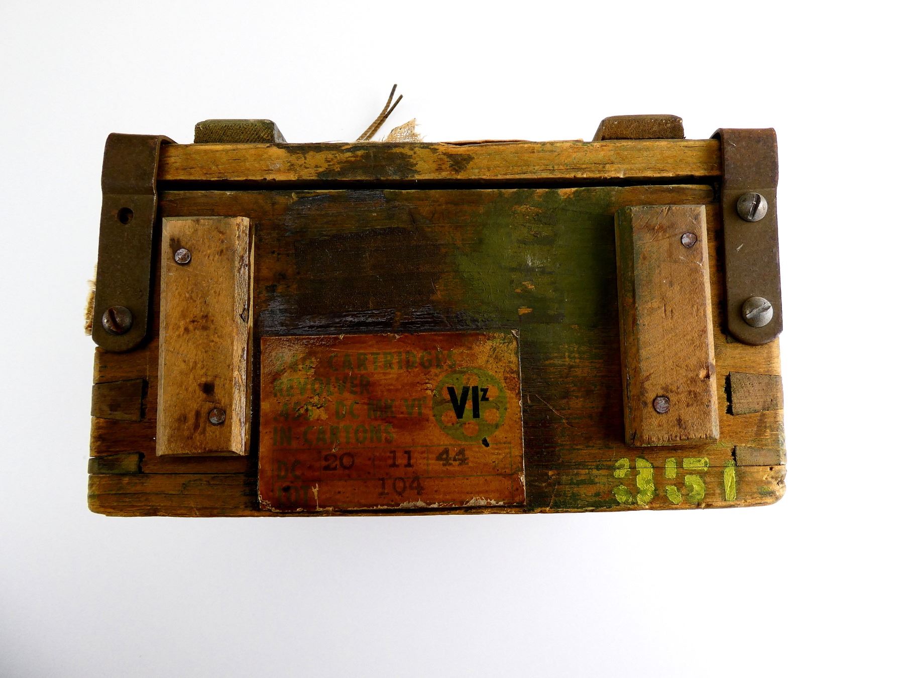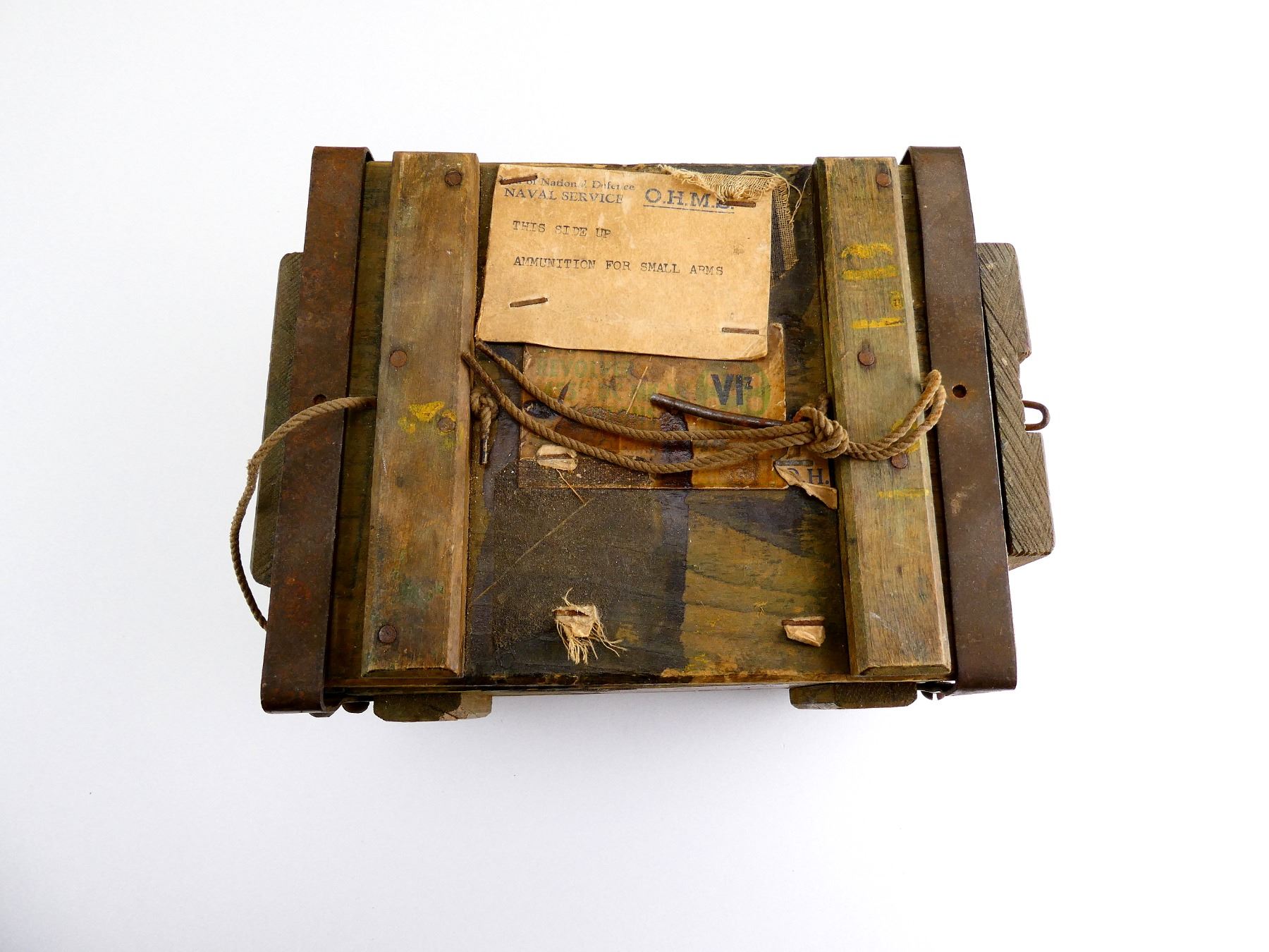 (1) WOODEN AMMO CRATE WITH LID & BLACK PAINTED METAL INSERT, CRATE MARKED: "DEPT. OF NATIONAL DEFENCE, NAVAL SERVICE", "240 CARTRIDGES, REVOLVER, .455" DC MK VIZ, IN CARTONS, 20 11 44" ETC., C-BROAD ARROW, "SM CO 1944", APPROX. 9.25" X 7" X 5". SEE PHOTOS.