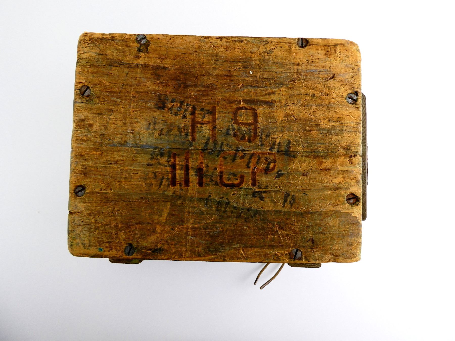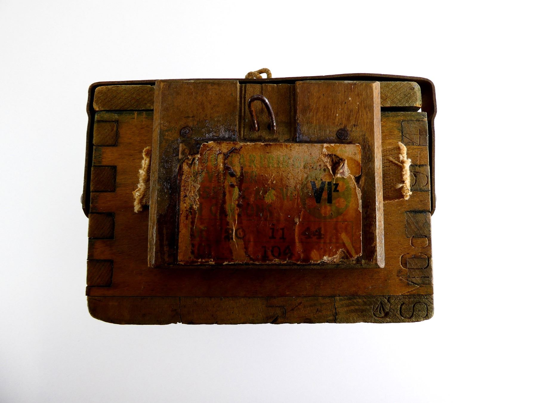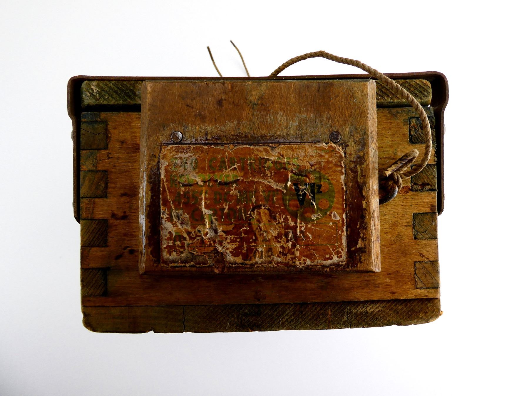 (1) WOODEN AMMO CRATE WITH LID & BLACK PAINTED METAL INSERT, CRATE MARKED: "DEPT. OF NATIONAL DEFENCE, NAVAL SERVICE", "240 CARTRIDGES, REVOLVER, .455" DC MK VIZ, IN CARTONS, 20 11 44" ETC., C-BROAD ARROW, "SM CO 1944", APPROX. 9.25" X 7" X 5". SEE PHOTOS.
