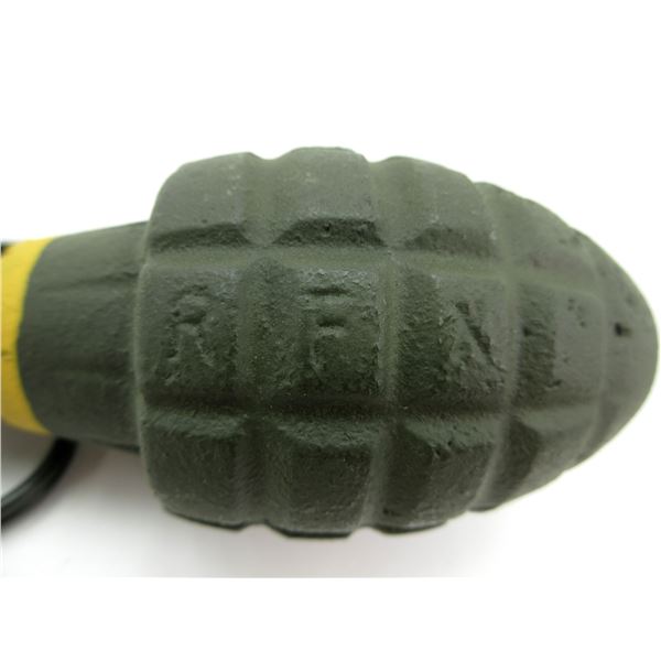 (1) CAST STEEL GRENADE WITH DUMMY FUZE, GRENADE MARKED: "RFX", FUZE HAS NO VISIBLE MARKINGS, APPROX. 2 1/8" DIA. & OAL APPROX. 4.5". SEE PHOTOS.