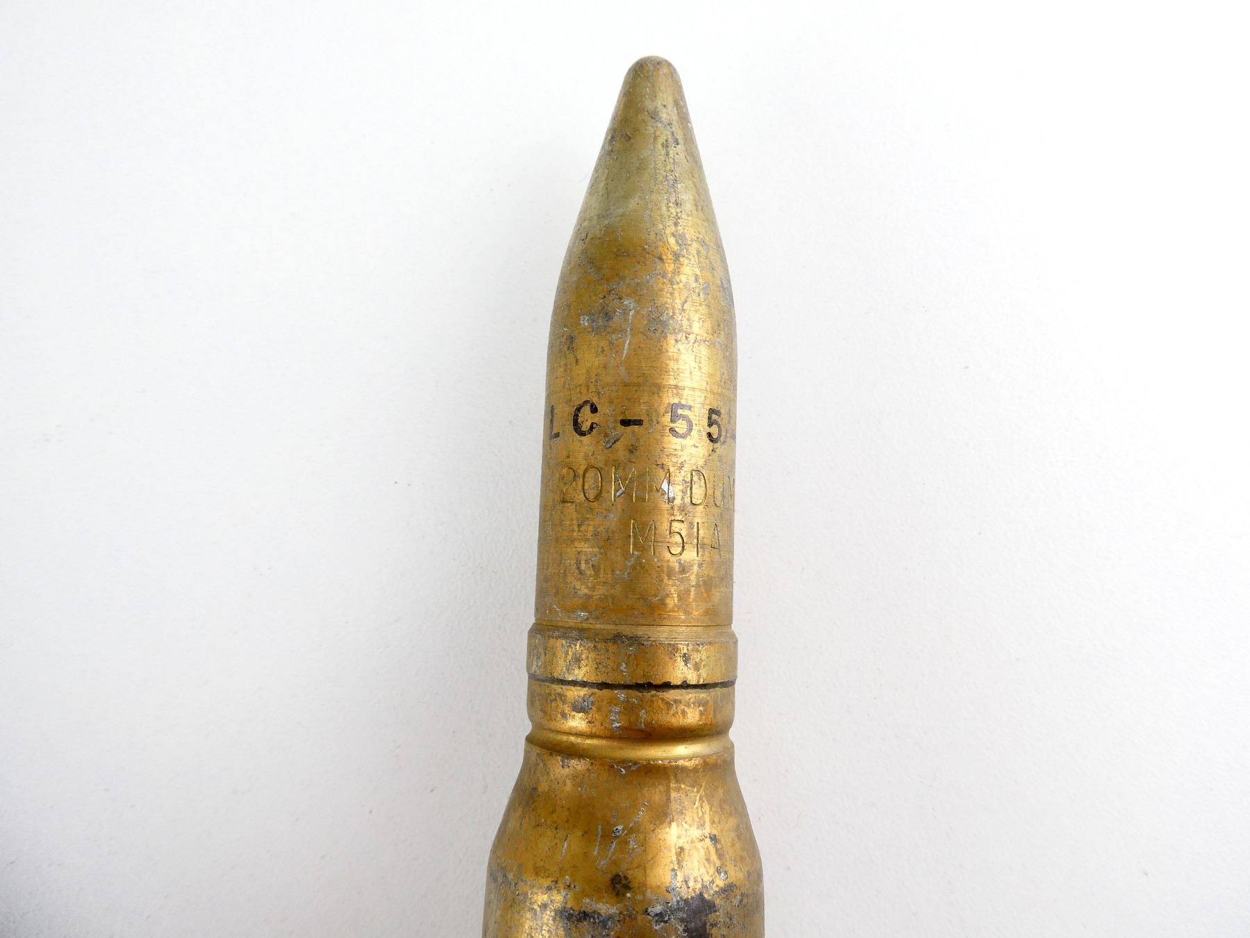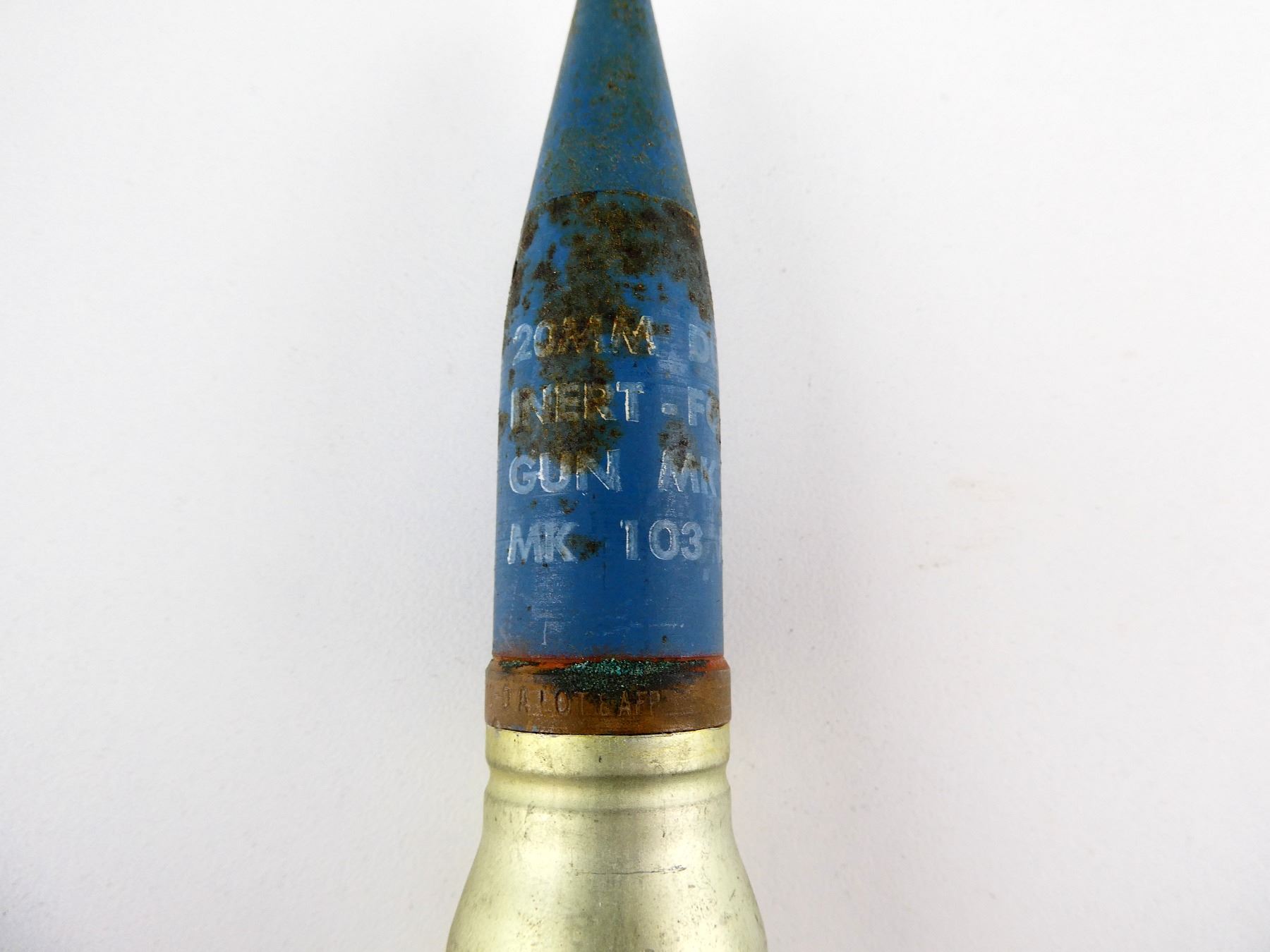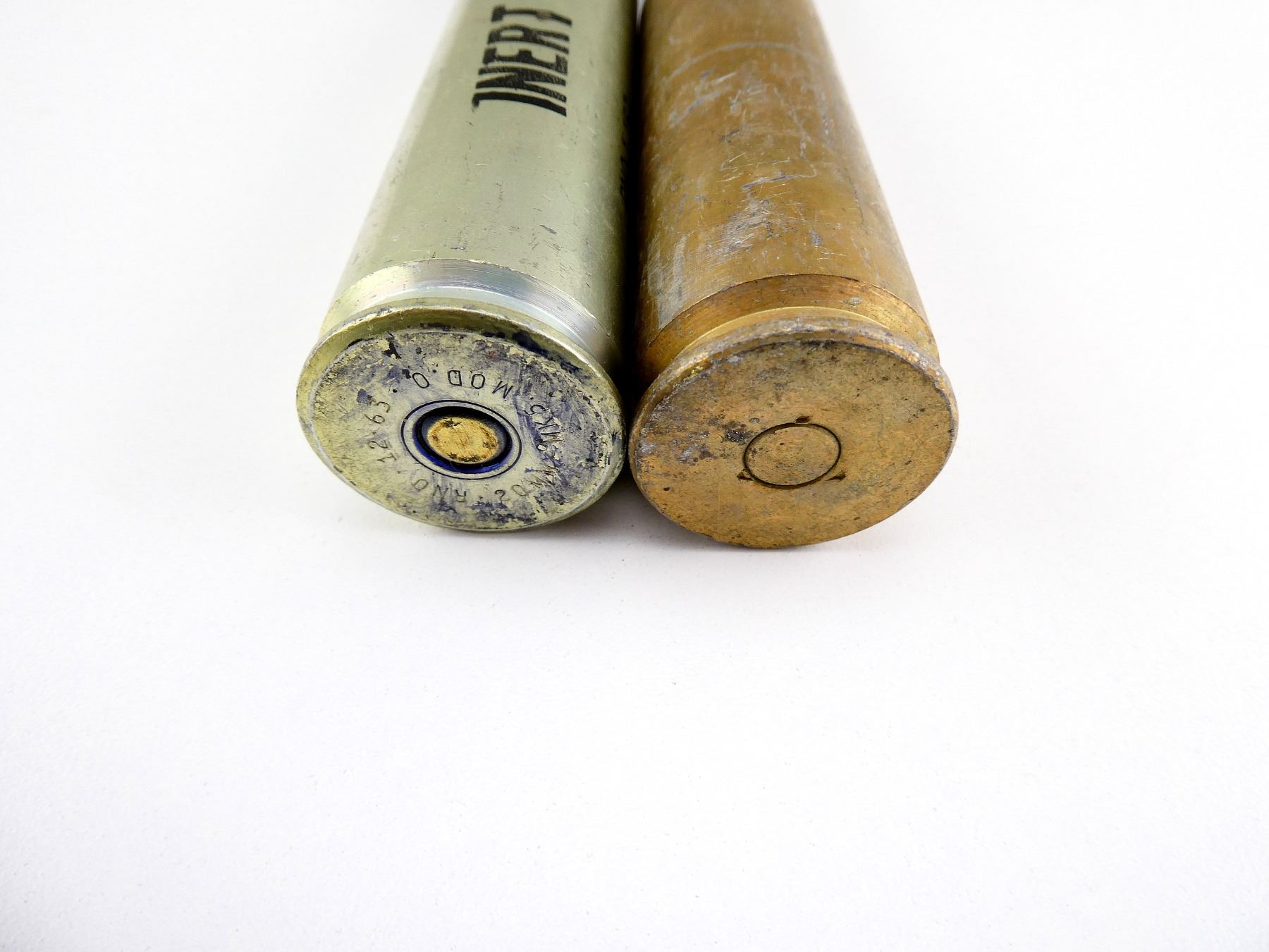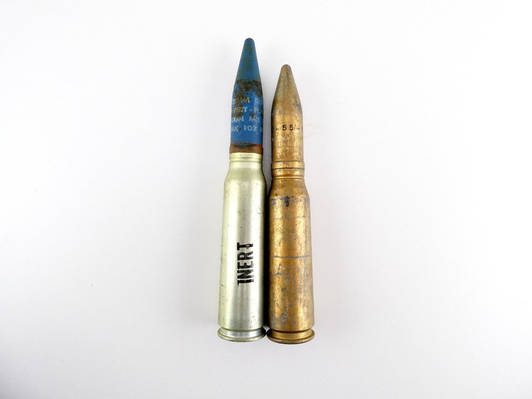 LOT INCLUDES; (1) 20X110MM DUMMY ROUND, BLUE PAINTED STEEL PROJECTILE, MARKED: "20MM DUMMY, INERT - FOR GUN MK 12, MK 103 MOD 0", COPPER DRIVING BAND MARKED: "20-MM MK. 11-0 A LOT 8AFP", CASING BODY MARKED: "INERT, RNO-1-157", BOTTOM MARKED: "20MM-MK5. MOD. 0, RNO . 12 . 63 .", APPROX. 1 1/8" DIA., OAL APPROX. 7.25" & (1) 20X102MM DUMMY ROUND, GOLD COLOURED STEEL PROJECTILE, MARKED: "LC-55-5, 20MM DUMMY, M51A1", GOLD COLOURED DRIVING BAND, APPROX. 1 1/8" DIA. & OAL APPROX. 6 5/8". SEE PHOTOS.