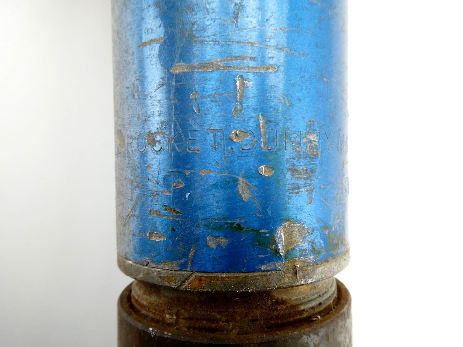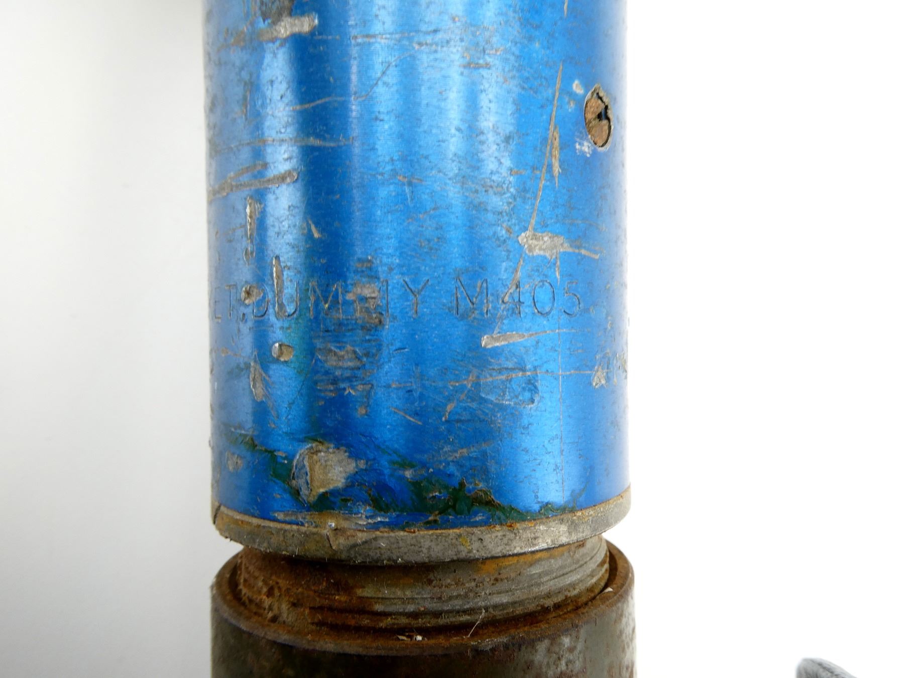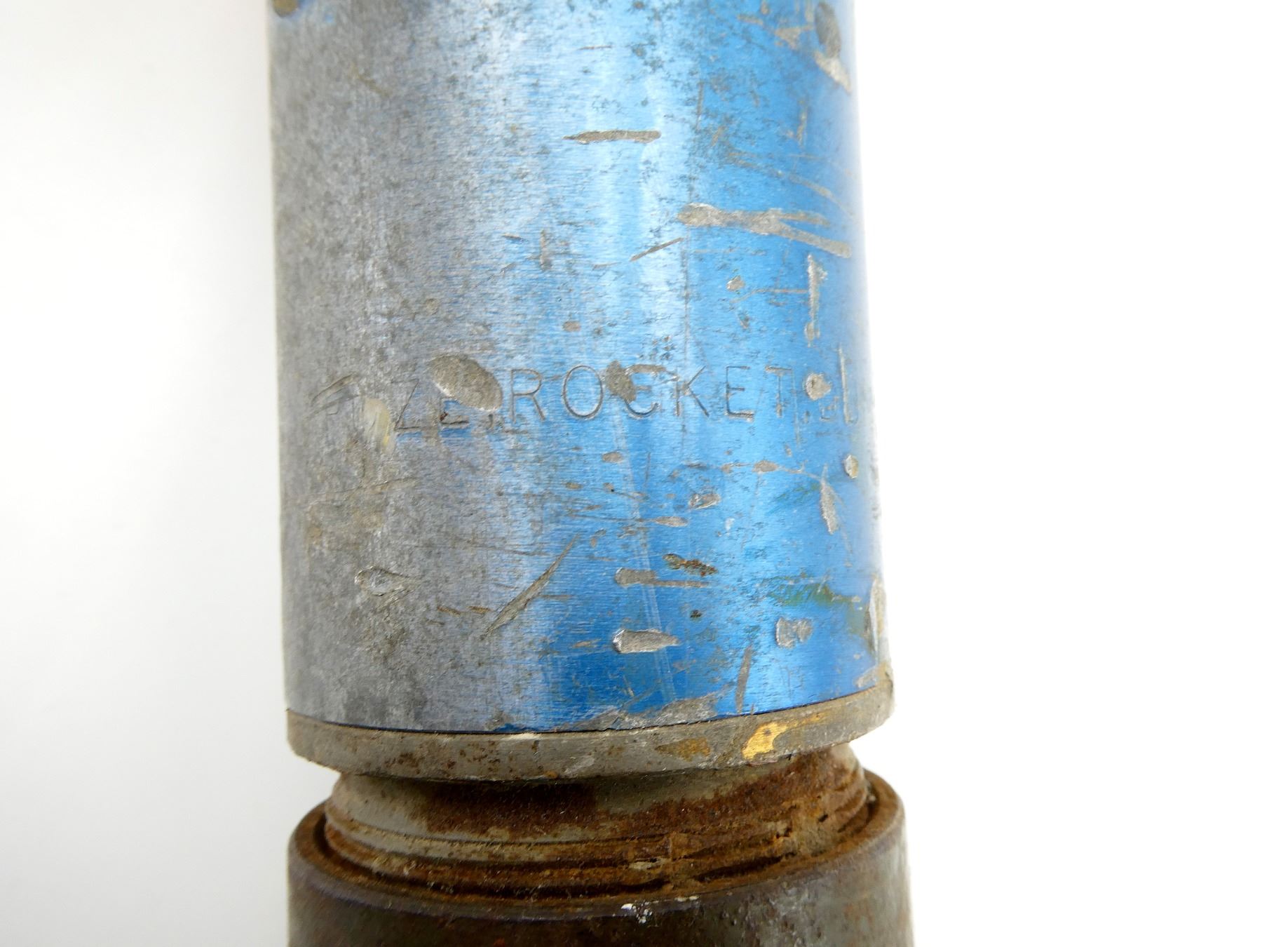 (1) FITS THE M20 SUPER BAZOOKA, BLUE PAINTED ROCKET, MARKED: "ROCKET, PRAC 3.5 IN M29A2, CA (CANADIAN ARSENALS) J-?, TEMP" WITH MAPLE LEAF PROOF MARK, "??ZE ROCKET, DUMMY M405", WITH TAIL FINS, APPROX. 3.5" DIA. & OAL APPROX. 24". SEE PHOTOS.