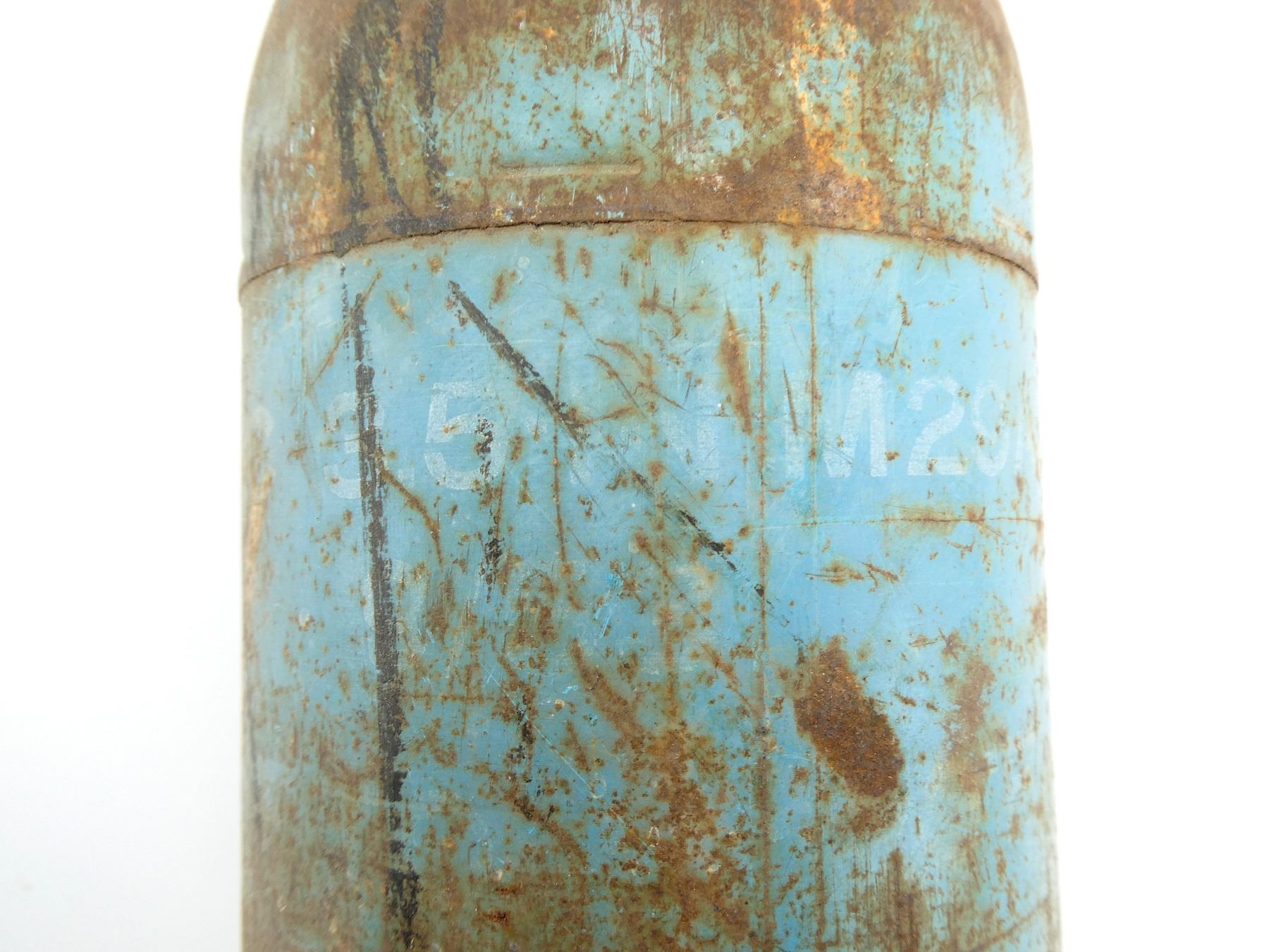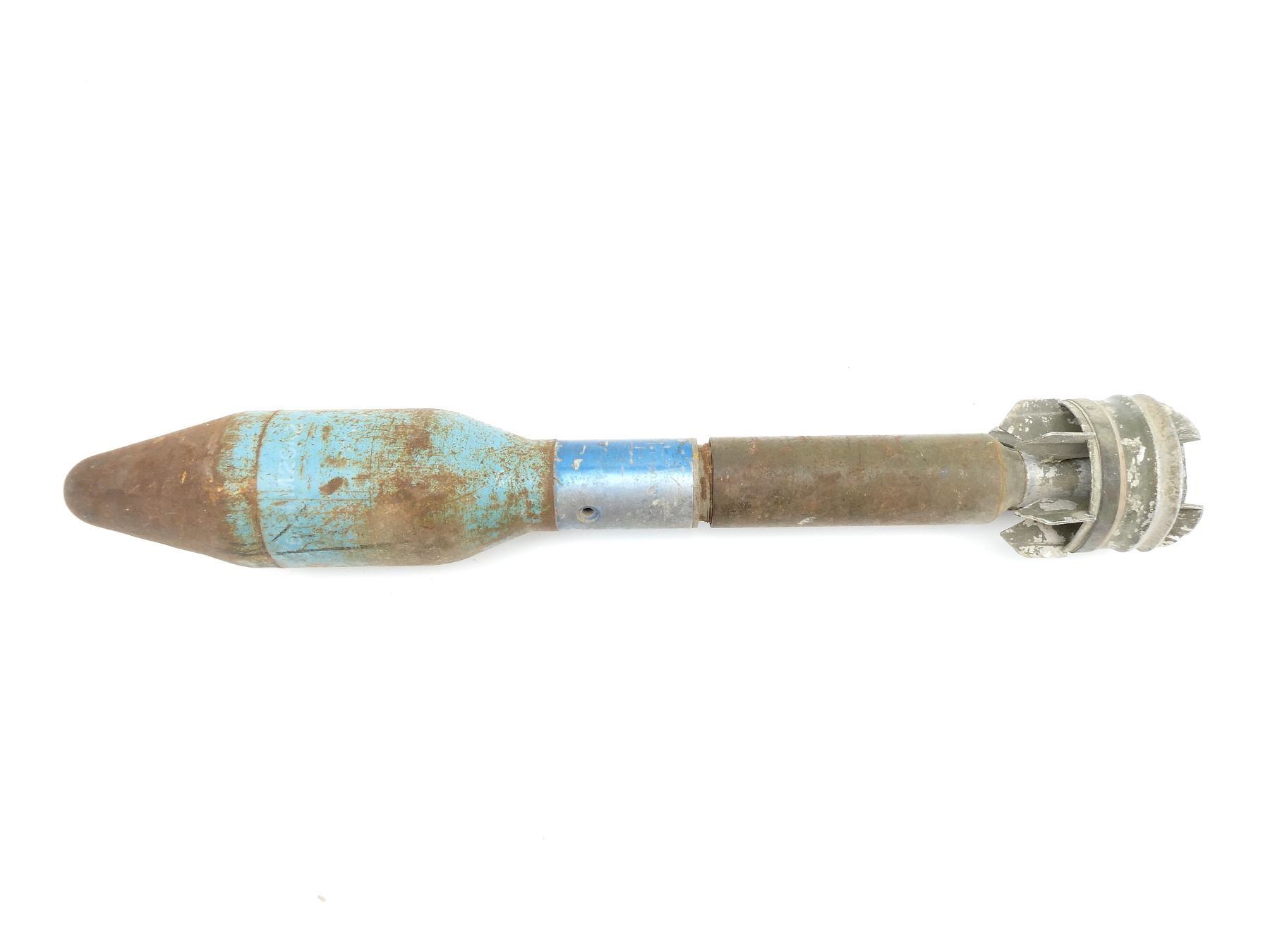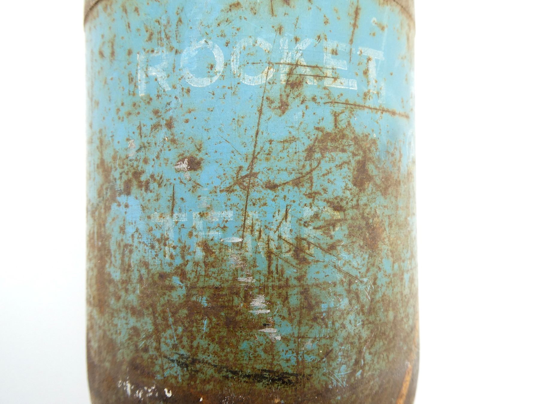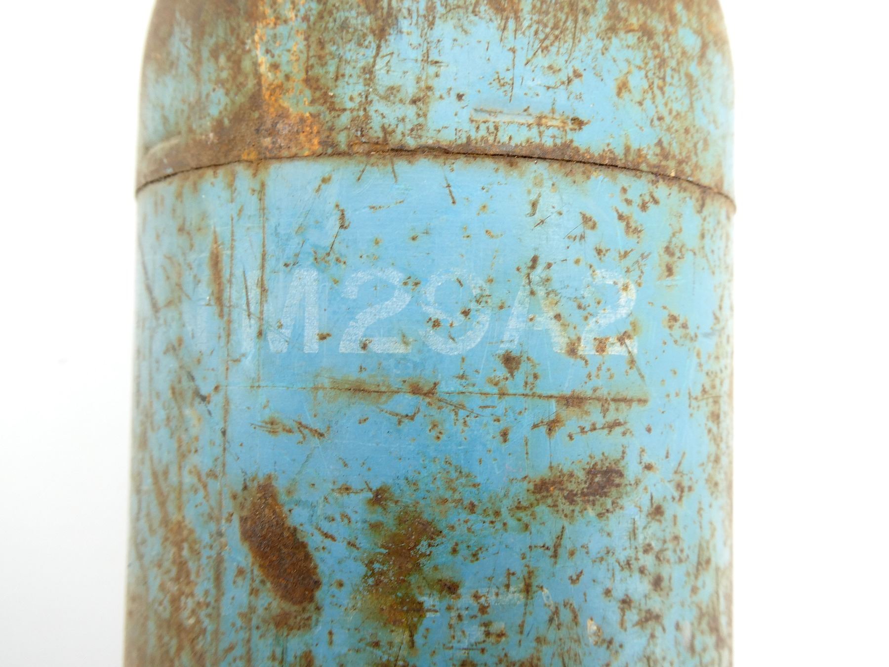 (1) FITS THE M20 SUPER BAZOOKA, BLUE PAINTED ROCKET, MARKED: "ROCKET, PRAC 3.5 IN M29A2, CA (CANADIAN ARSENALS) J-?, TEMP" WITH MAPLE LEAF PROOF MARK, "??ZE ROCKET, DUMMY M405", WITH TAIL FINS, APPROX. 3.5" DIA. & OAL APPROX. 24". SEE PHOTOS.