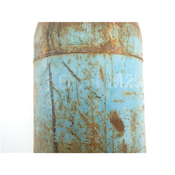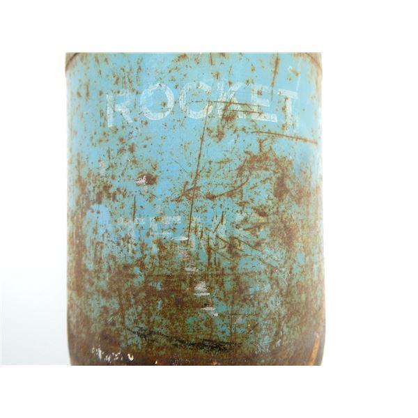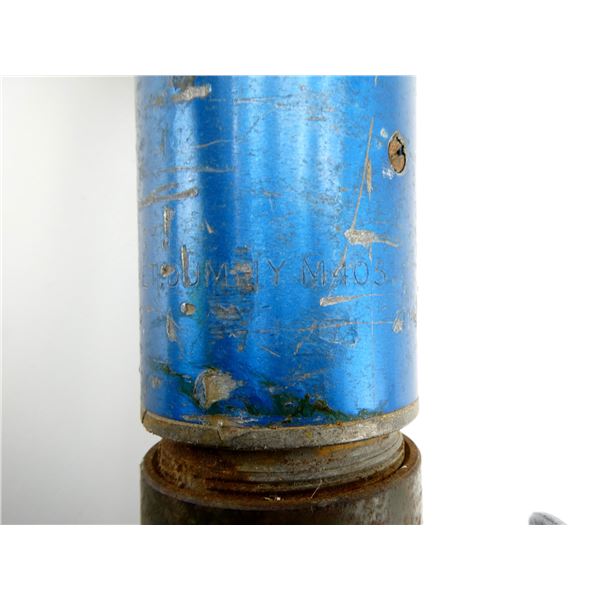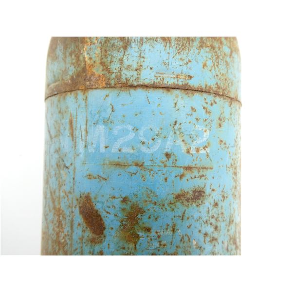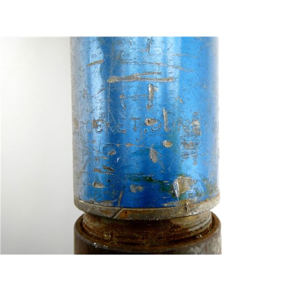 (1) FITS THE M20 SUPER BAZOOKA, BLUE PAINTED ROCKET, MARKED: "ROCKET, PRAC 3.5 IN M29A2, CA (CANADIAN ARSENALS) J-?, TEMP" WITH MAPLE LEAF PROOF MARK, "??ZE ROCKET, DUMMY M405", WITH TAIL FINS, APPROX. 3.5" DIA. & OAL APPROX. 24". SEE PHOTOS.