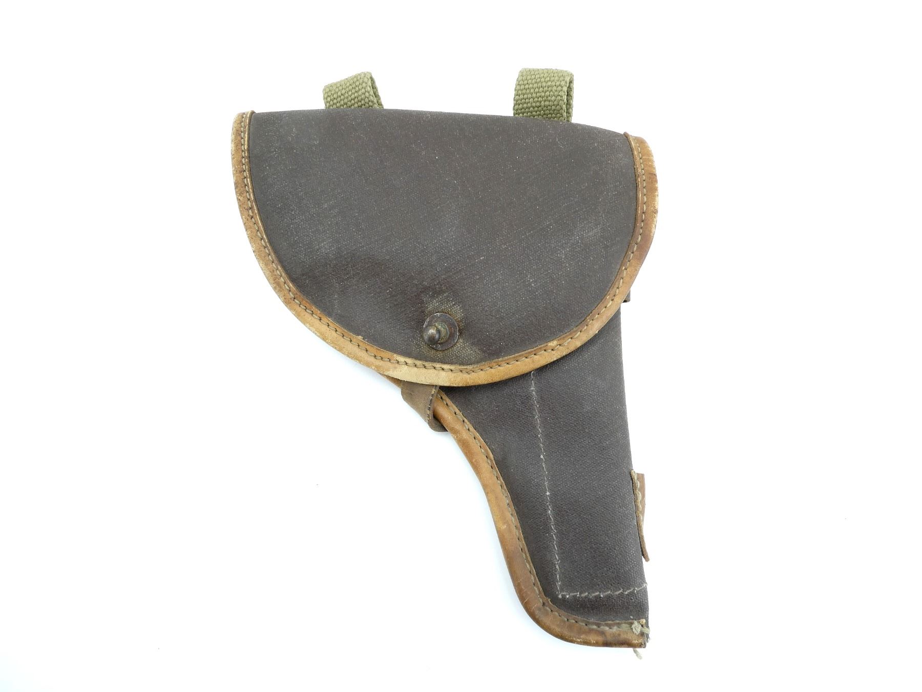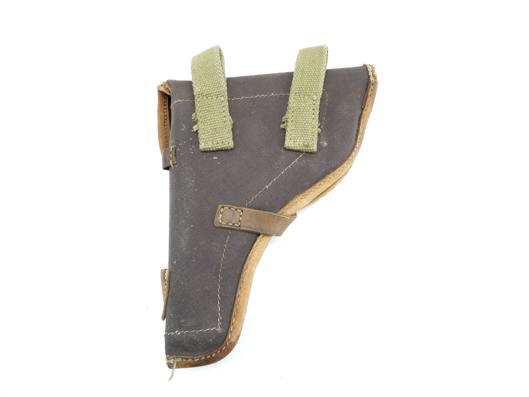 (1) BROWN CANVAS HOLSTER WITH INTERIOR POUCH, METAL FITTINGS, LEATHER CLOSE STRAP & GREEN CANVAS BELT LOOPS, NO VISIBLE MARKINGS. SEE PHOTOS.