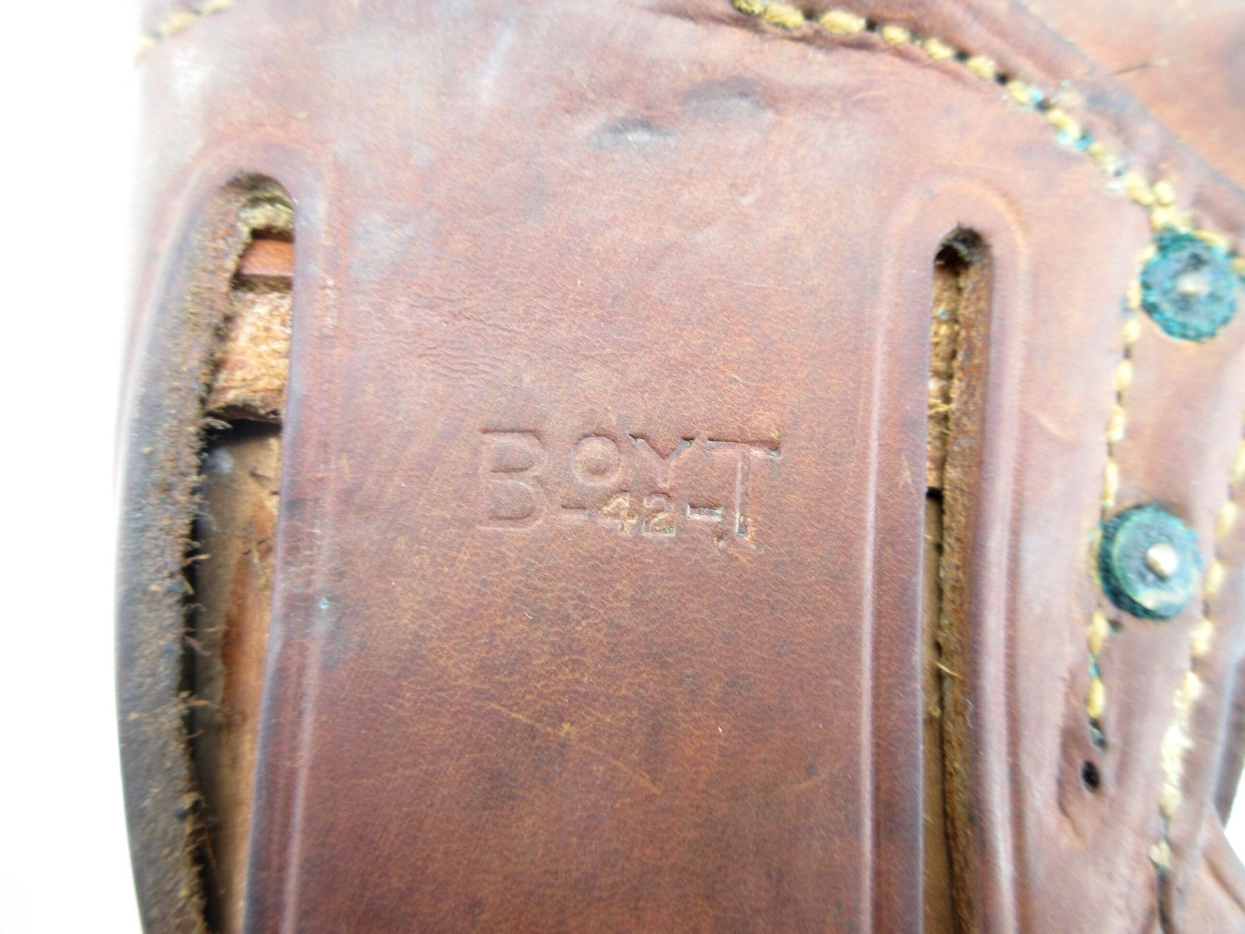 (1) FITS 1911 .45 ACP PISTOLS, BROWN LEATHER WITH BELT HOOKS & BELT LOOP, MARKED: "US" & "BOYT 42". SEE PHOTOS.