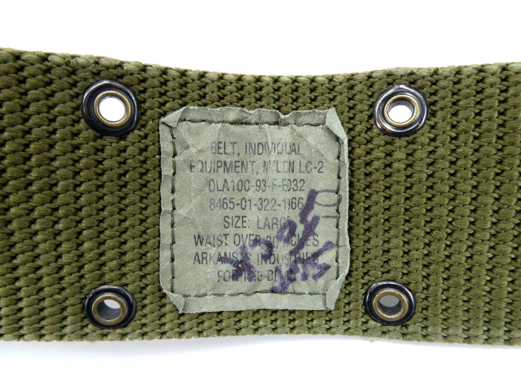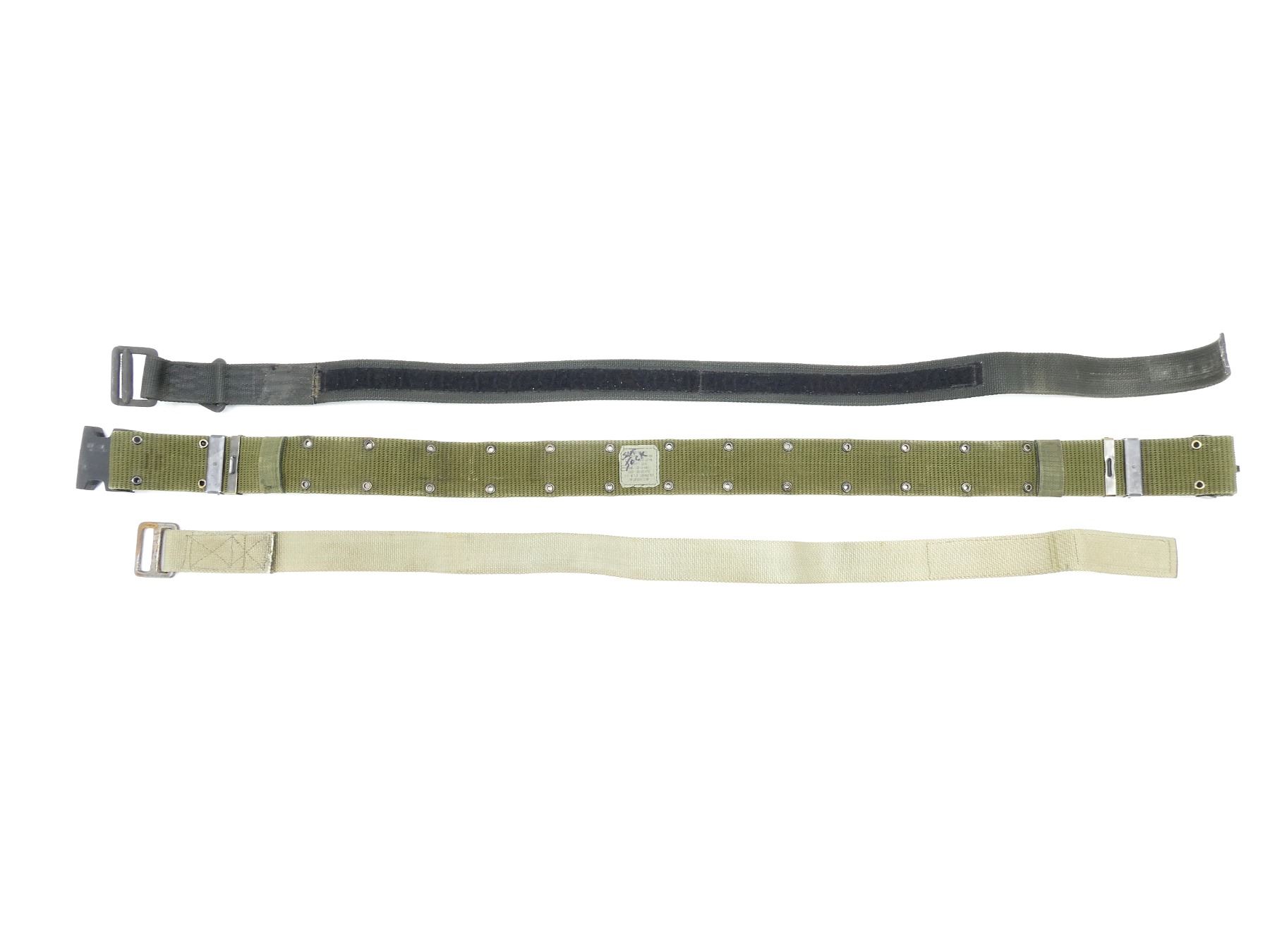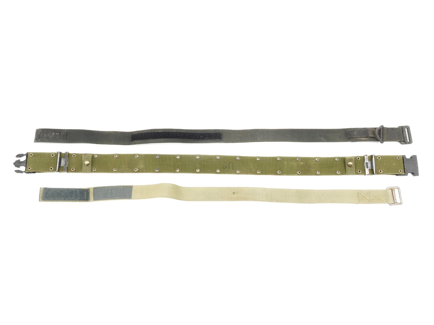 LOT INCLUDES; (1) INDIVIDUAL EQUIPMENT BELT, GREEN NYLON, METAL FITTINGS, PLASTIC BUCKLE, MARKED: "BELT, INDIVIDUAL, EQUIPMENT, NYLON LC-2, DLA100-93-F-ED32" ETC., SIZE LARGE, OAL APPROX. 45.5" & (2) RIGGER BELTS, BLACK / GREY NYLON, VELCRO, BLACK BELT WITH VARIOUS MARKINGS ON BUCKLES, OTHER HAS NO VISIBLE MARKINGS, OALS APPROX. 42.75" & 46". SEE PHOTOS.