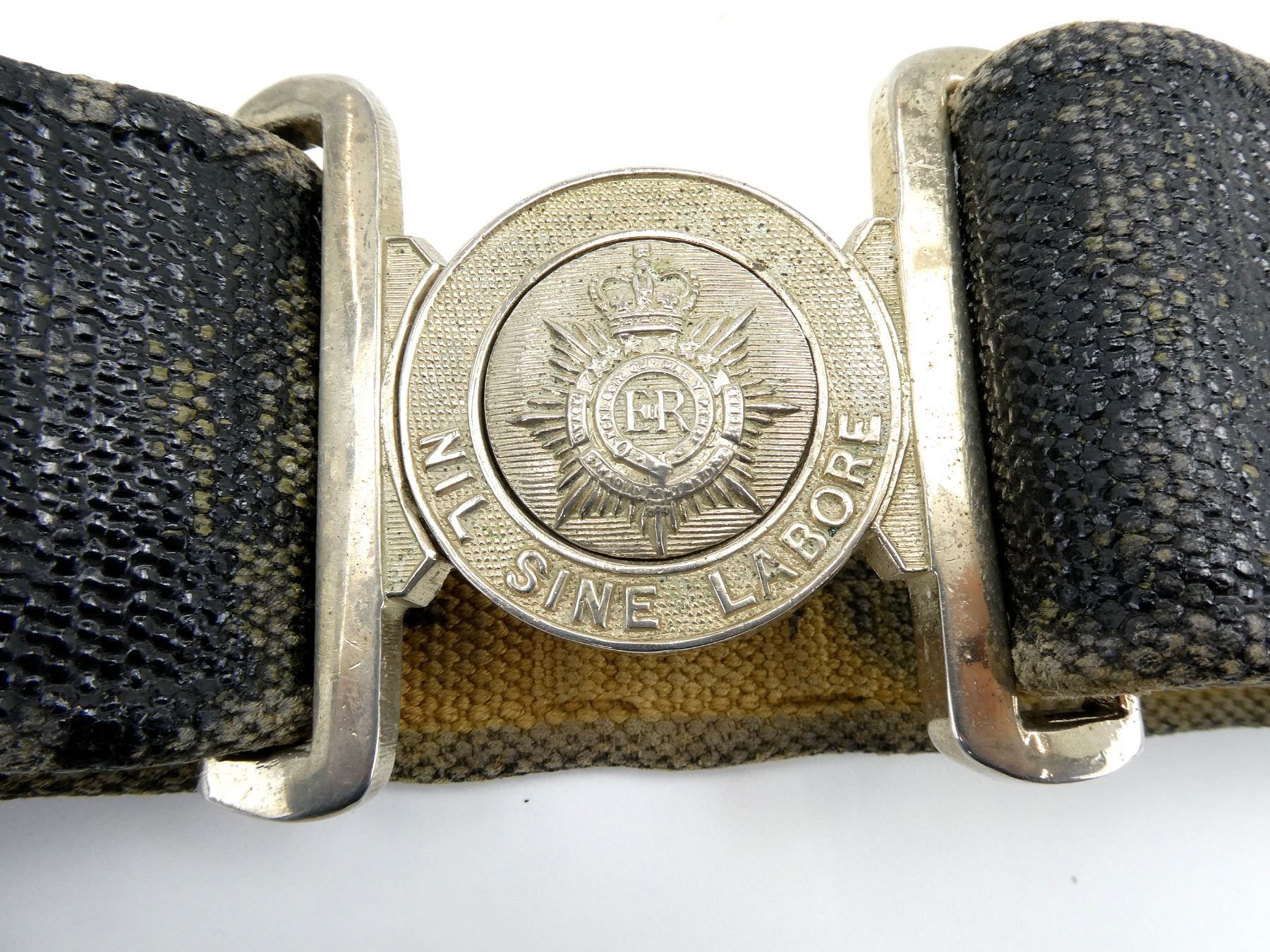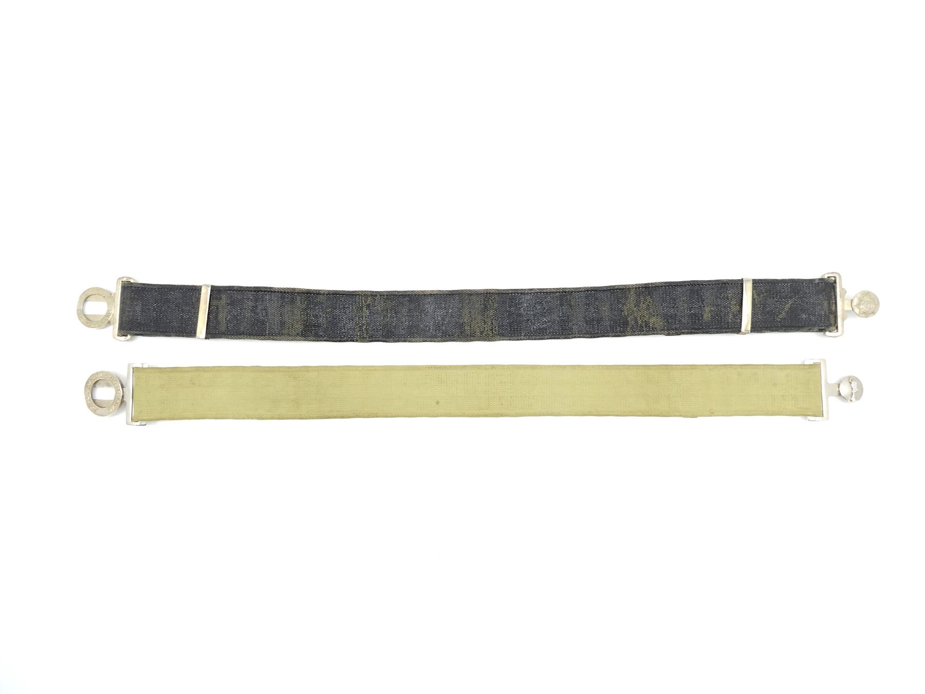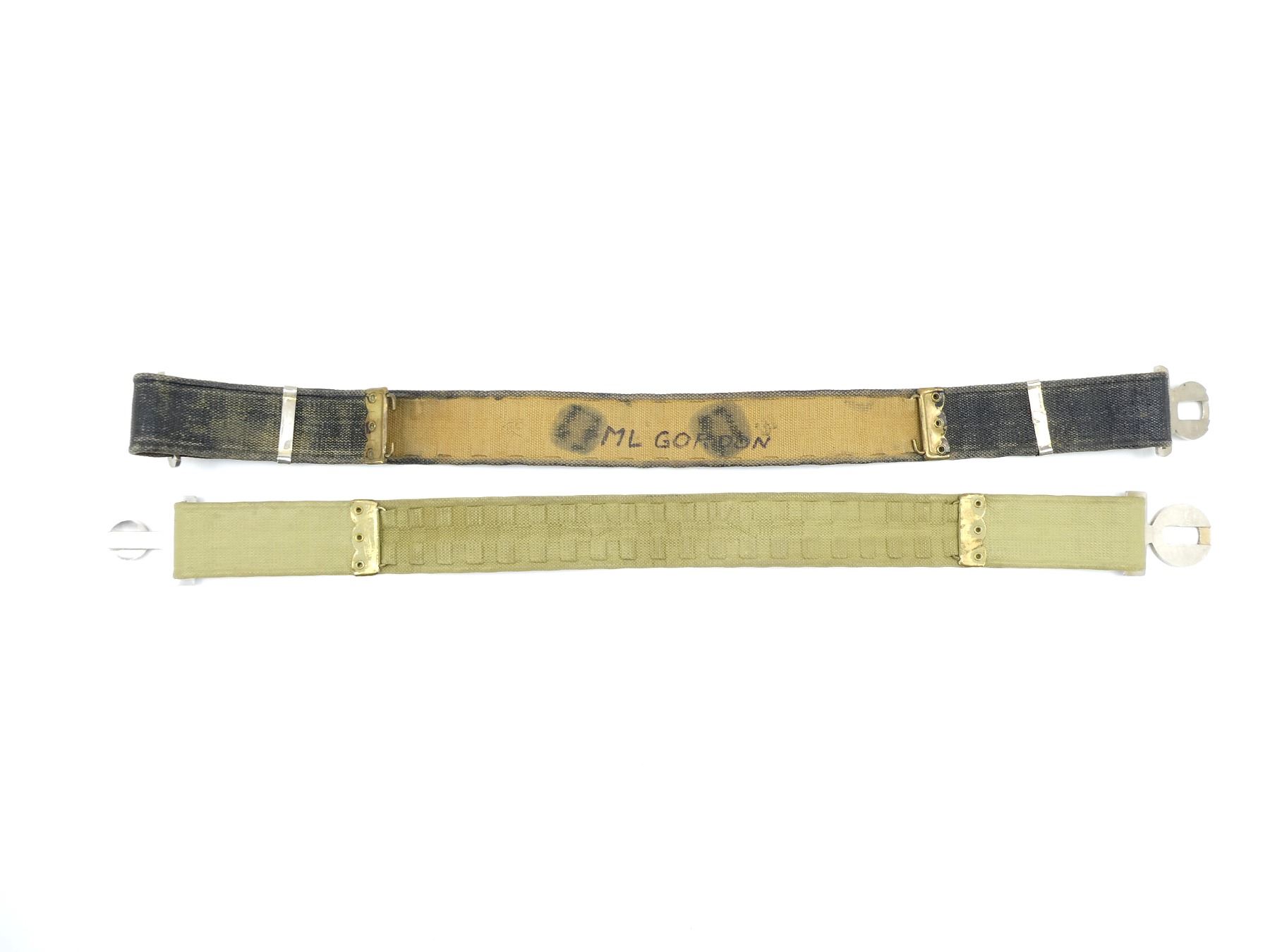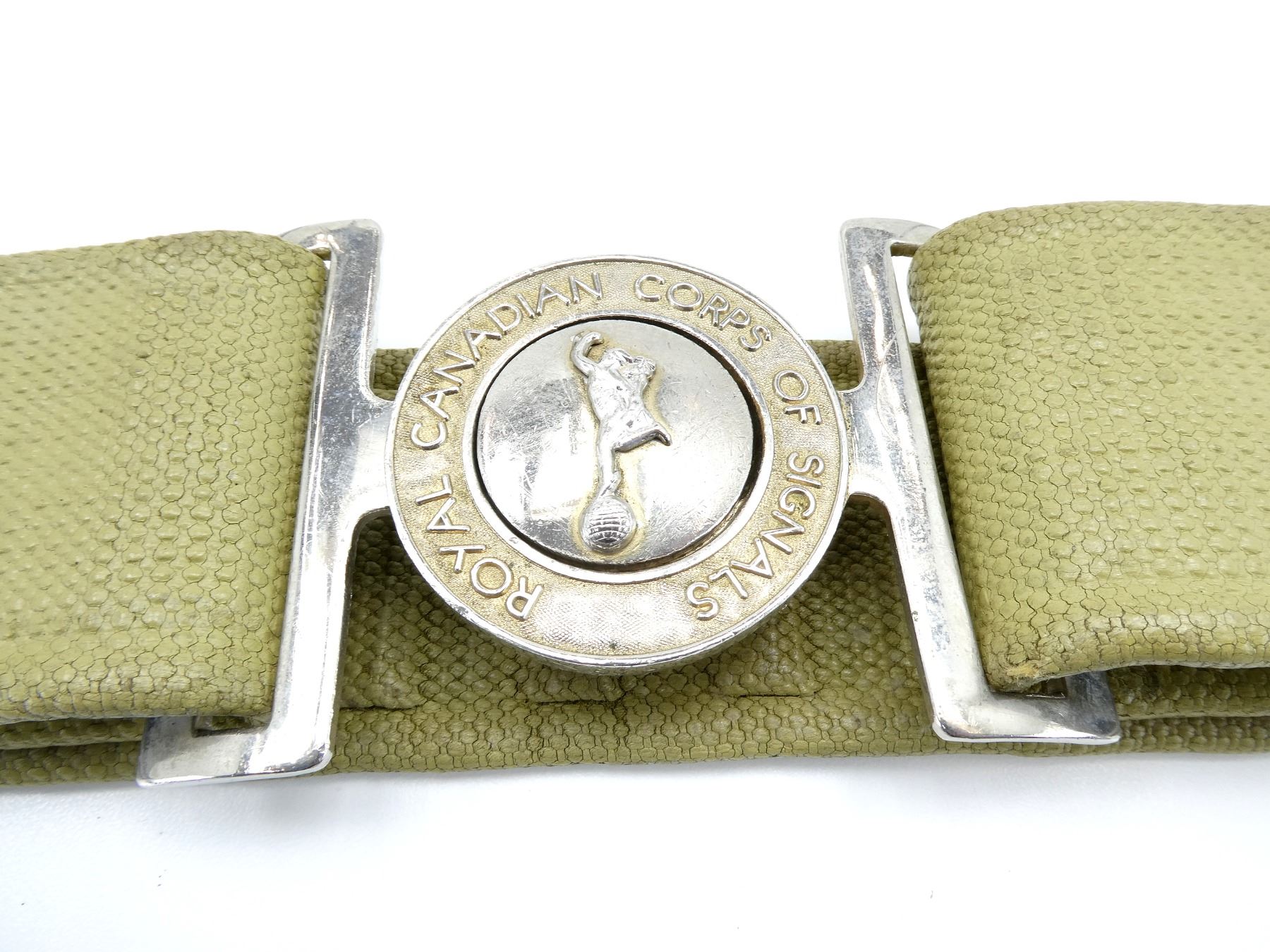 LOT INCLUDES; (1) ROYAL CANADIAN ARMY SERVICE CORPS BLACK PAINTED TAN P37 WEB BELT, ROYAL CANADIAN ARMY SERVICE CORPS BELT BUCKLE, VARIOUS MARKINGS, WITH QUEEN'S CROWN, VARIOUS HAND-WRITTEN MARKINGS ON BELT, OAL APPROX. 31", ADJUSTABLE & (1) ROYAL CANADIAN CORPS OF SIGNALS GREEN PAINTED P37 WEB BELT, ROYAL CANADIAN CORPS OF SIGNALS BELT BUCKLE, VARIOUS MARKINGS, NO VISIBLE MARKINGS ON BELT, OAL APPROX. 29.25", ADJUSTABLE. SEE PHOTOS.