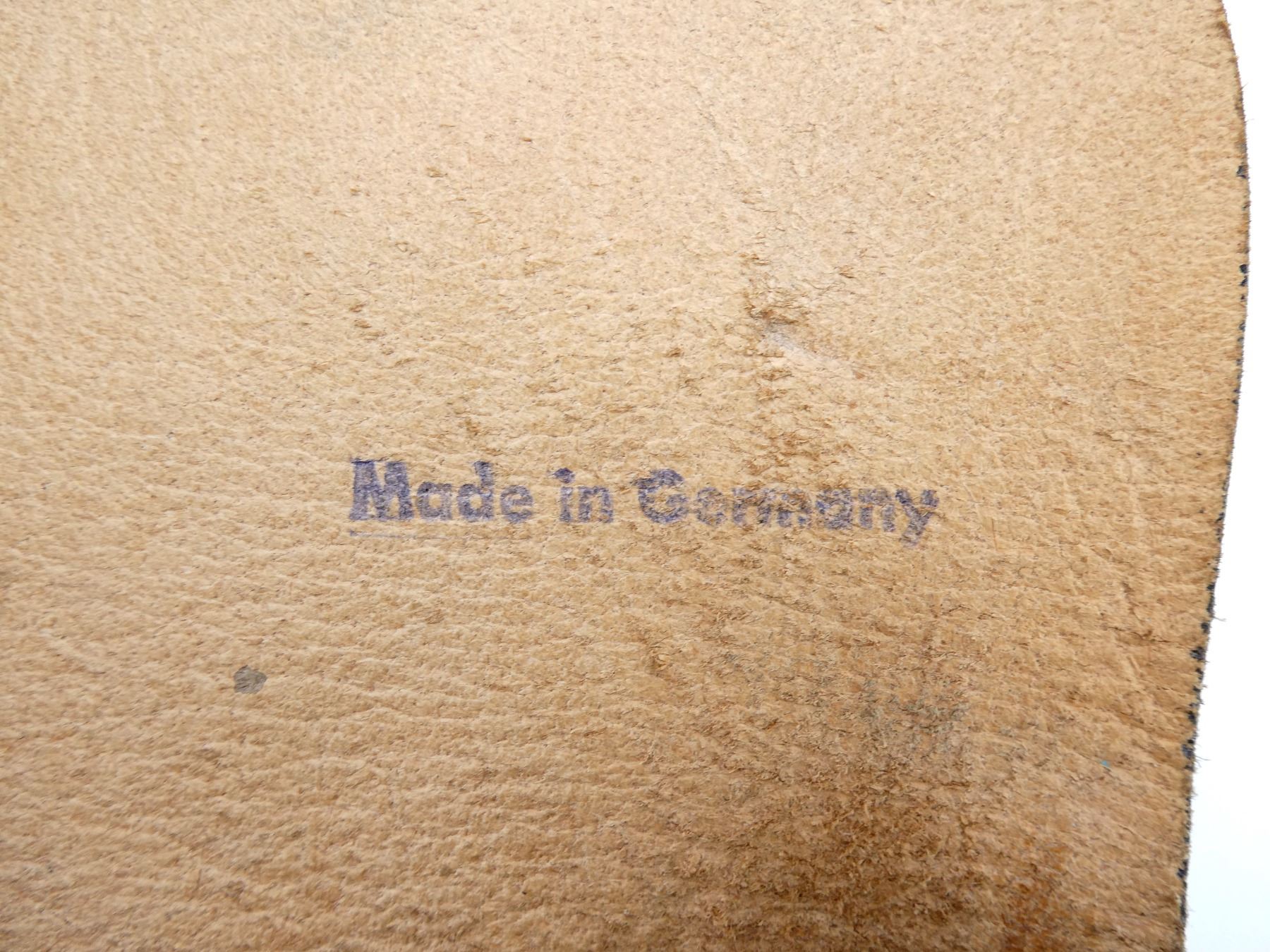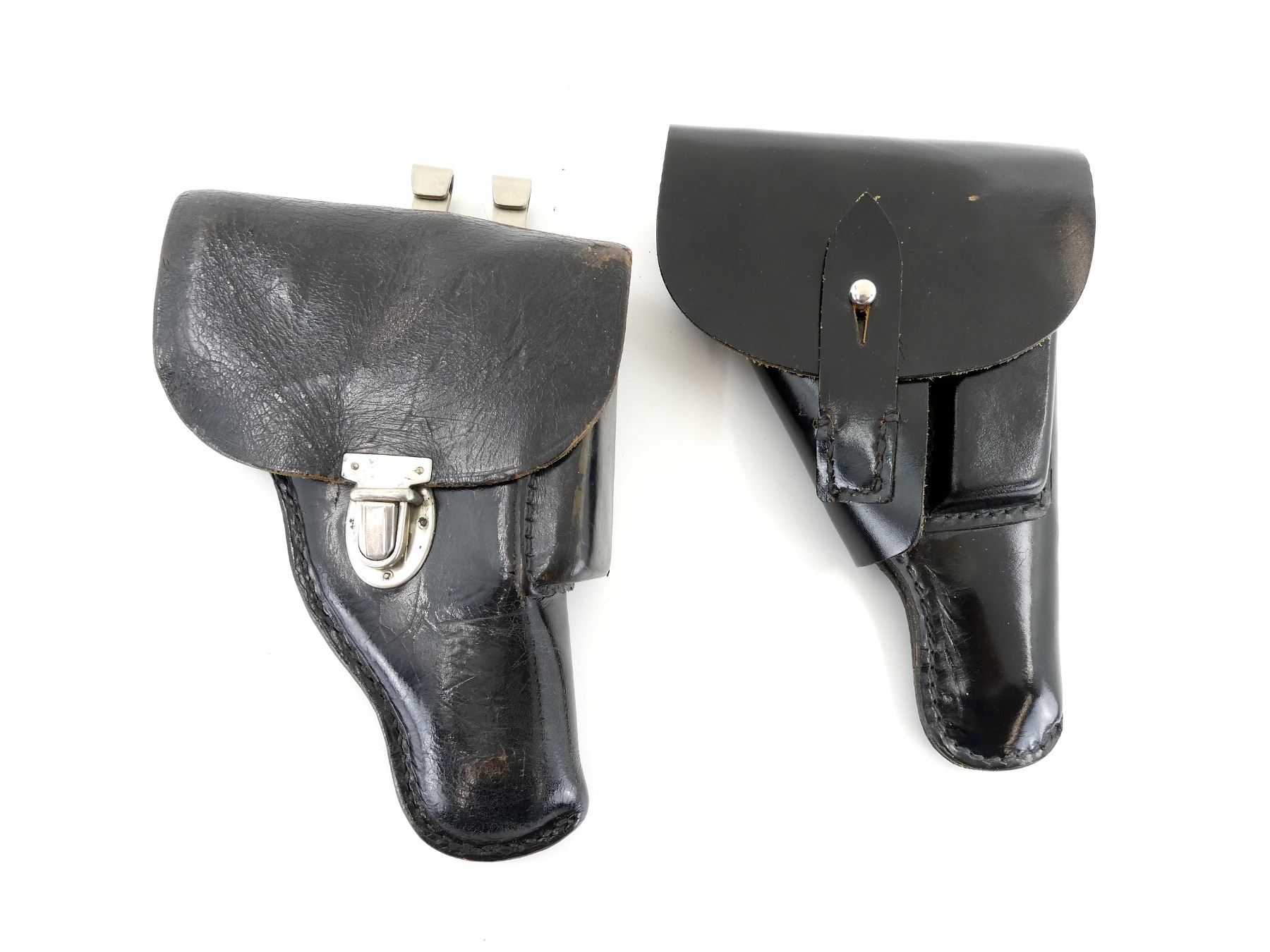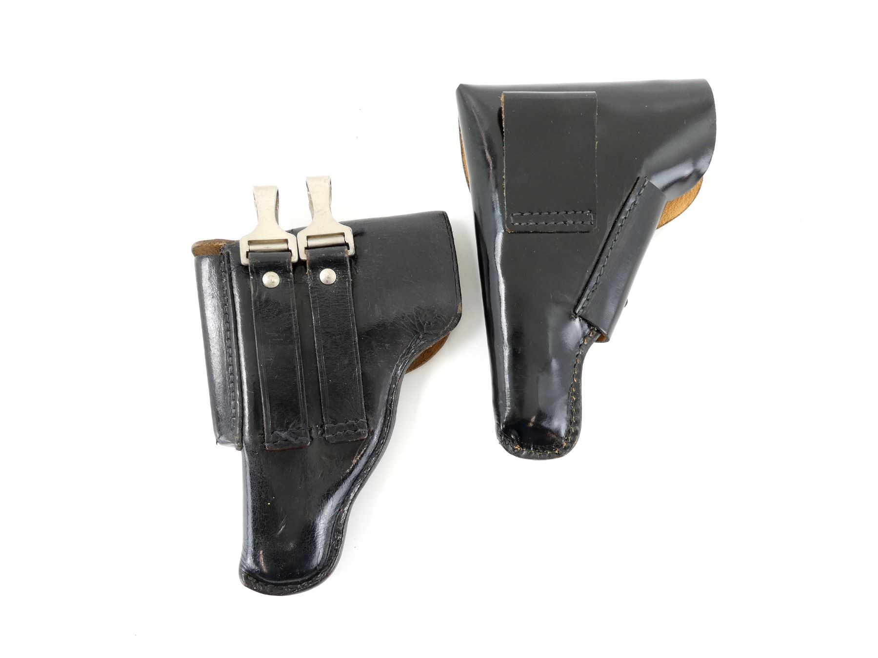 LOT INCLUDES; (2) BLACK LEATHER HOLSTERS, FITS SMALL FRAME SEMI-AUTO PISTOLS, ONE MARKED: "MADE IN GERMANY", OTHER HAS VARIOUS HAND-WRITTEN MARKINGS, BOTH WITH MAG SLEEVES, ONE HAS BELT LOOP, OTHER HAS TWO BELT LOOPS WITH HOOKS. SEE PHOTOS.