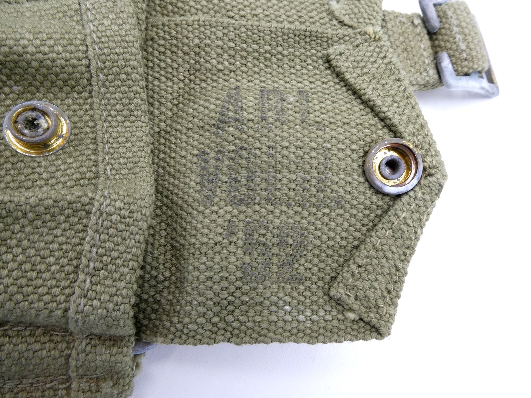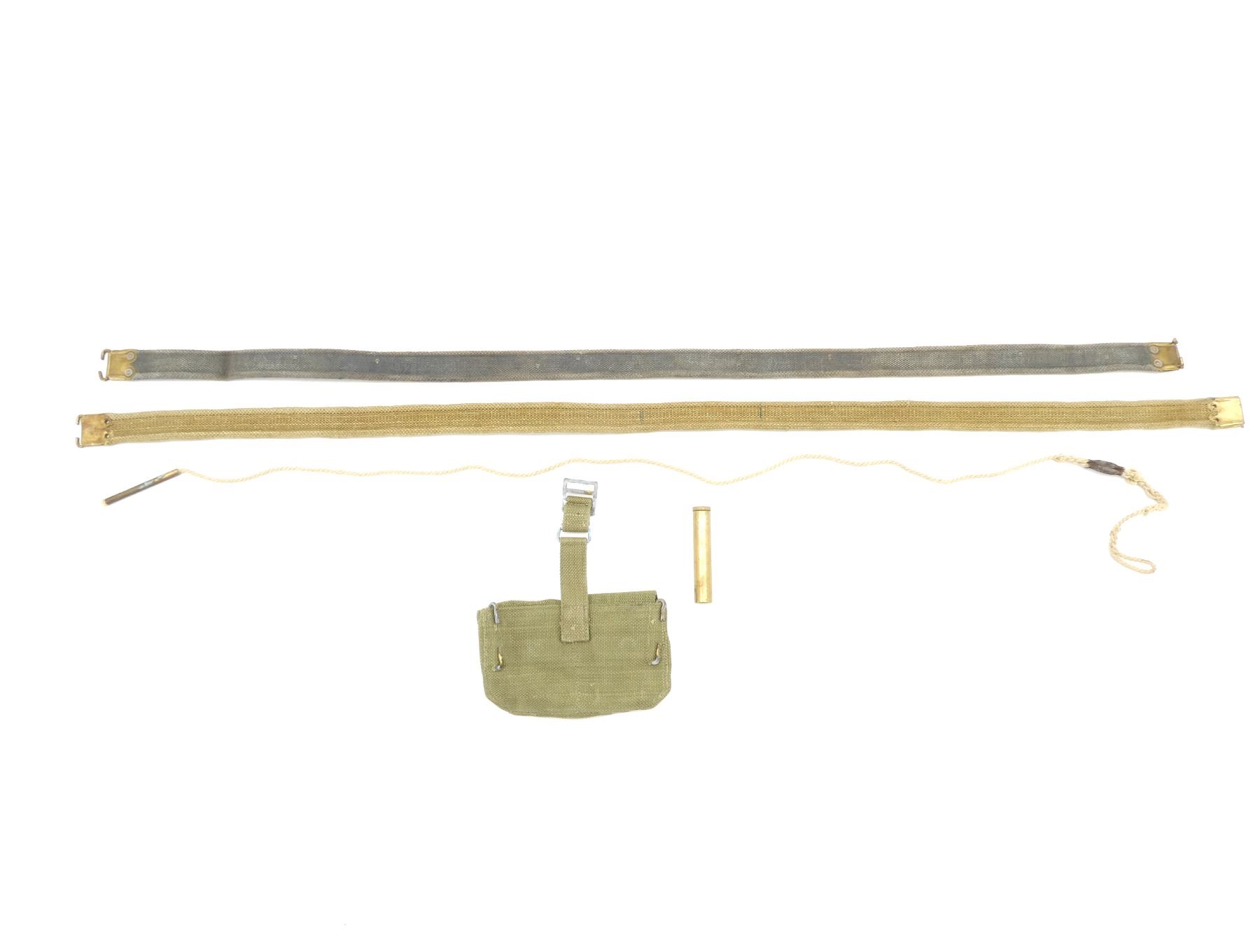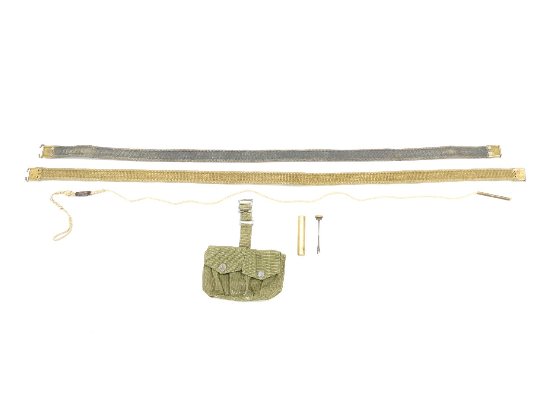 LOT INCLUDES; (1) BRITISH MILITARY ROPE PULL-THRU WITH BRASS WEIGHT, WEIGHT MARKED: CROWN OVER "?" OVER "13" WITH BROAD ARROW, OAL APPROX. 51", (1) BRITISH MILITARY BRASS OILER WITH SPOON, SPOON INTACT, BOTTOM MARKED: "EFD" WITH BROAD ARROW, OAL APPROX. 3.75", (2) CANADIAN / BRITISH MILITARY BLUE / TAN P37 WEB CANVAS LEE ENFIELD STYLE SLINGS, NO VISIBLE MARKINGS, BRASS ENDS, OALS APPROX. 44.5" & 47.5" & (1) BELGIAN LEE ENFIELD GREEN CANVAS AMMO POUCH, MARKED: "ABL, VOLH, '52", 2-POCKET WITH METAL BELT HOOKS. SEE PHOTOS.
