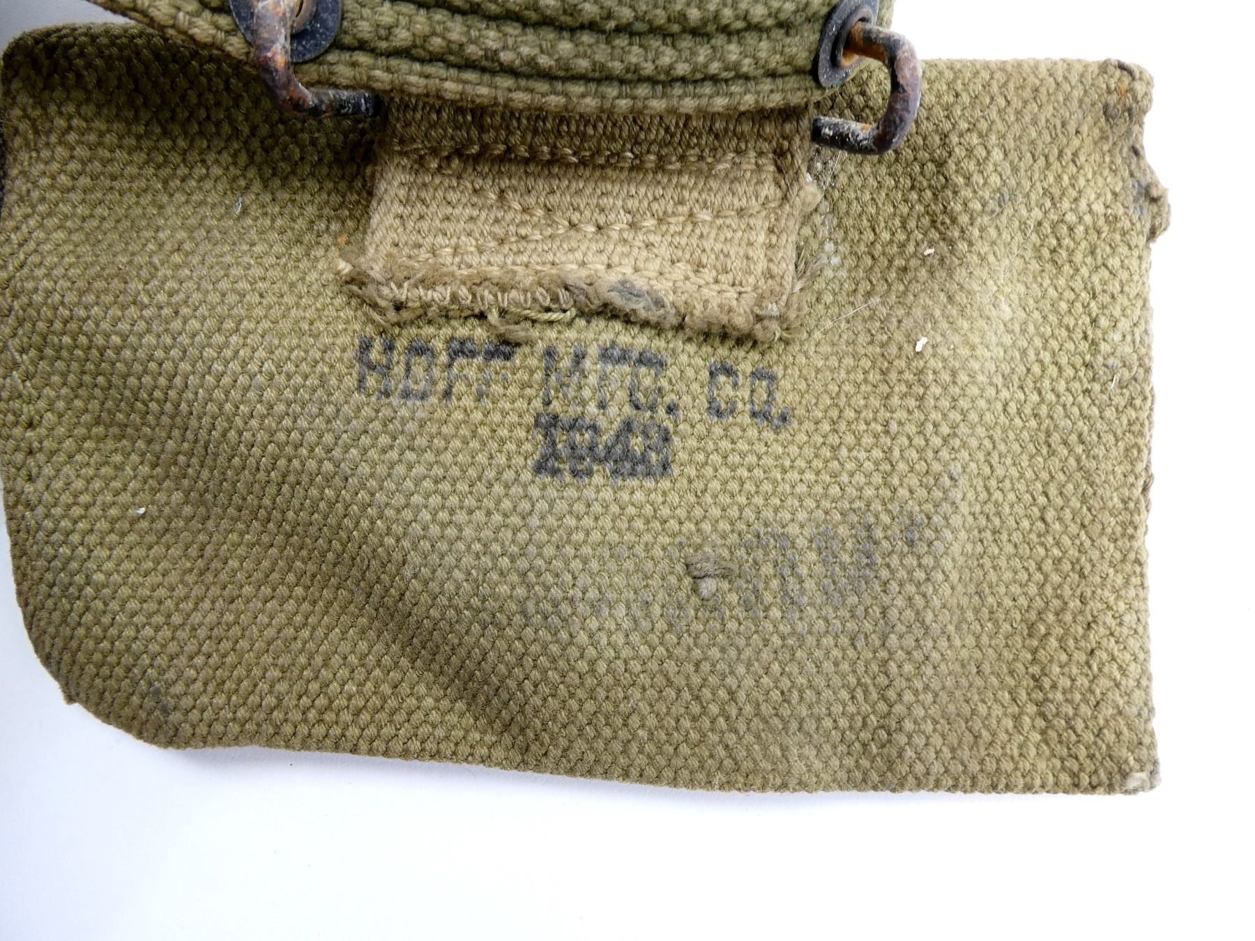 LOT INCLUDES; (1) TAN CANVAS PISTOL BELT, BRASS / METAL FITTINGS, NO VISIBLE MARKINGS, OAL APPROX. 46", ADJUSTABLE, (1) TAN CANVAS POUCH WITH BELT HOOK, FAINTLY MARKED: "U.S." & "KOFF MFG. CO., 194?" & (1) STEEL CANTEEN WITH TAN CANVAS COVER, CANTEEN FAINTLY MARKED: "U.S., S.M. CO, 1944", COVER MARKED: "U.S." & "J.A. SHOE, 1942", COVER WITH BELT HOOK. SEE PHOTOS.