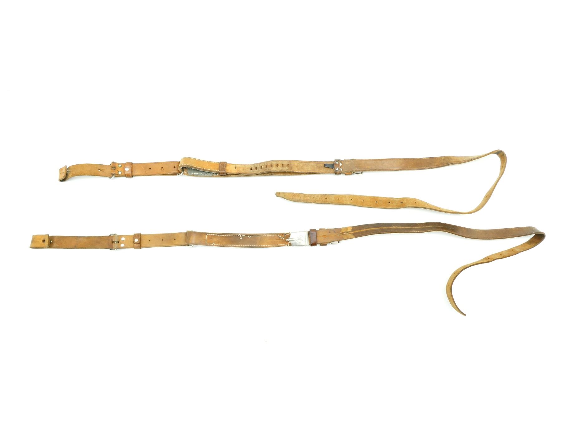 LOT INCLUDES; (2) POSSIBLY CG 63 TARGET RIFLE BROWN LEATHER SLINGS, ONE MARKED: "VAP-REMMEN" & VARIOUS OTHER FAINT / UN-CLEAR MARKINGS, OTHER HAS BUCKLE MARKED: "JA, LASET" IN A CIRCLE, VARIOUS METAL FITTINGS, 2-PIECE CONSTRUCTION, BOTH SHOWS AGE / WEAR, OALS APPROX. 73.5" & 83", ADJUSTABLE. SEE PHOTOS.