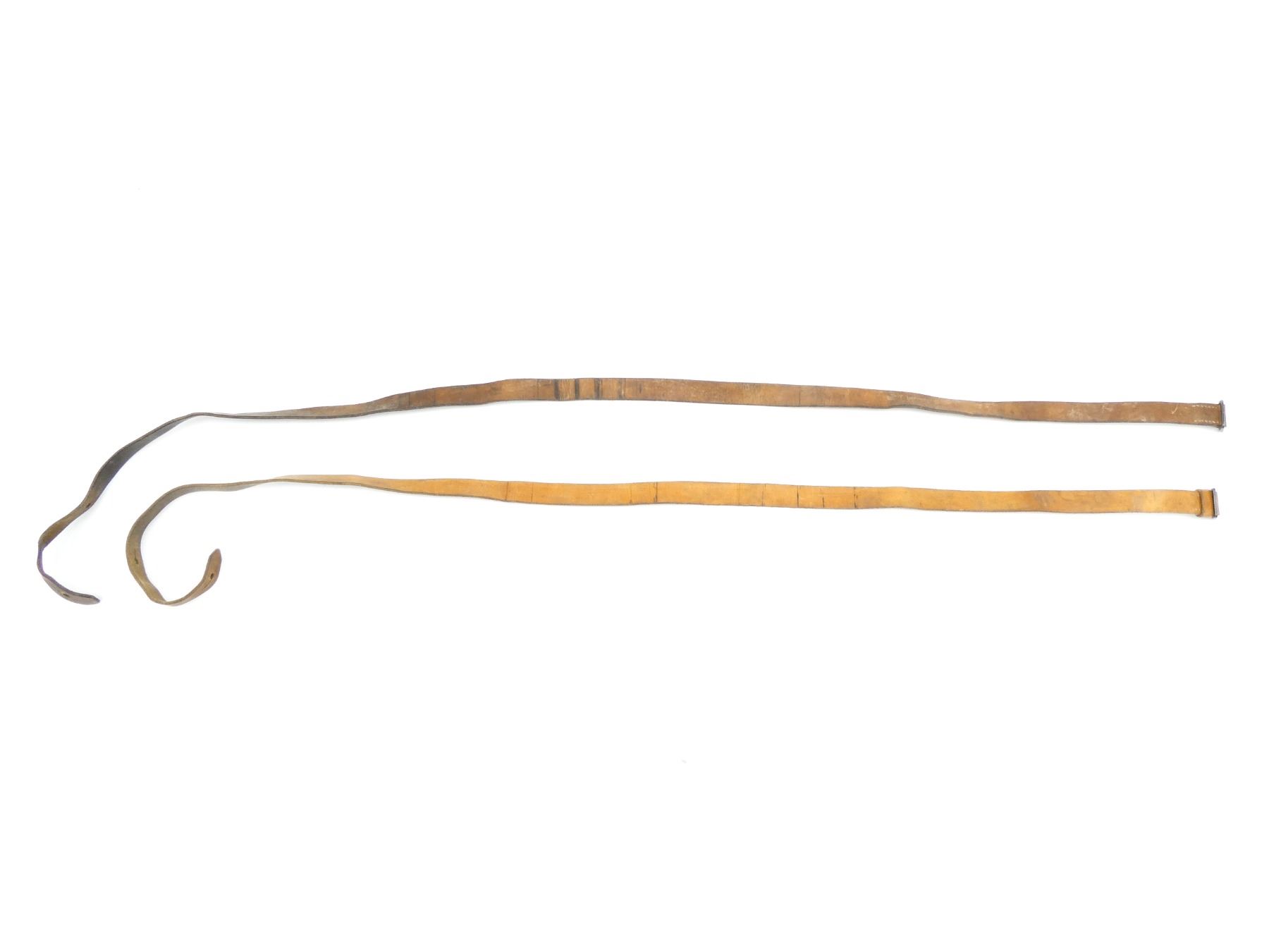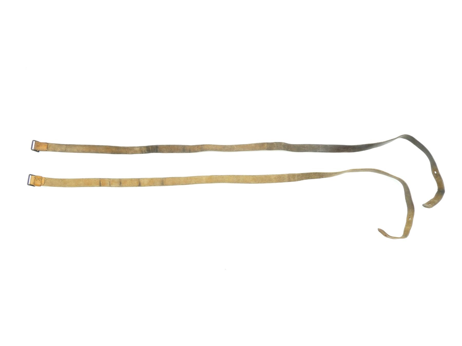 LOT INCLUDES; (2) BROWN LEATHER M98 STYLE LEATHER SLINGS, NO VISIBLE MARKINGS, METAL FITTINGS, MISSING STUDS, OALS APPROX. 54" & 57". SEE PHOTOS.
