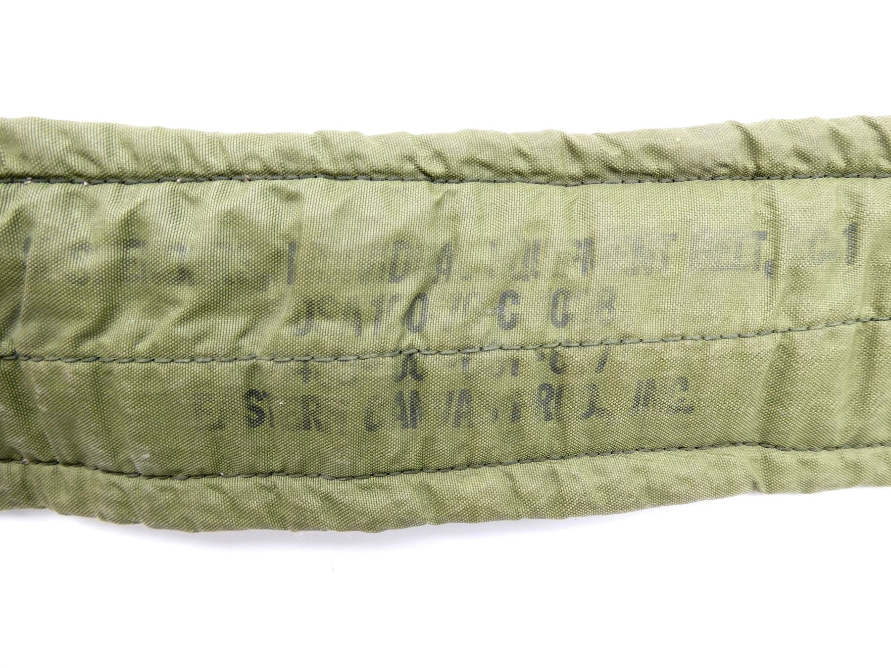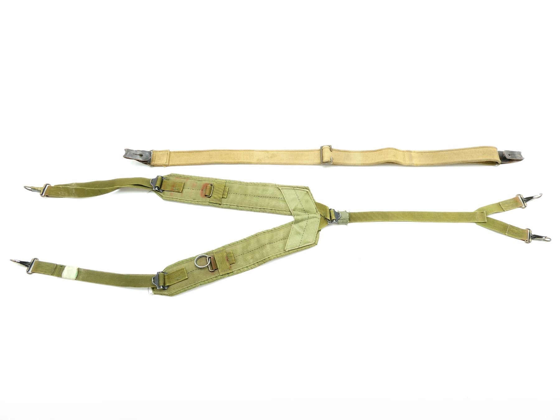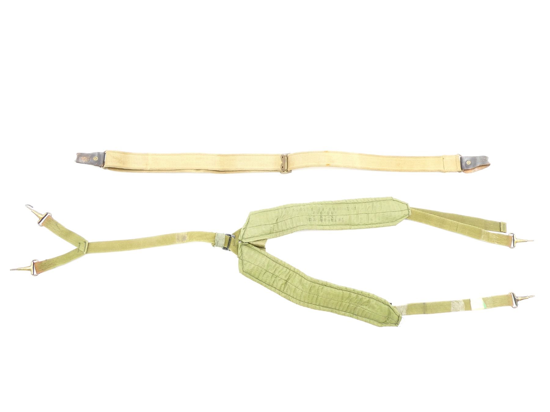 LOT INCLUDES; (1) BRITISH MILITARY LEE ENFIELD TARGET SLING, TAN P37 WEB CANVAS WITH BRASS FITTINGS / LEATHER TABS, NO VISIBLE MARKINGS, SHOWS WEAR, OAL APPROX. 53", ADJUSTABLE & (1) U.S. MILITARY GREEN NYLON EQUIPMENT BELT SUSPENDERS, VARIOUS FAINT / UN-CLEAR MARKINGS ON STRAPS, BRASS / METAL FITTINGS, SHOWS AGE / WEAR, OAL APPROX. 47", ADJUSTABLE. SEE PHOTOS.