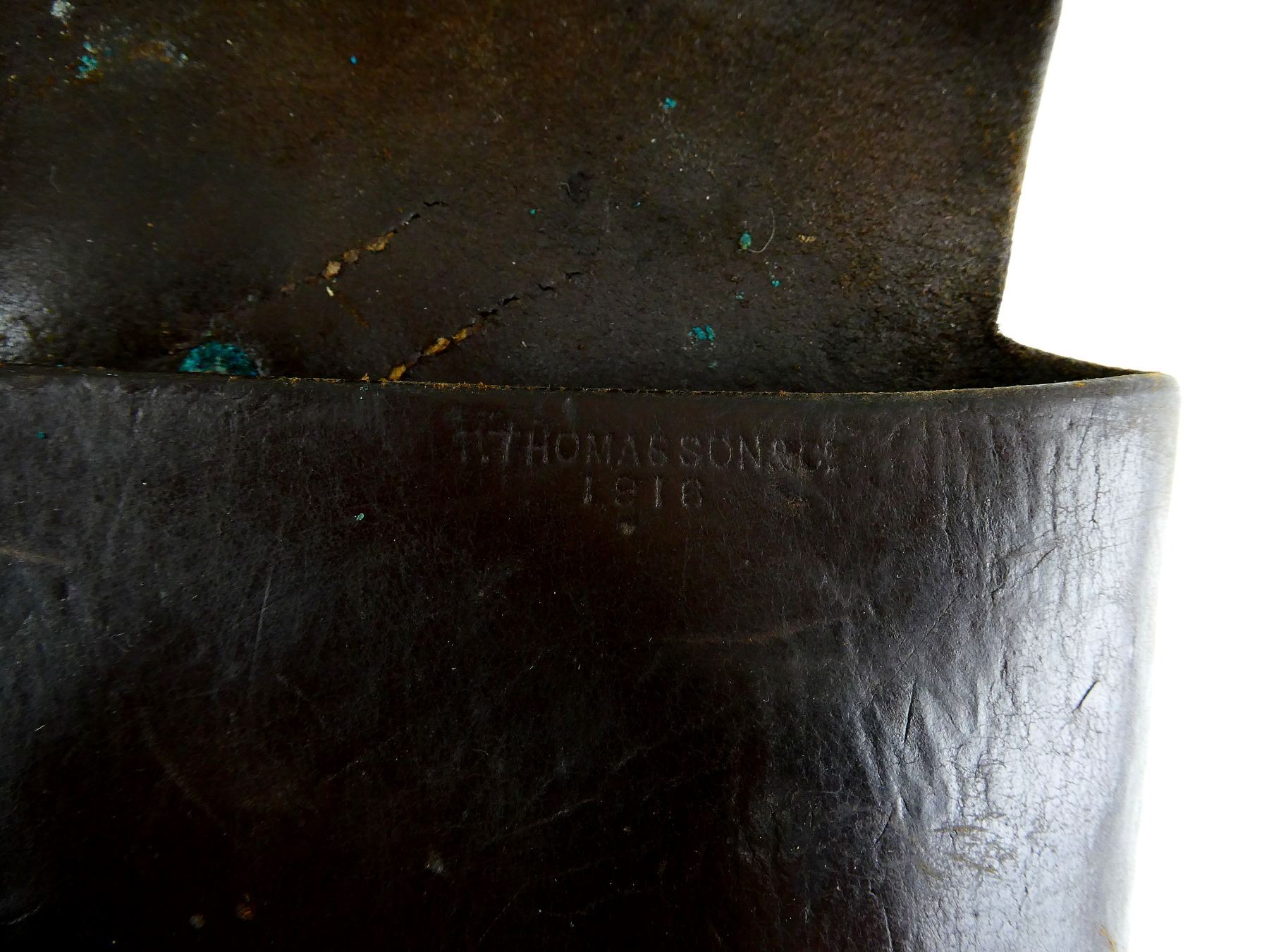 (1) BROWN LEATHER REVOLVER HOLSTER, FITS LARGE FRAME WEBLEY / SMITH & WESSON REVOLVERS, MARKED: "?.THOMASSON & CO., 1916", BRASS FITTINGS, LARGE BELT LOOP, LEATHER IS SOFT, SOME CORROSION ON BRASS, SHOWS AGE / WEAR. SEE PHOTOS.