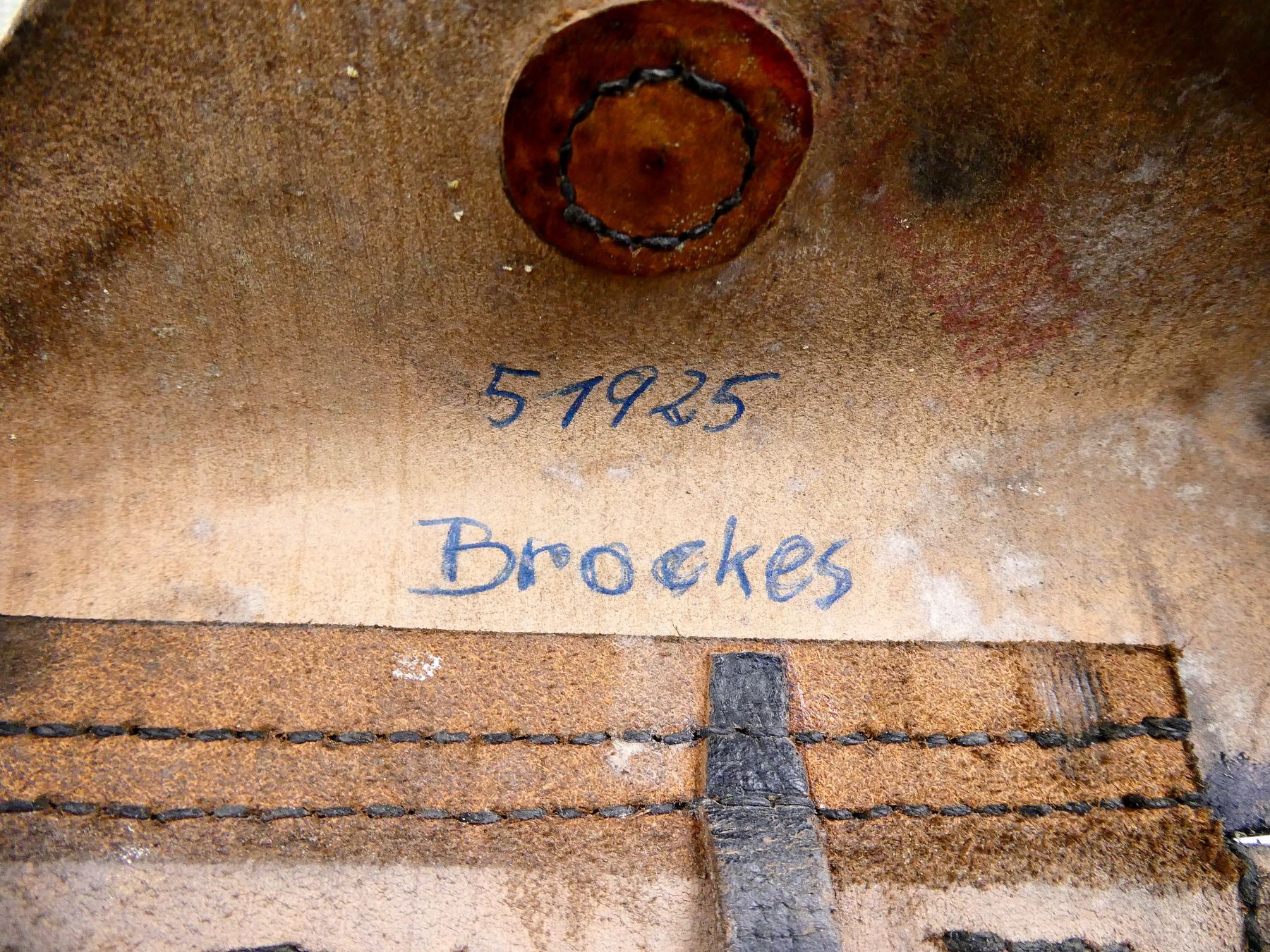 (1) BLACK LEATHER HOLSTER WITH MAGAZINE SLEEVE & BELT LOOPS, BACK MARKED: "51925", INSIDE FLAP HAND-WRITTEN MARKED: "51925, BROCKES", SHOWS WEAR. SEE PHOTOS.