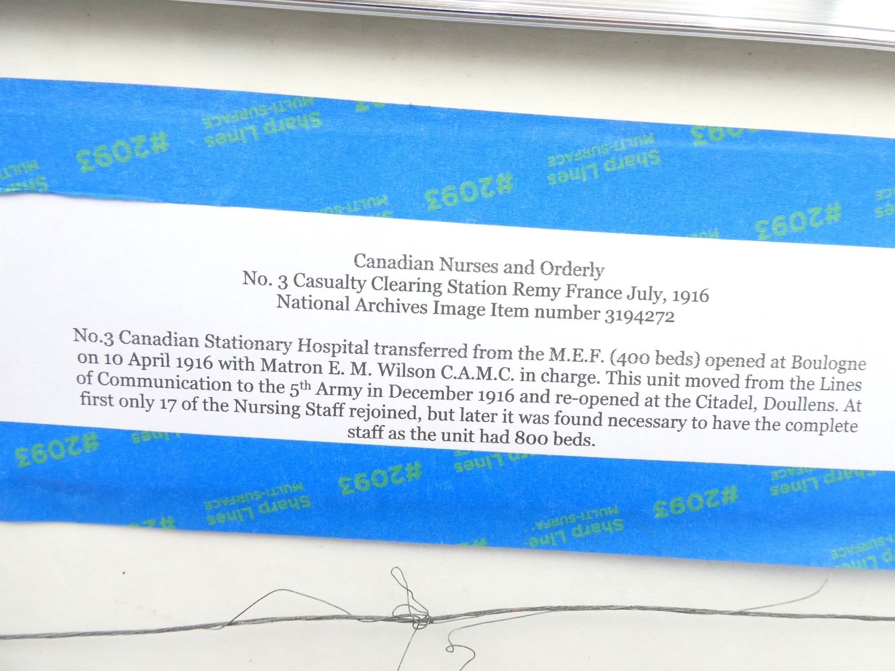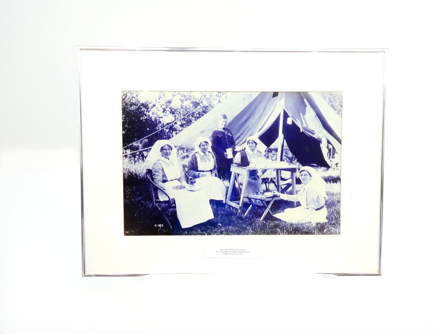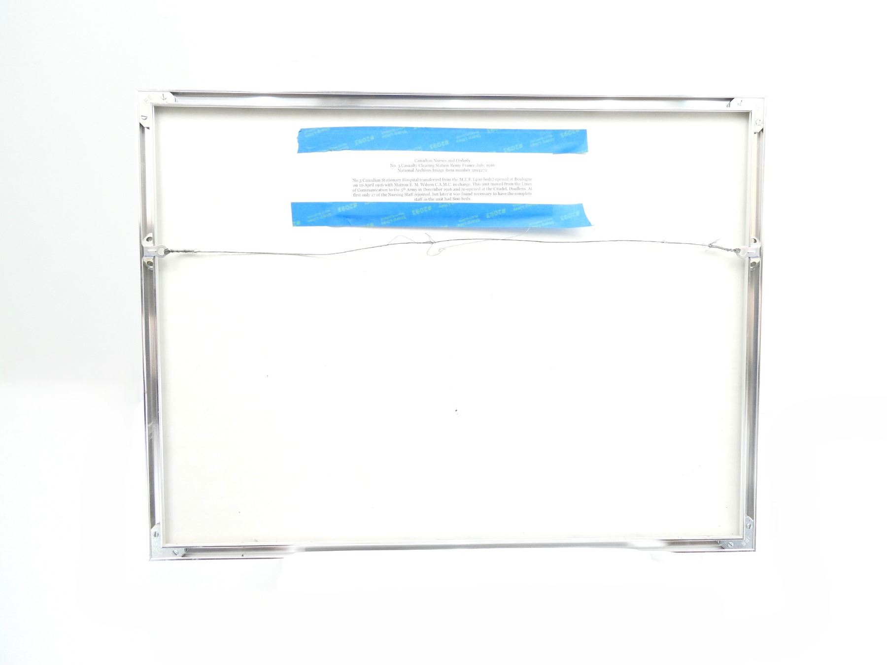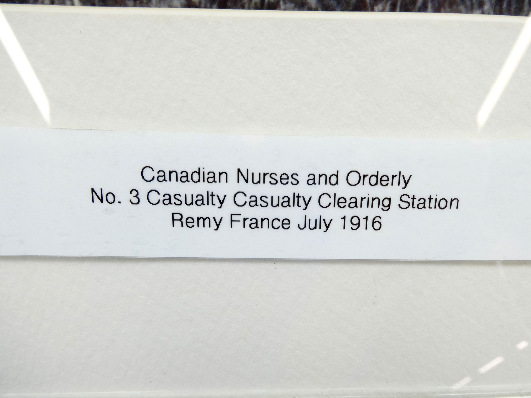 (1) FRAMED PHOTO OF "CANADIAN NURSES AND ORDERLY NO. 3 CASUALTY CLEARING STATION IN REMY FRANCE JULY 1916", NATIONAL ARCHIVES IMAGE ITEM NUMBER 3194272, BRIEF HISTORY OF NURSES STATION ON BACK OF PICTURE, UNDER GLASS, METAL FRAME APPROX. 24.25" X 18.25". SEE PHOTOS. *NO GUARANTEE ON GLASS FOR SHIPPING*