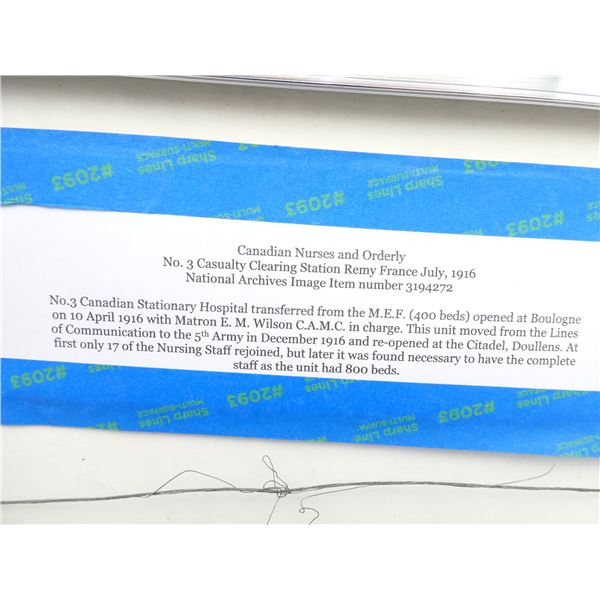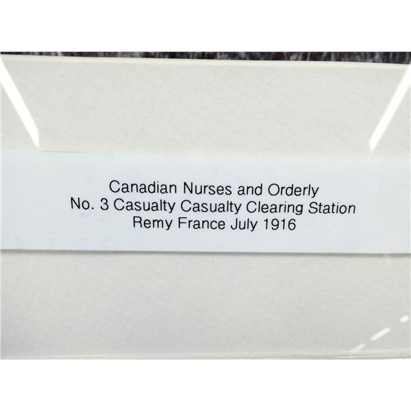 (1) FRAMED PHOTO OF "CANADIAN NURSES AND ORDERLY NO. 3 CASUALTY CLEARING STATION IN REMY FRANCE JULY 1916", NATIONAL ARCHIVES IMAGE ITEM NUMBER 3194272, BRIEF HISTORY OF NURSES STATION ON BACK OF PICTURE, UNDER GLASS, METAL FRAME APPROX. 24.25" X 18.25". SEE PHOTOS. *NO GUARANTEE ON GLASS FOR SHIPPING*