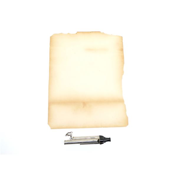 LOT INCLUDES; (1) "VICTORIA, I, (ALEXANDRINE VICTORIA)" PRINT, ALSO MARKED: "QUEEN OF THE UNITED KINGDOM OF GREAT BRITAIN, BORN MAY 24TH 1819, REIGNING SINCE JANUARY 20TH 1837, CROWNED JUNE 28TH 1838", SHOWS AGE / WEAR / TEAR, TORN AROUND ALL EDGES, APPROX. 12" X 15 5/8" & (1) BRITISH WHISTLE, STEEL / POLYMER CONSTRUCTION, MARKED: "ENGLAND", OAL APPROX. 6 5/8". SEE PHOTOS.