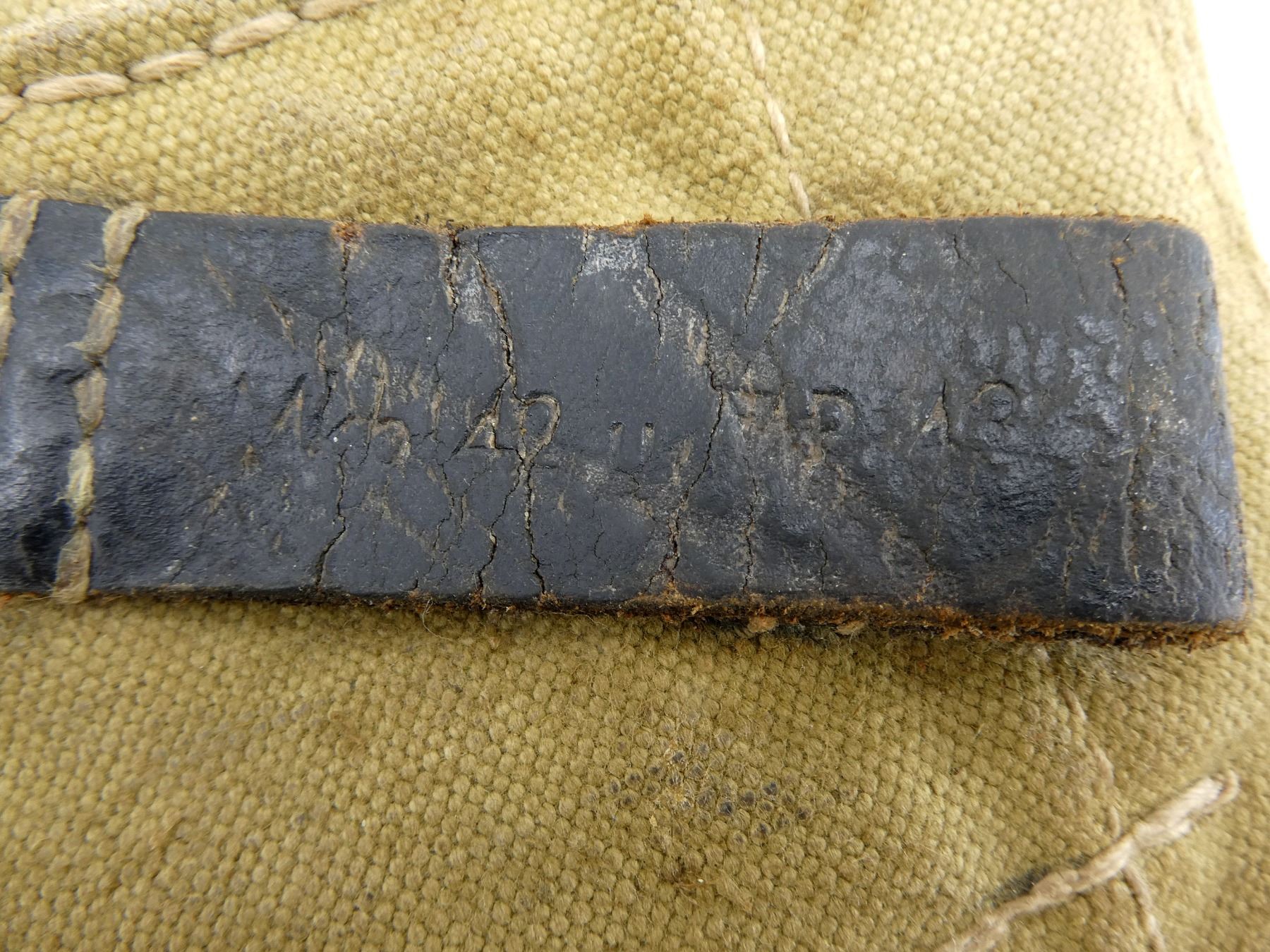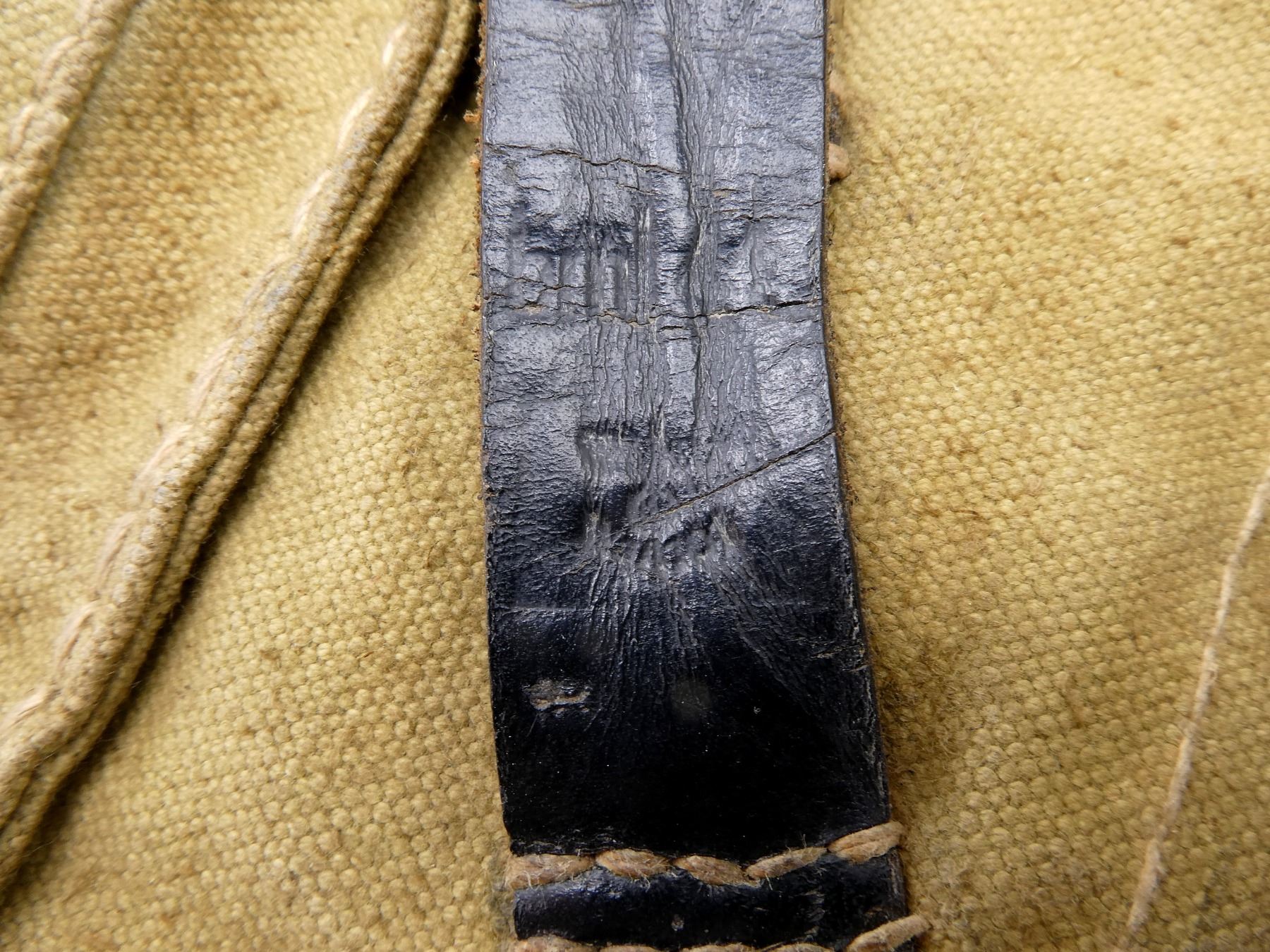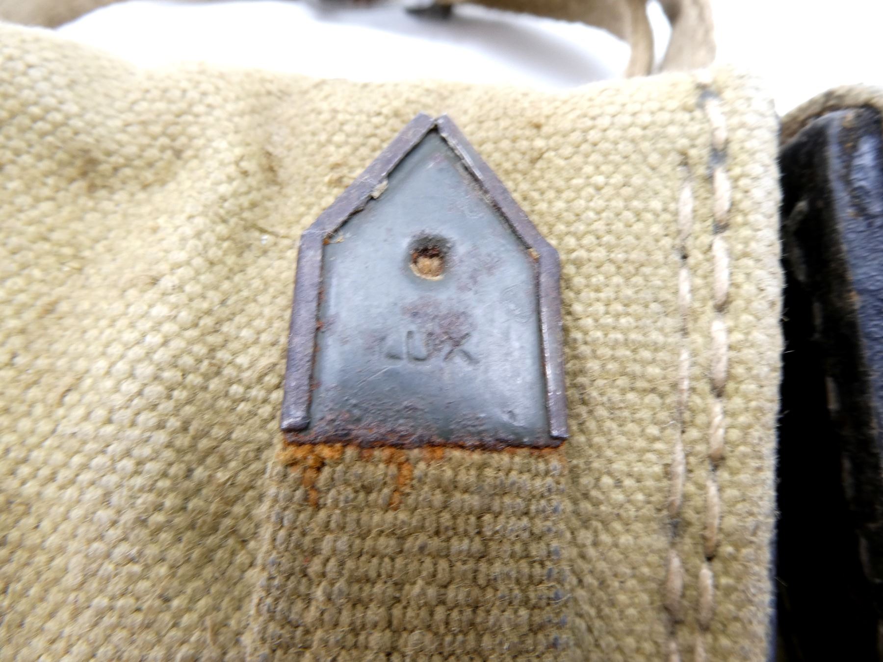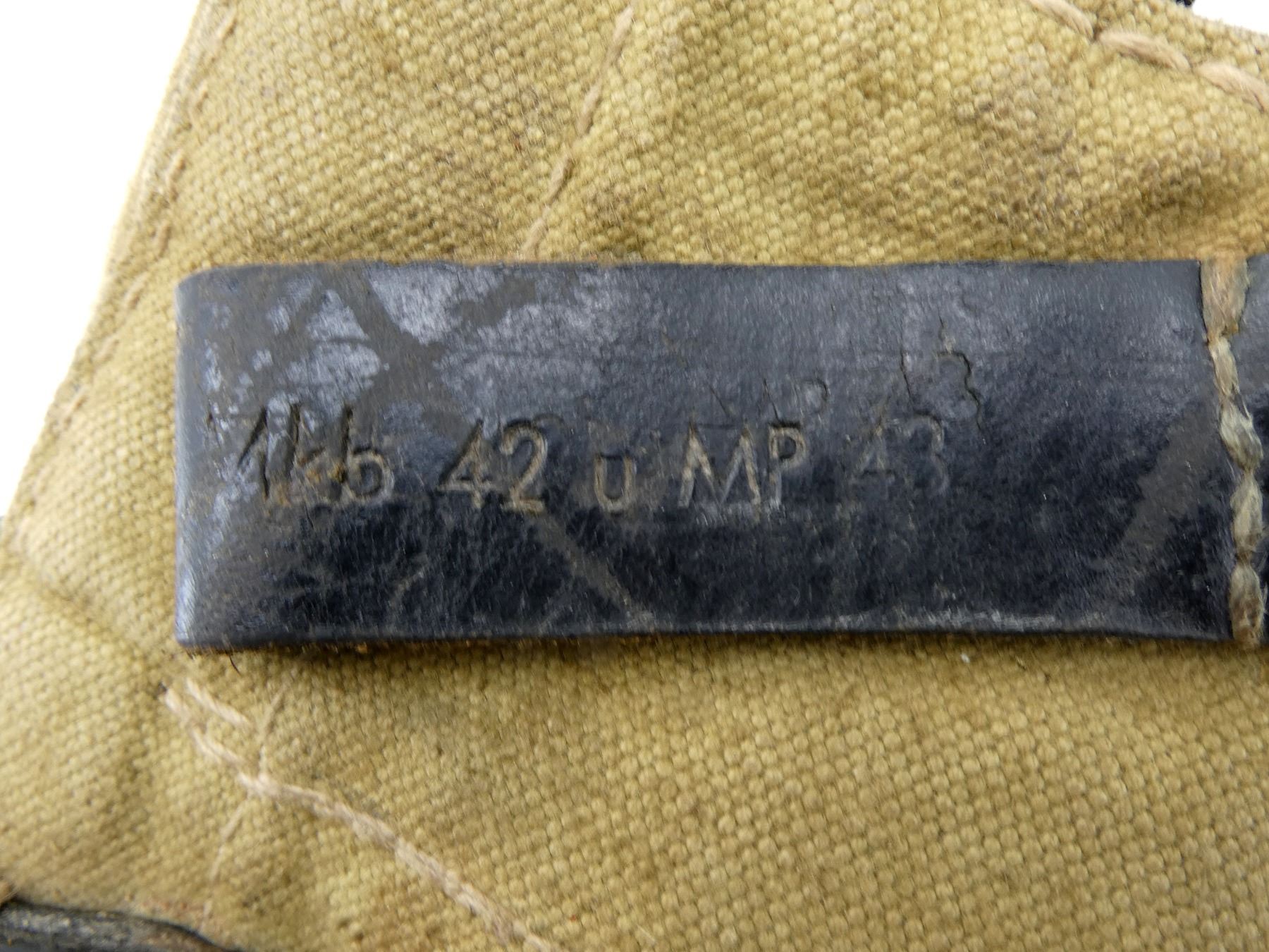 (1) FITS 7.92 KURZ MAGS, REPRODUCTION TAN CANVAS & BROWN LEATHER FITTINGS WITH SHOULDER STRAP, 6-POCKETS, 1-LOADING TOOL POCKET, METAL ENDS ON POCKET STRAPS MARKED: "LUX", LEATHER BELT LOOPS MARKED: "BM? 44, WAA101" WITH EAGLE SYMBOL & "MKB 42 U MP 43", SHOWS WEAR. SEE PHOTOS.
