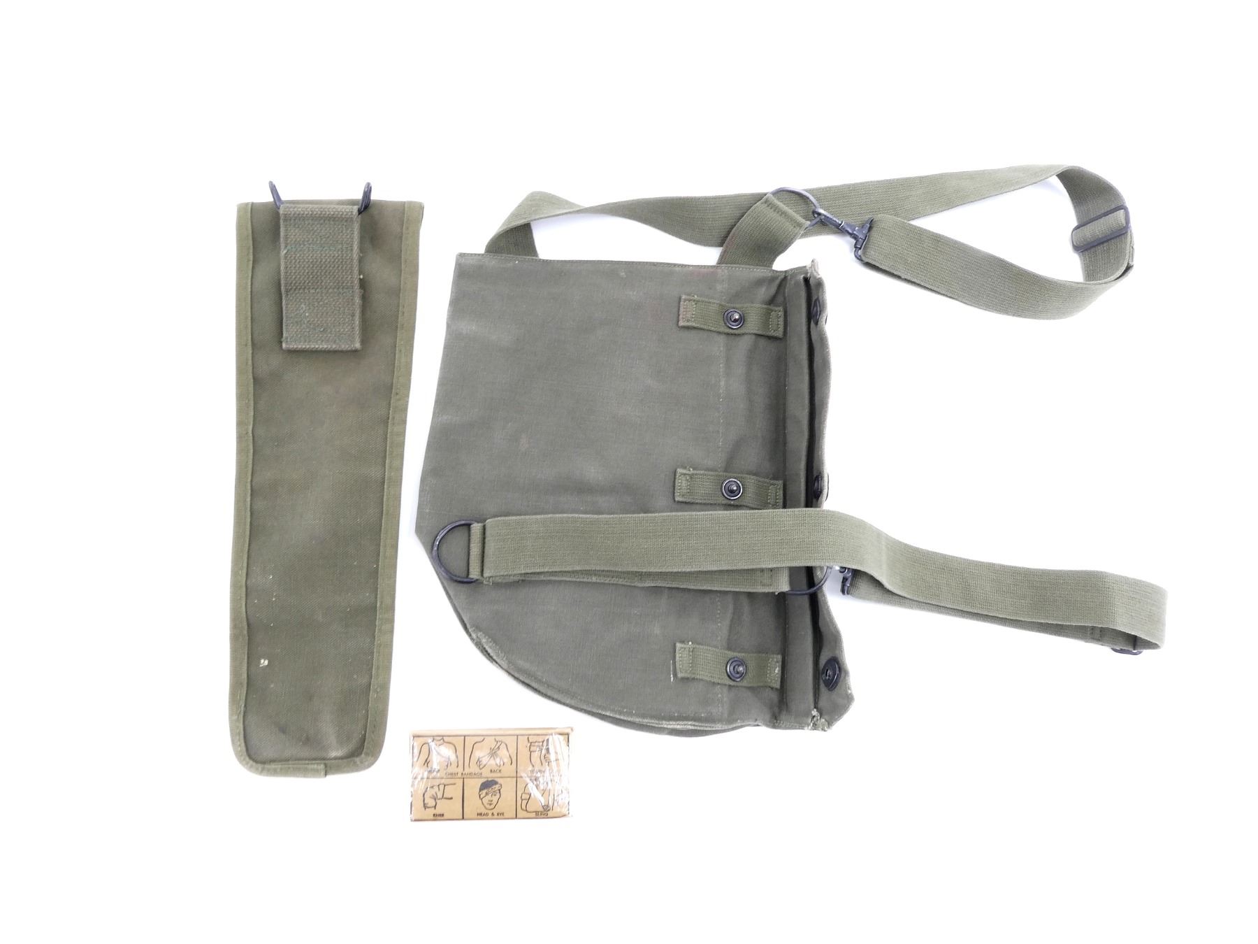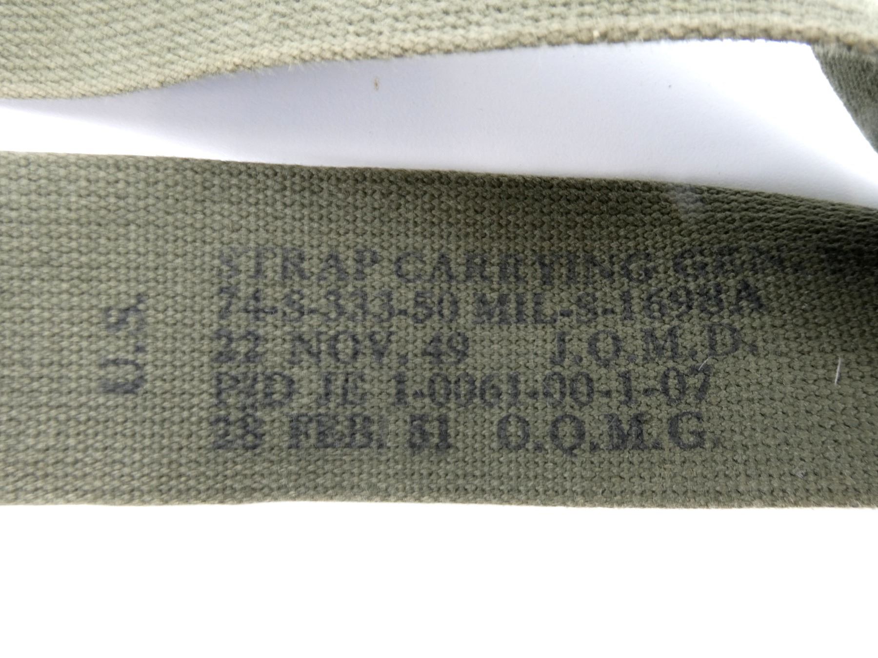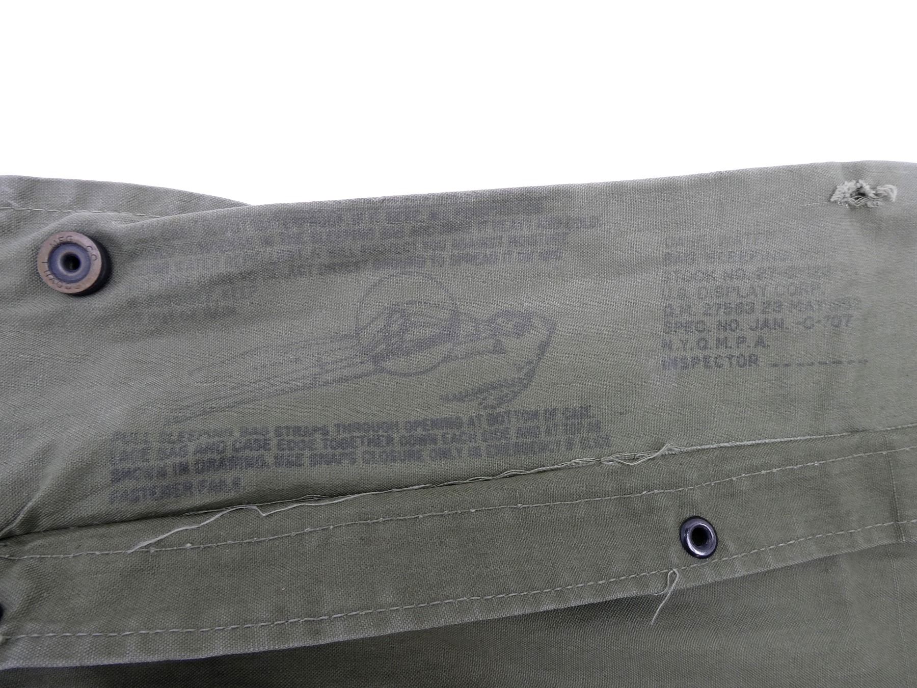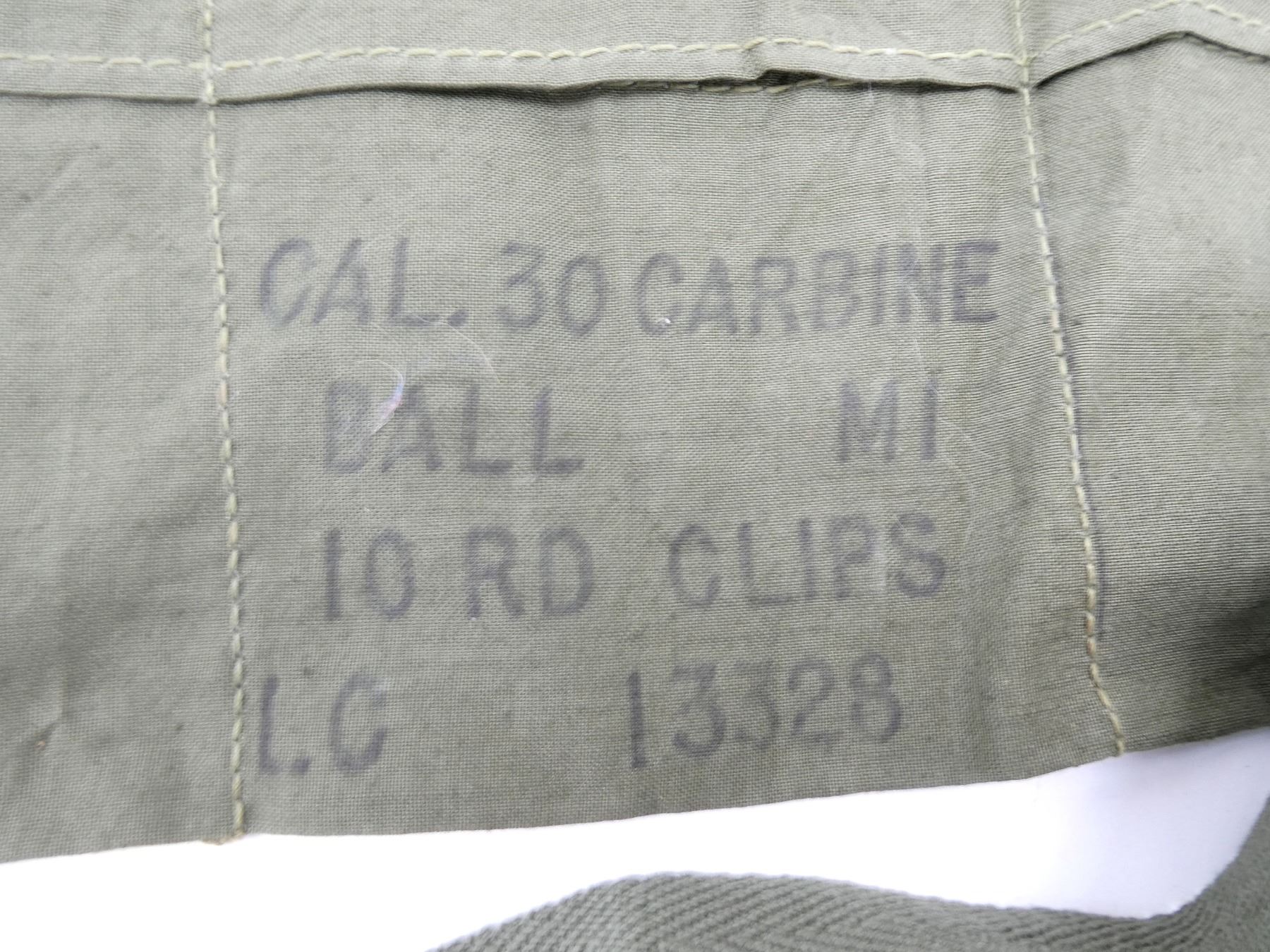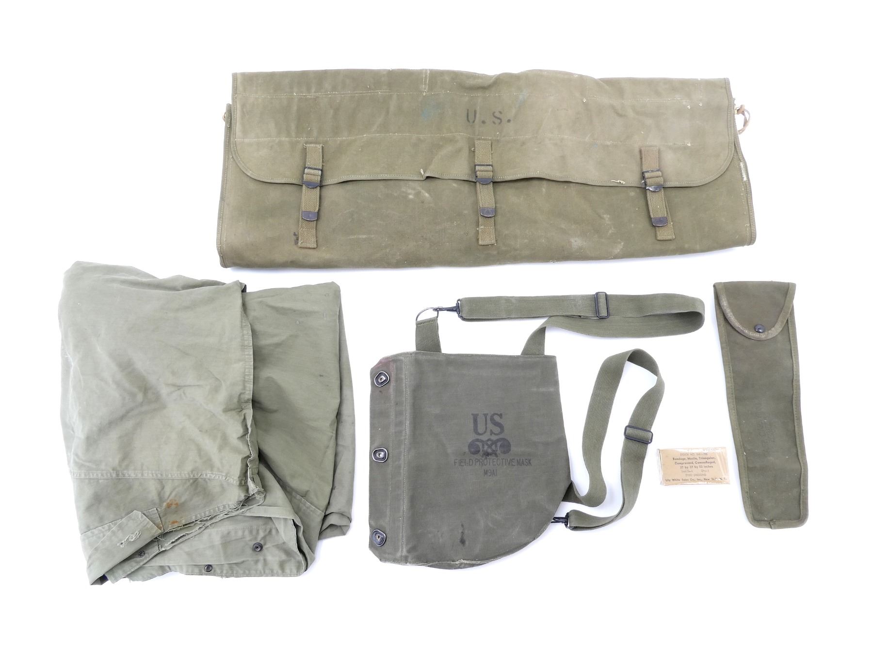 LOT INCLUDES; (1) GREEN CANVAS WEB M65 RIFLE TELESCOPE CARRYING CASE, MARKED: "CASE, CARRYING, 7631526", WITH BELT HOOK, (1) GREEN CANVAS WEB M9A1 PROTECTIVE FIELD GAS MASK CARRIER, MARKED: "US, FIELD PROTECTIVE MASK, M9A1", WITH SHOULDER STRAPS, (1) GREEN CANVAS WEB GENERAL PURPOSE CARRYING STRAP, MARKED: "U.S.", DATED: "22 NOV, 49 / 28 FEB. 51" & VARIOUS OTHER MARKINGS, OAL APPROX. 29.5", ADJUSTABLE, (1) GREEN CANVAS M1 10-RND .30 CARBINE STRIPPER CLIP BANDOLIER, 6-POCKETS, WITH STRAP, MARKED: "HARIAN CO, JULY 1952" WITH VARIOUS OTHER MARKINGS, (1) GREEN CANVAS WEB FIELD ARTILLERY PLANE TABLE DRAWING BOARD CARRYING CASE, MARKED: "U.S.", "J.Q.M.D. 49" & VARIOUS OTHER MARKINGS, ZIPPERED (WORKS), APPROX. 26" X 34", (1) M1945 WATER REPELLENT SLEEPING BAG CASE, DATED: "23 MAY 1952", MARKED: "U.S." & VARIOUS OTHER MARKINGS / INSTRUCTIONS, APPROX. 94" X 68", ETC. SEE PHOTOS.