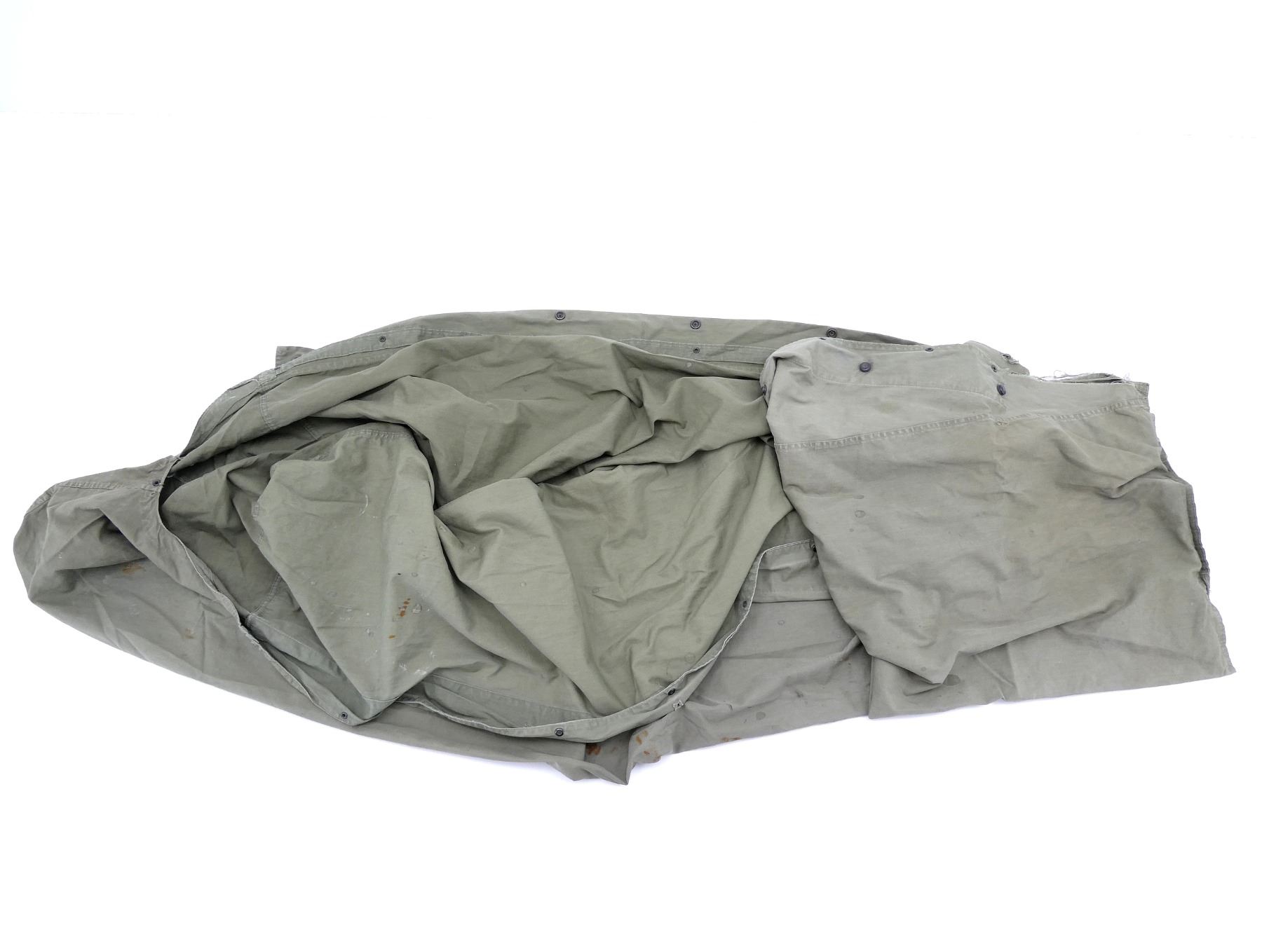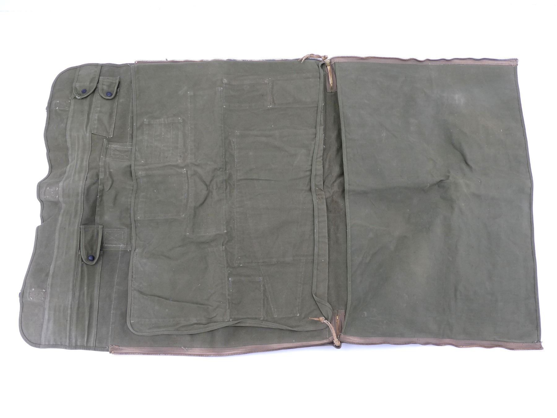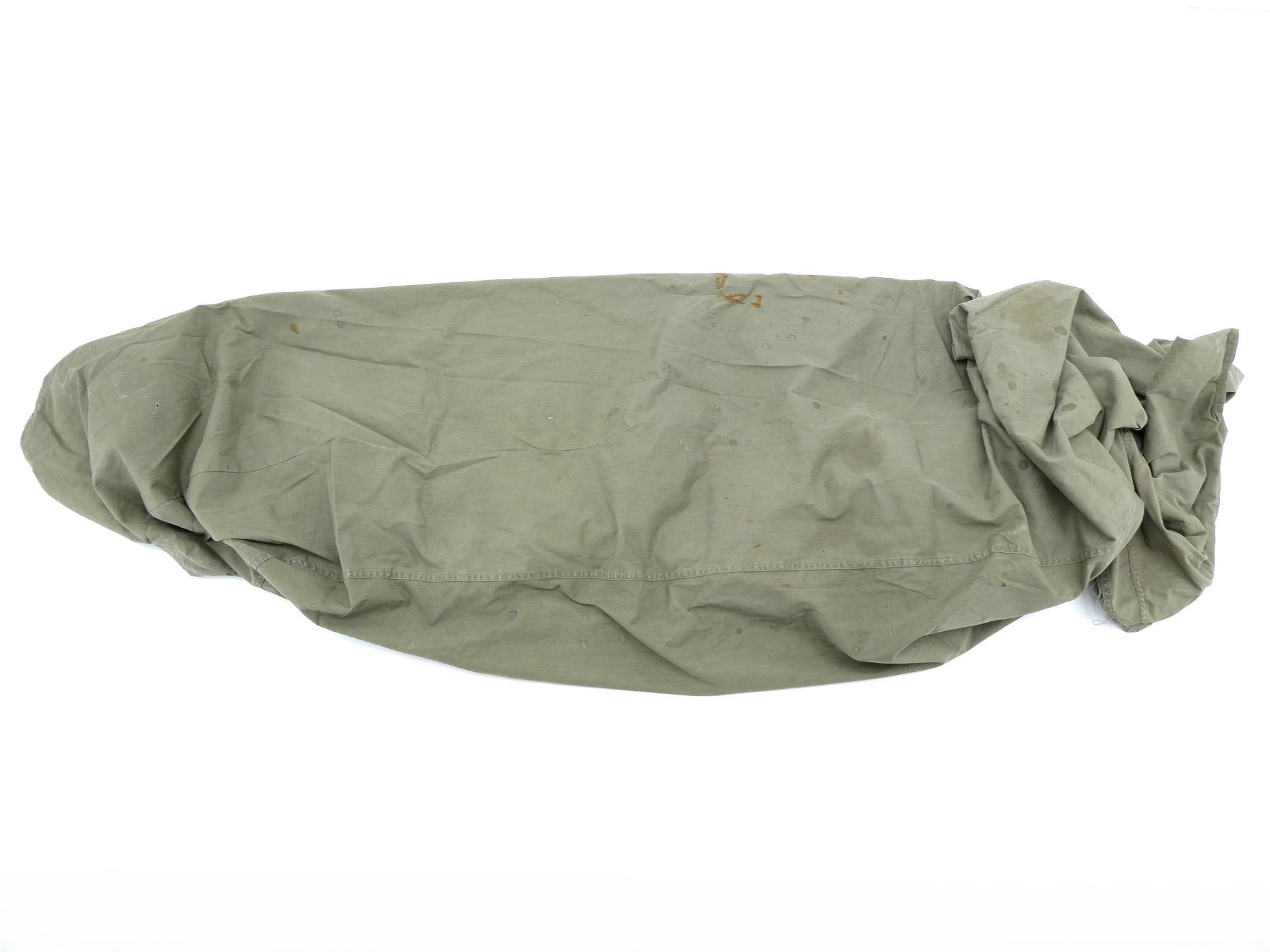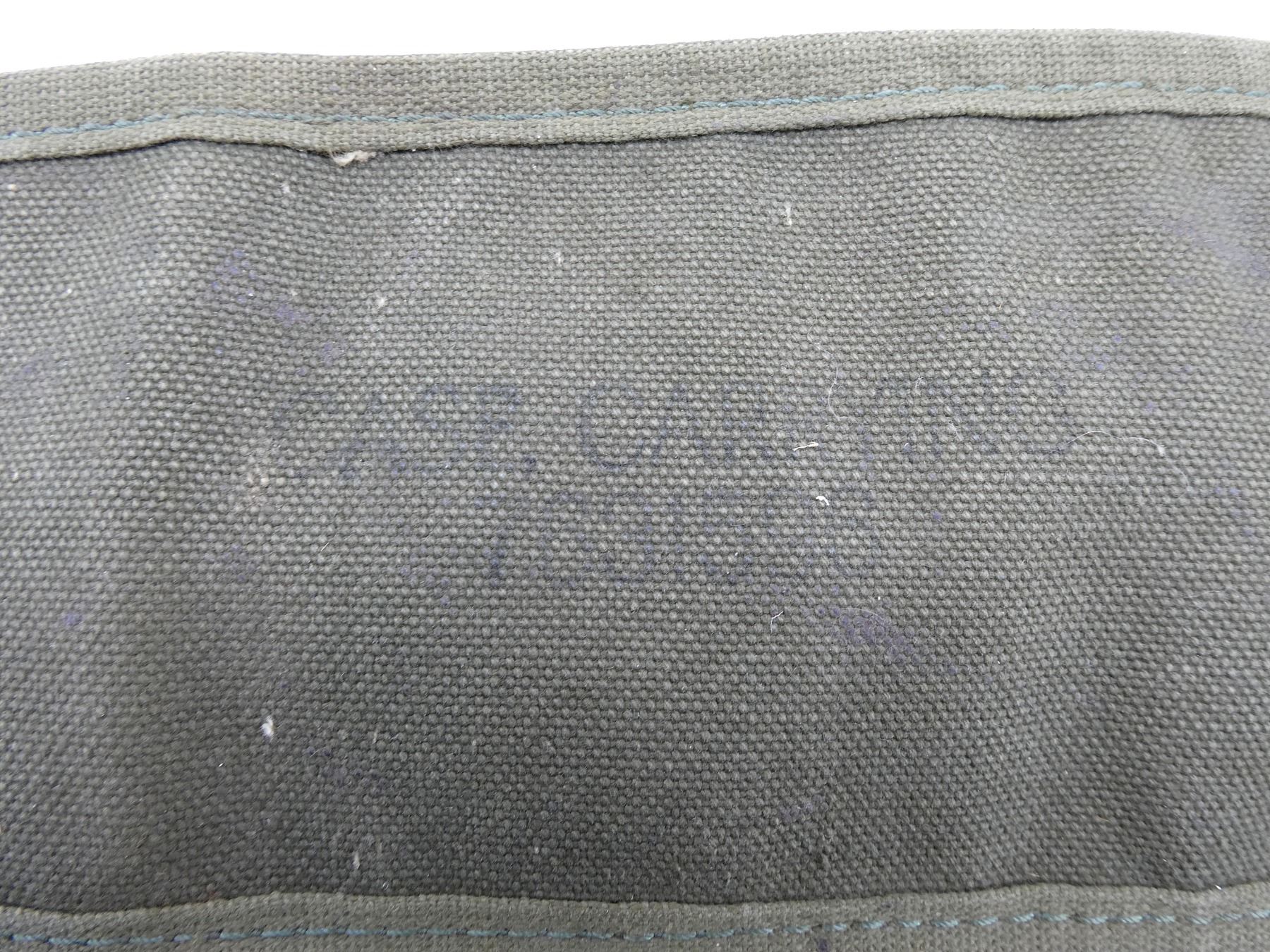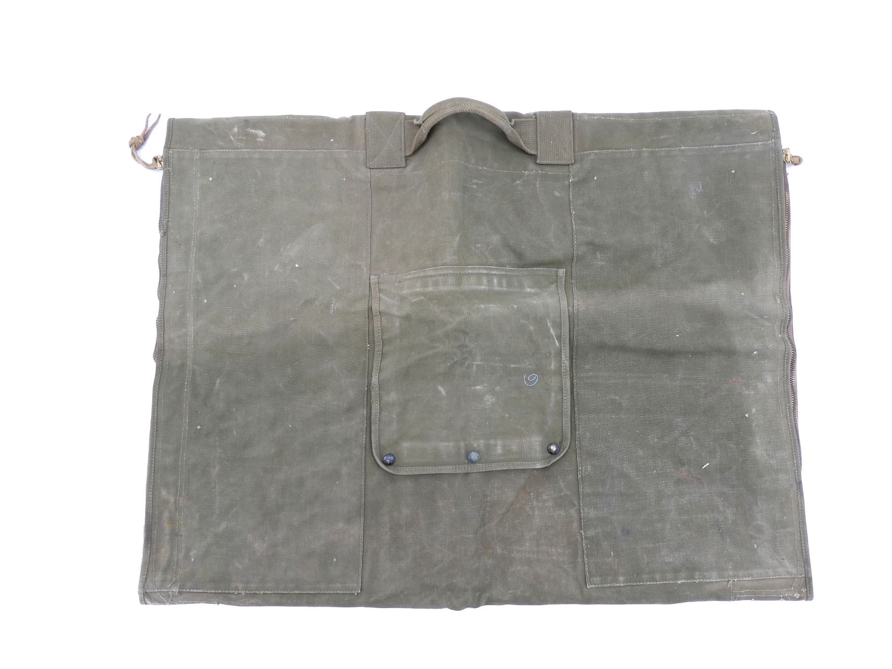 LOT INCLUDES; (1) GREEN CANVAS WEB M65 RIFLE TELESCOPE CARRYING CASE, MARKED: "CASE, CARRYING, 7631526", WITH BELT HOOK, (1) GREEN CANVAS WEB M9A1 PROTECTIVE FIELD GAS MASK CARRIER, MARKED: "US, FIELD PROTECTIVE MASK, M9A1", WITH SHOULDER STRAPS, (1) GREEN CANVAS WEB GENERAL PURPOSE CARRYING STRAP, MARKED: "U.S.", DATED: "22 NOV, 49 / 28 FEB. 51" & VARIOUS OTHER MARKINGS, OAL APPROX. 29.5", ADJUSTABLE, (1) GREEN CANVAS M1 10-RND .30 CARBINE STRIPPER CLIP BANDOLIER, 6-POCKETS, WITH STRAP, MARKED: "HARIAN CO, JULY 1952" WITH VARIOUS OTHER MARKINGS, (1) GREEN CANVAS WEB FIELD ARTILLERY PLANE TABLE DRAWING BOARD CARRYING CASE, MARKED: "U.S.", "J.Q.M.D. 49" & VARIOUS OTHER MARKINGS, ZIPPERED (WORKS), APPROX. 26" X 34", (1) M1945 WATER REPELLENT SLEEPING BAG CASE, DATED: "23 MAY 1952", MARKED: "U.S." & VARIOUS OTHER MARKINGS / INSTRUCTIONS, APPROX. 94" X 68", ETC. SEE PHOTOS.