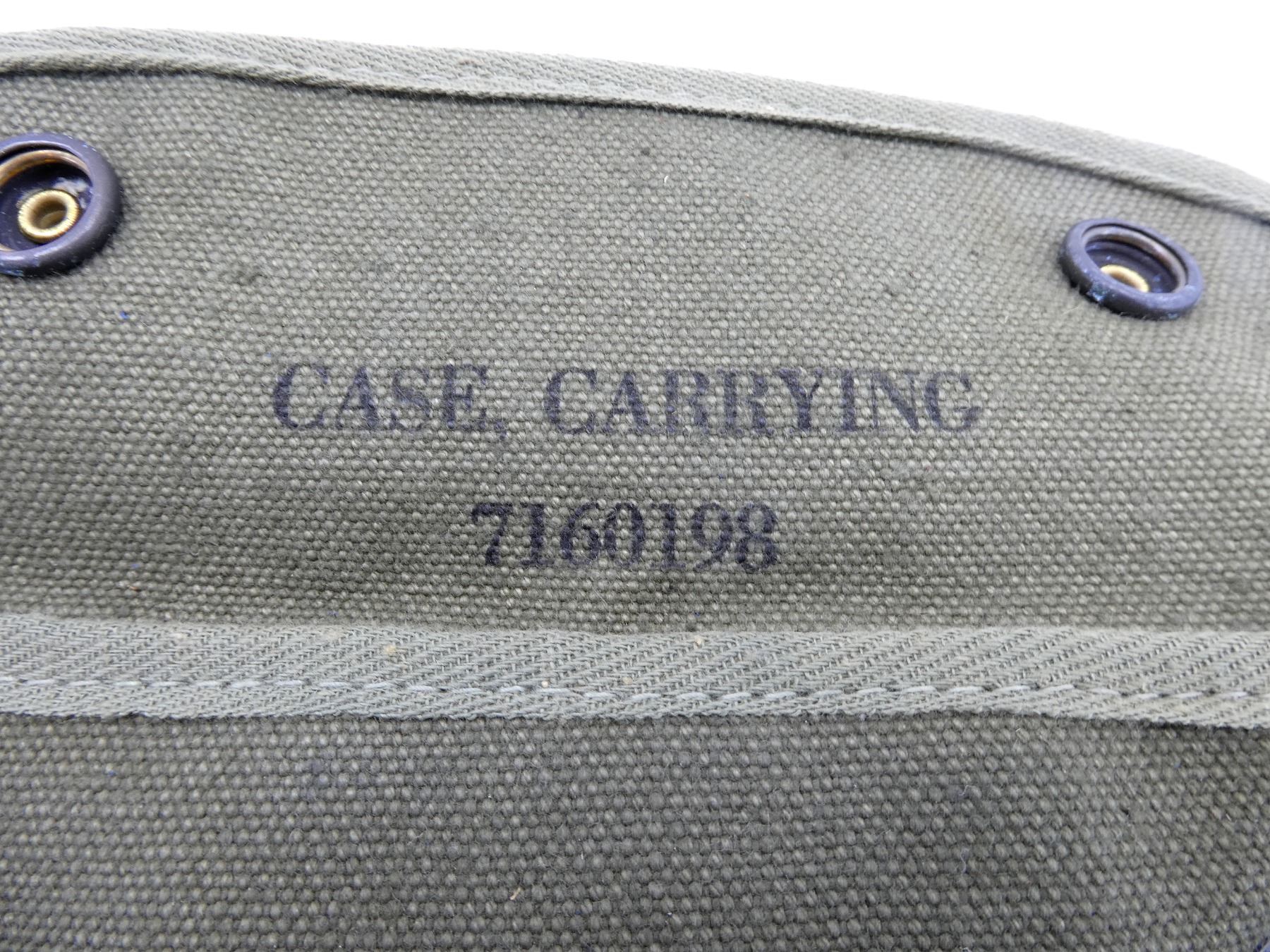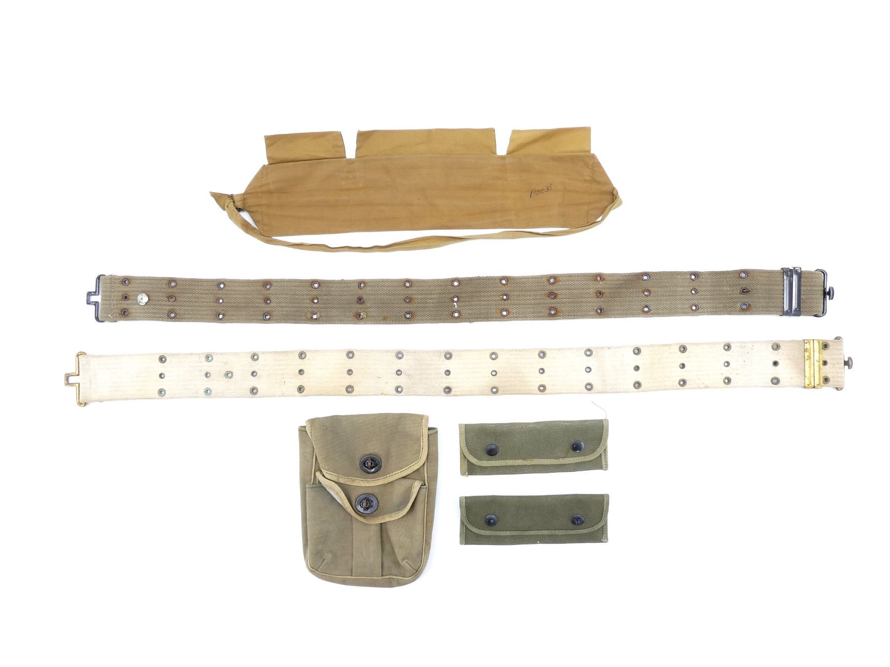 LOT INCLUDES; (2) U.S. MILITARY STYLE GREEN / WHITE CANVAS PISTOL BELTS, METAL / BRASS FITTINGS, NO VISIBLE MARKINGS, OALS APPROX. 36" & 37.5", (2) U.S. MILITARY GREEN CANVAS CARRYING CASES, MARKED: "CASE, CARRYING, 7160198", BELT HOOKS, SNAP CLOSURES, (1) UNKNOWN MILITARY TAN CANVAS POUCH, 2-POCKETS, BELT LOOP, NO VISIBLE MARKINGS & (1) UNKNOWN MILITARY BANDOLIER, BROWN / TAN CLOTH, HAND-WRITTEN MARKED: "B0035", OAL APPROX. 18.5". SEE PHOTOS.