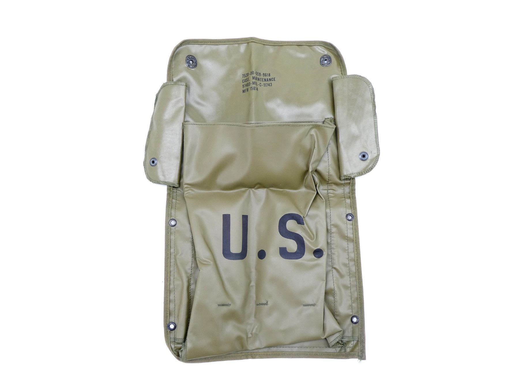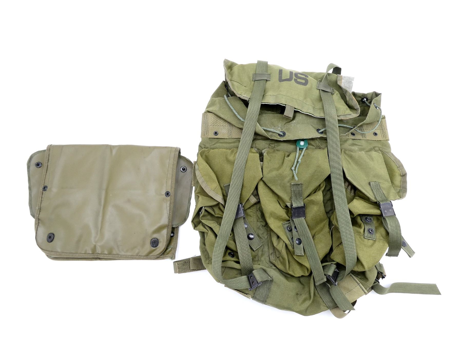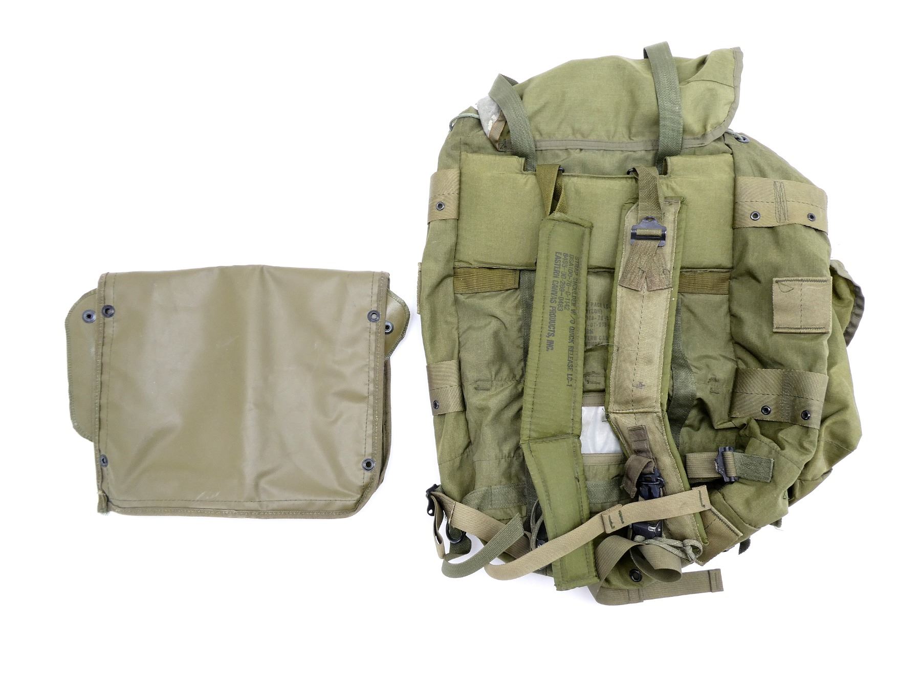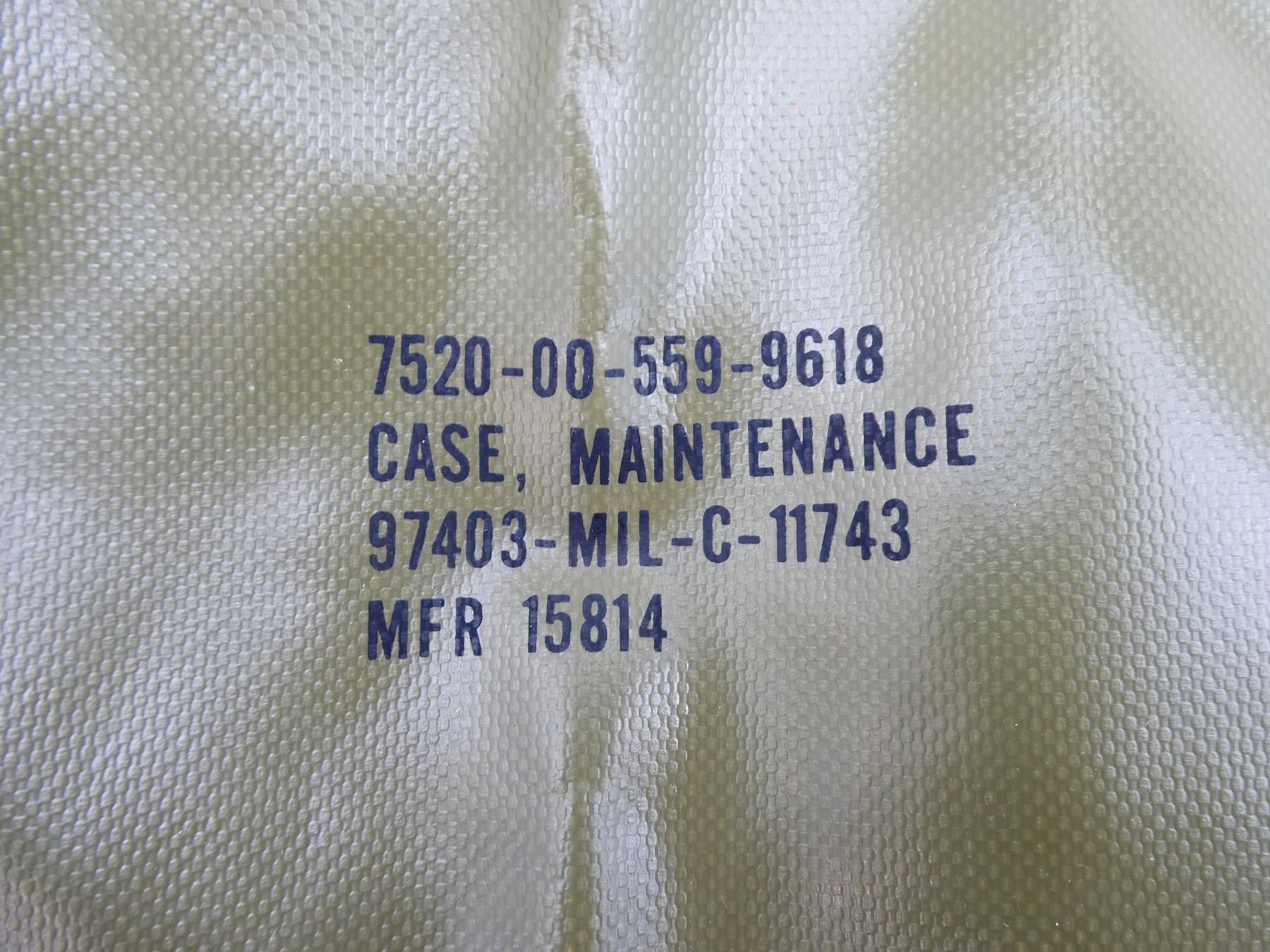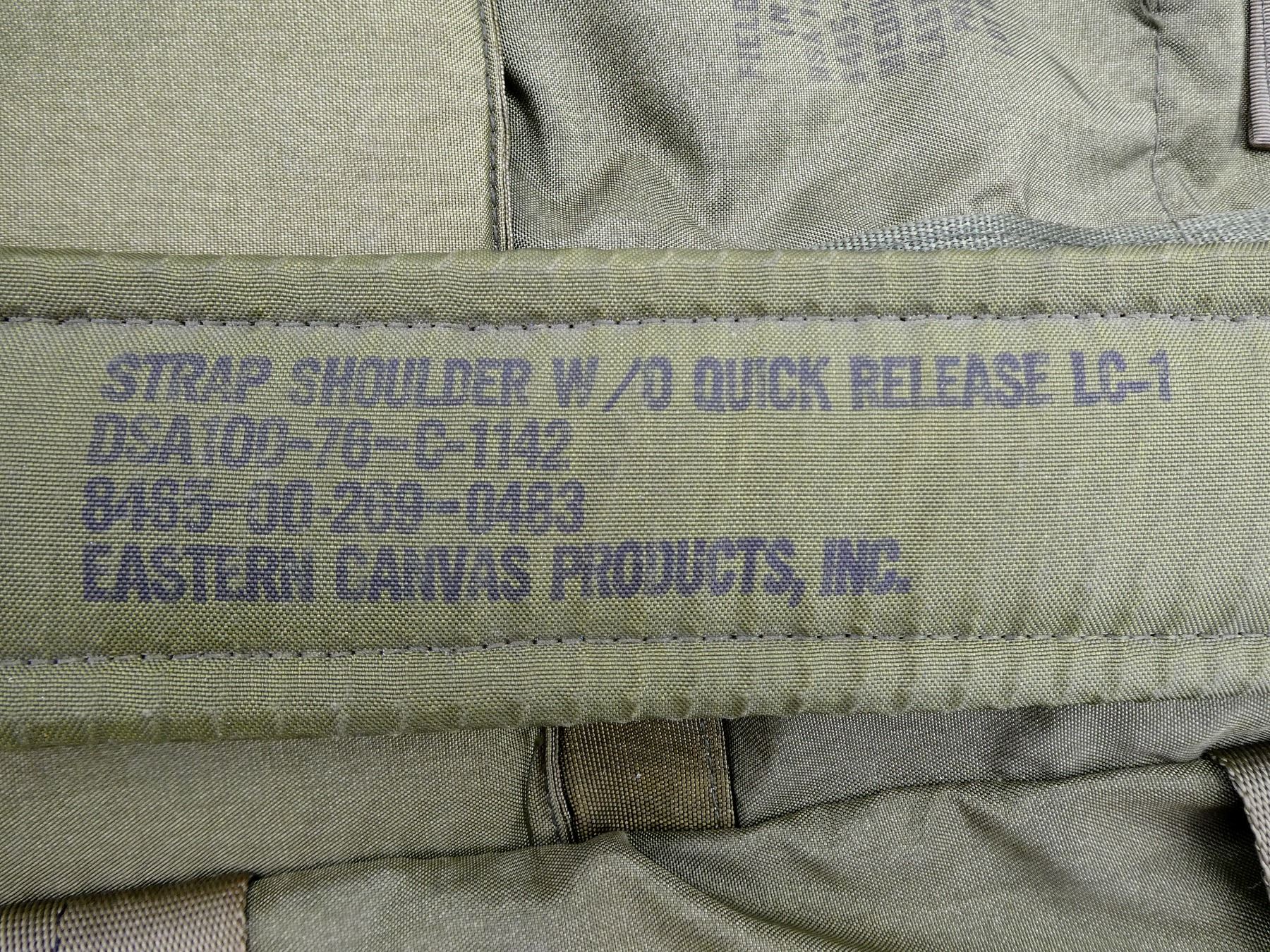 LOT INCLUDES; (1) 1976 DATED RUCKSACK, GREEN NYLON RUCKSACK WITH SHOULDER STRAPS, MARKED: "US" & "FIELD PACK LC-1, (NYLON), DSA 100-76-C-1505, 8455-01-019-9102, MEDIUM, EASTERN CANVAS PRODUCTS, INC." ETC., VARIOUS CLEAR MARKINGS ON SHOULDER STRAPS, DATED 1976, VARIOUS POCKETS / STRAPS, SHOWS WEAR & (1) OLIVE GREEN RUBBER MAINTENANCE CASE, MARKED: "U.S." & "7520-00-559-9618, CASE, MAINTENANCE, 97403-MIL-C-11743, MFR 15814", TWO POCKETS, APPROX. 21.75" X 12.75". SEE PHOTOS.