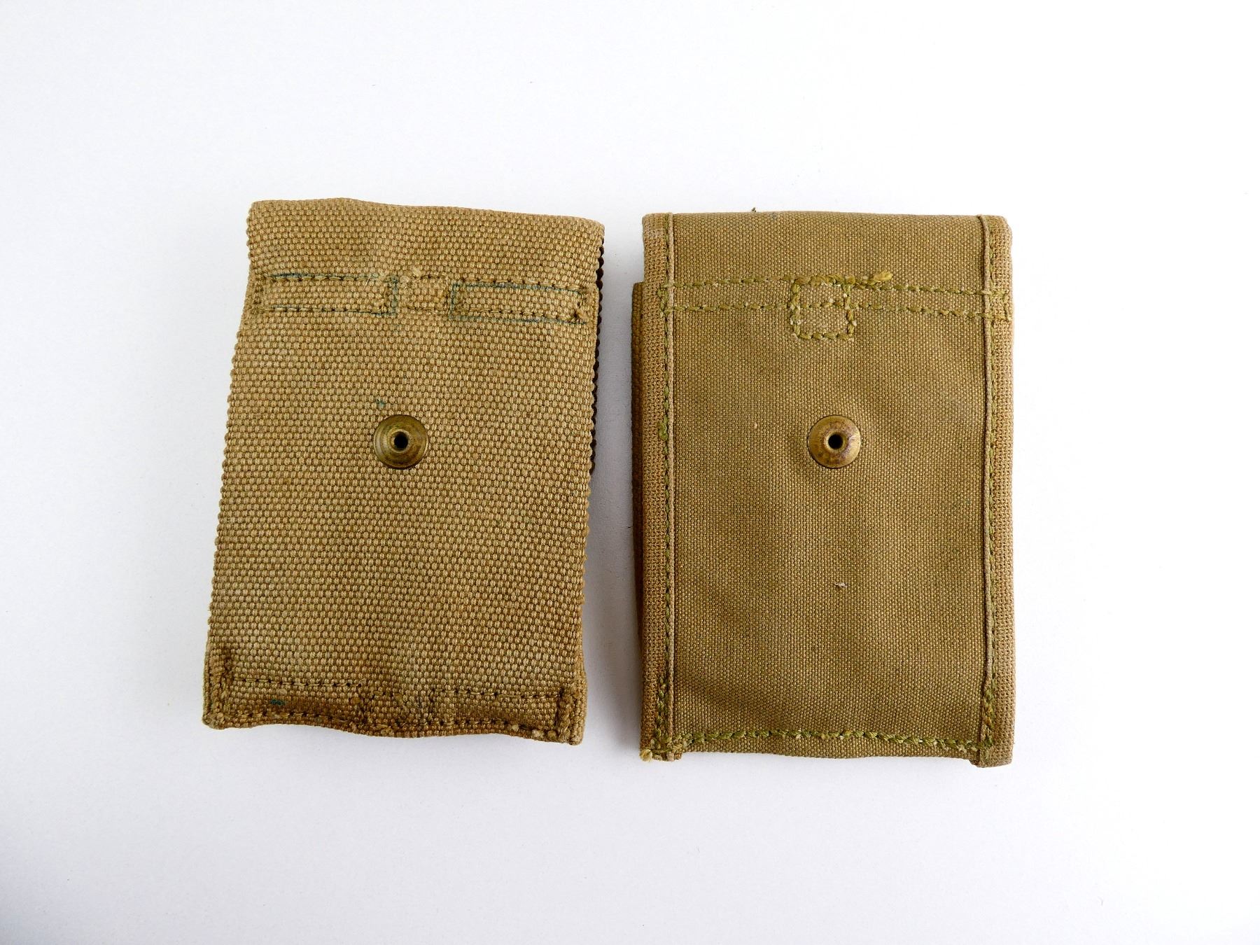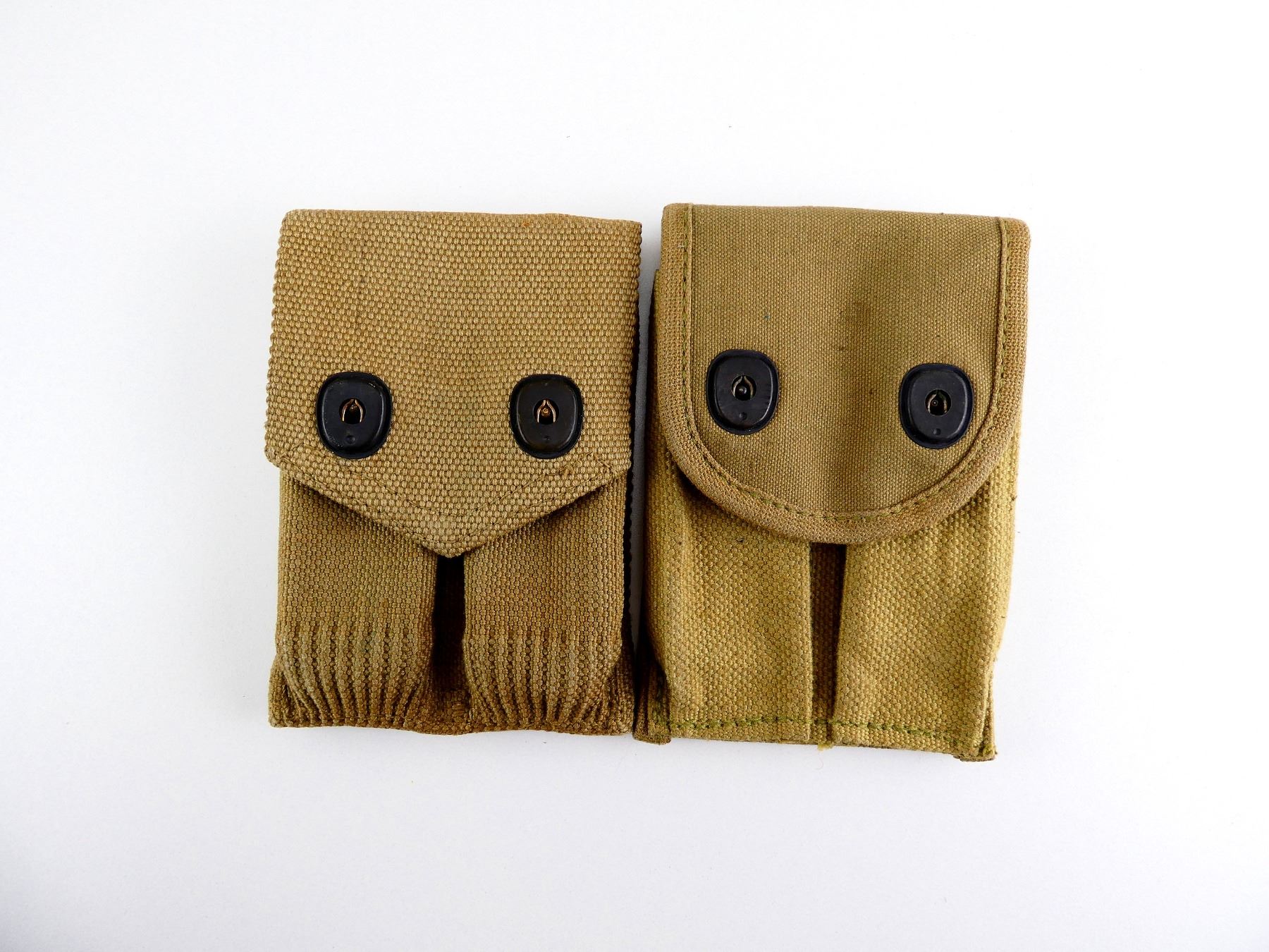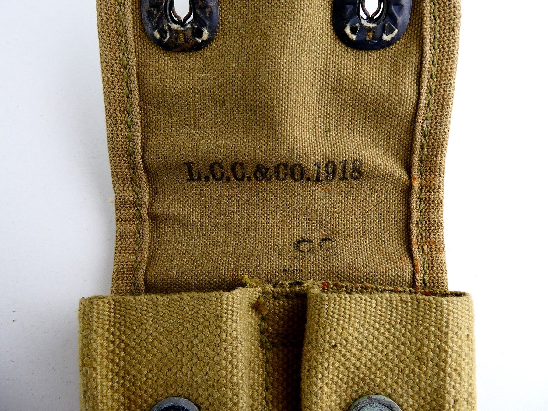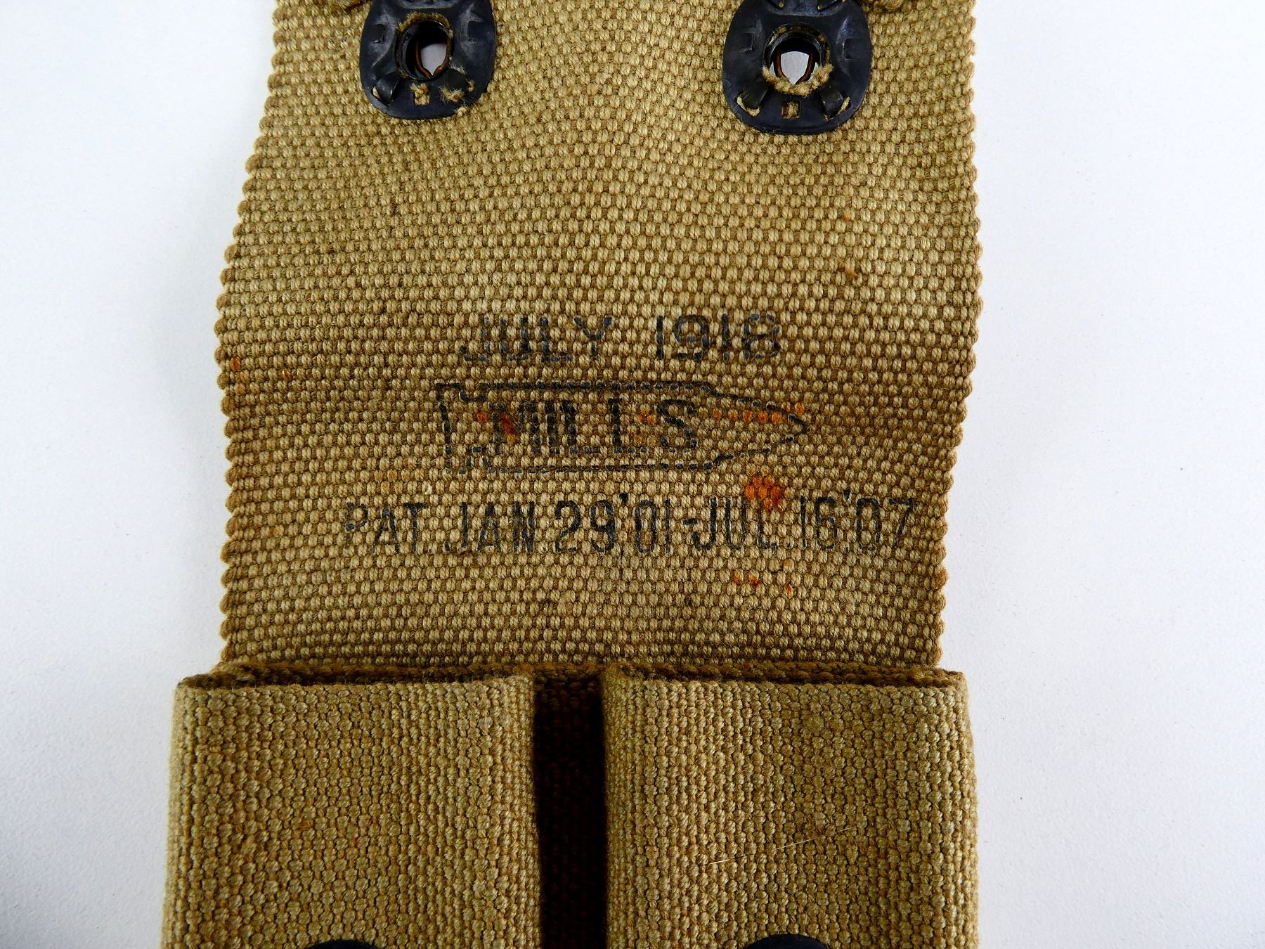 LOT INCLUDES; (2) TAN CANVAS, DOUBLE-POCKET AMMO POUCHES WITH LARGE BELT LOOP, ONE MARKED: "L.C.C. & CO. 1918, 55" & OTHER MARKED: "JULY 1918, MILLS, PAT. JAN 29' 01-JUL. 16. '07". SEE PHOTOS.