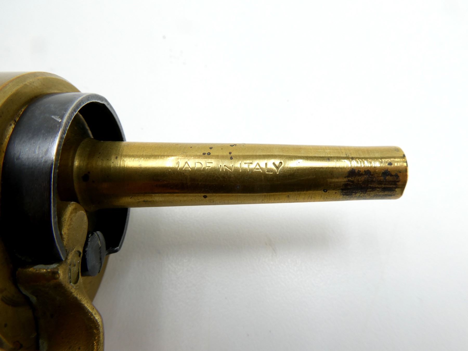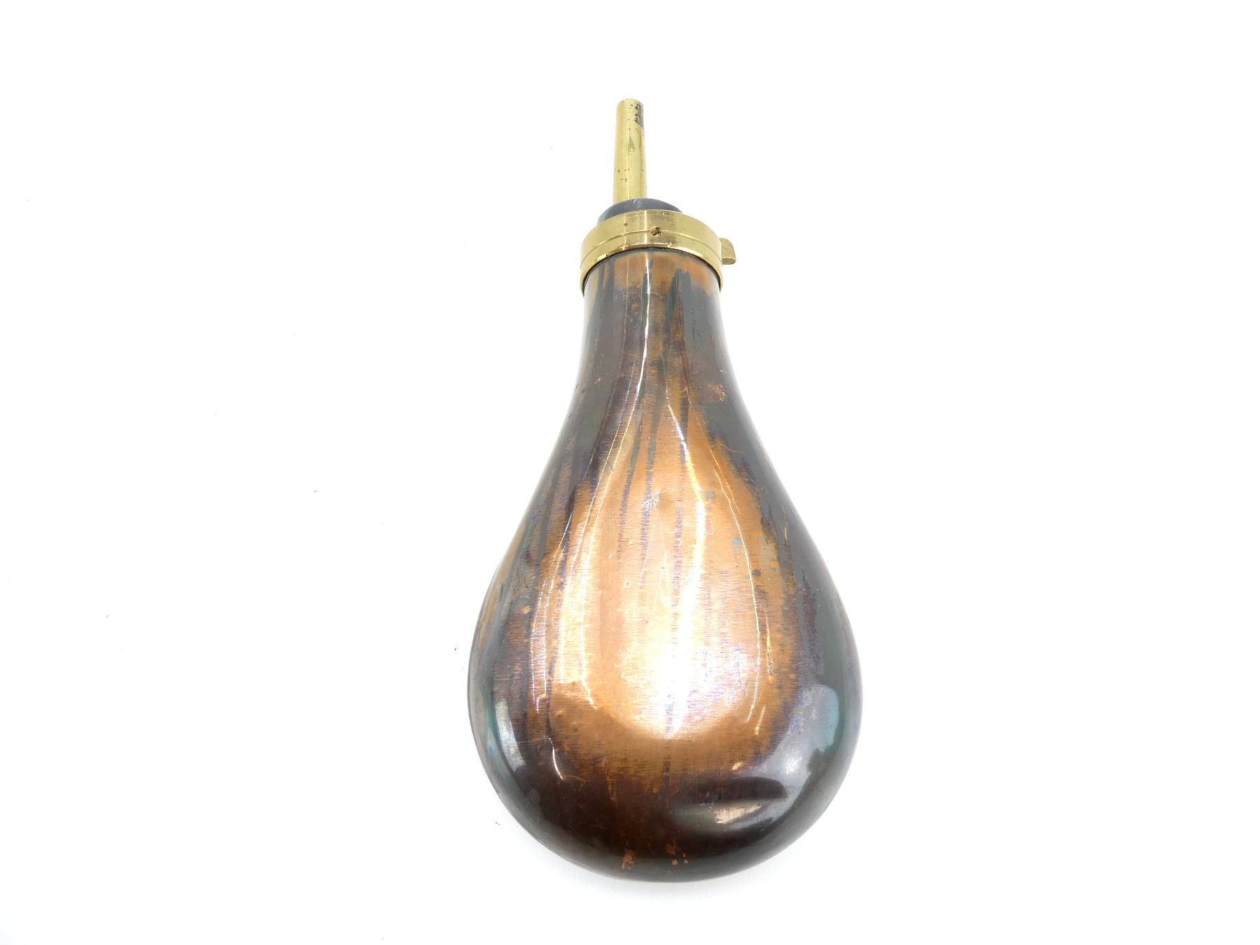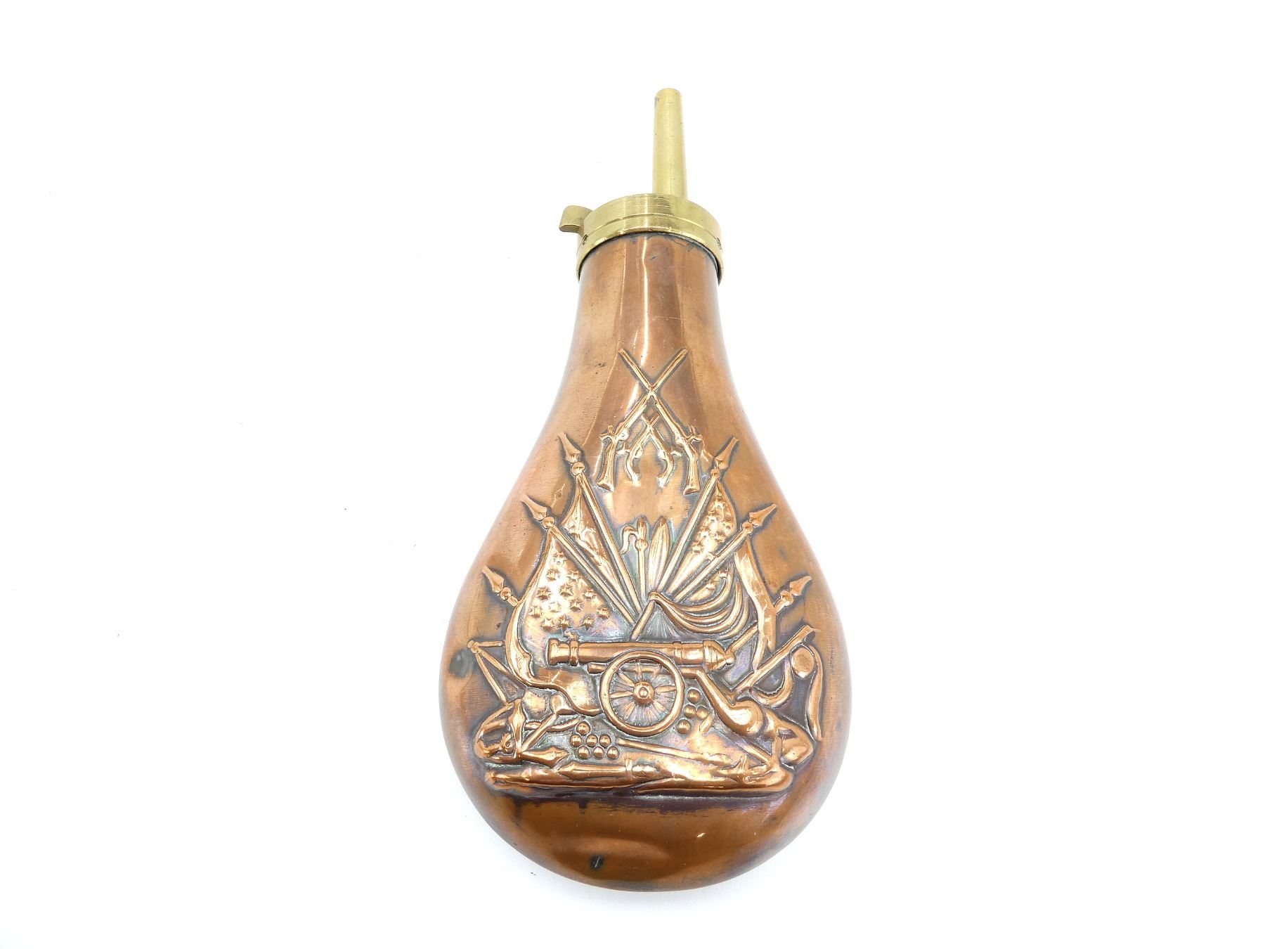 (1) COPPER & BRASS POWDER FLASK WITH SINGLE-SIDE EMBOSSED COLT'S STAND OF FLAGS (FLAGS & CANNON) MOTIF, SPOUT MARKED: "MADE IN ITALY", OAL APPROX. 7.75". SEE PHOTOS.
