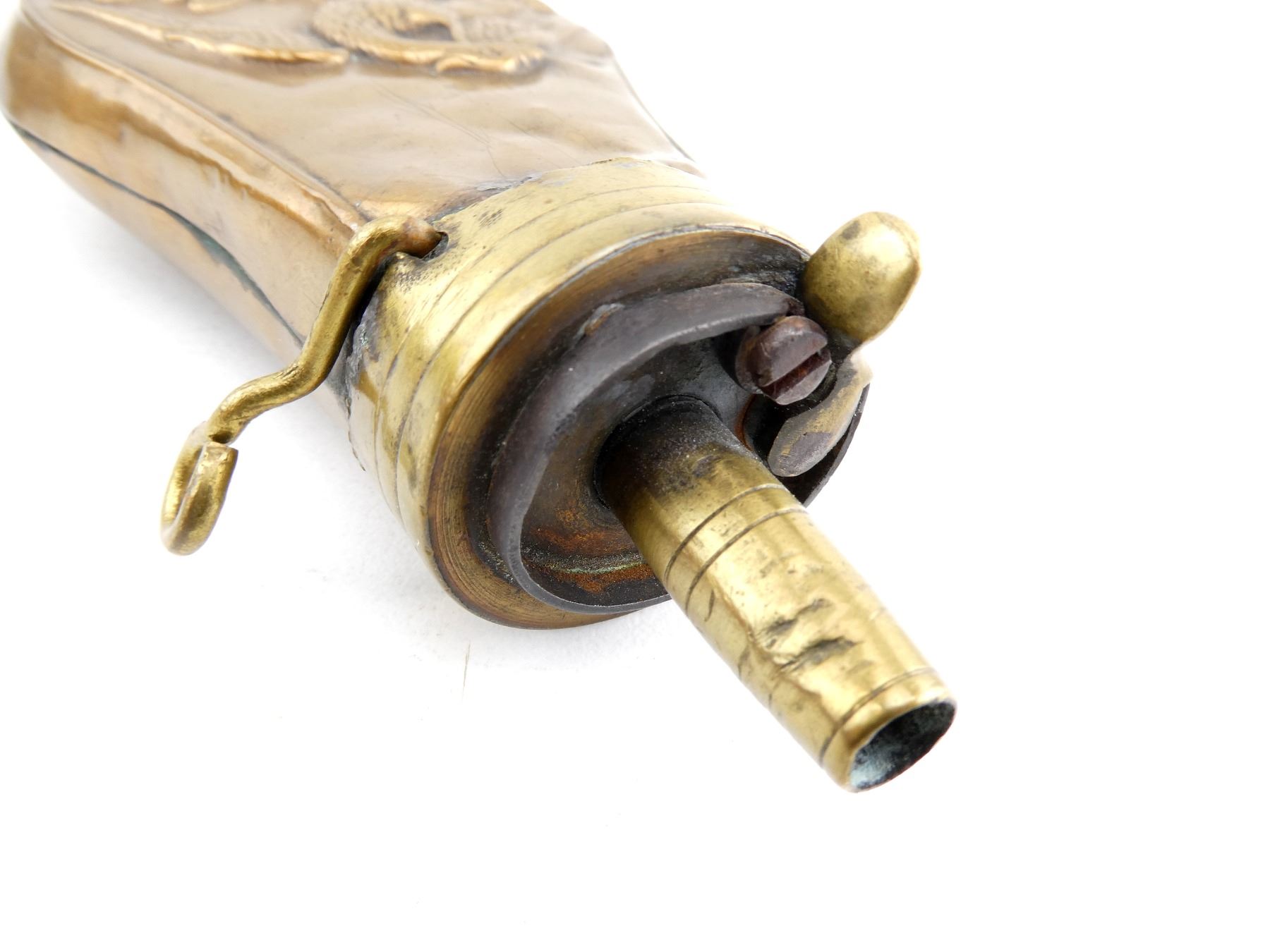 (1) EMBOSSED BRASS & COPPER POWDER FLASK, AMERICAN EAGLE WITH SHIELD / ARROWS / OLIVE BRANCH & BANNER MARKED: "PLURIBUS UNUM", OAL APPROX. 4 7/8". SEE PHOTOS.