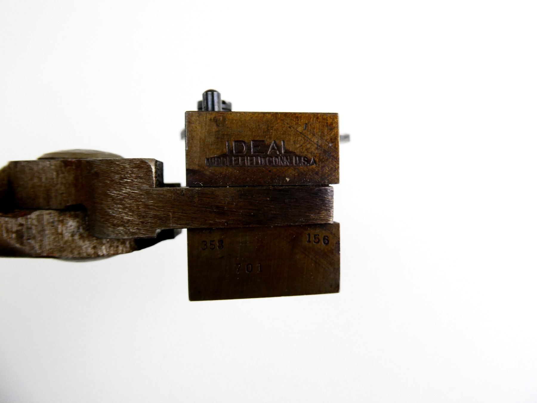 LOT INCLUDES; (1) .38 CAL. SINGLE-CAVITY BULLET MOLD WITH WOOD HANDLES ATTACHED, MOLD MARKED: "IDEAL, 358 156, 701". SEE PHOTOS.