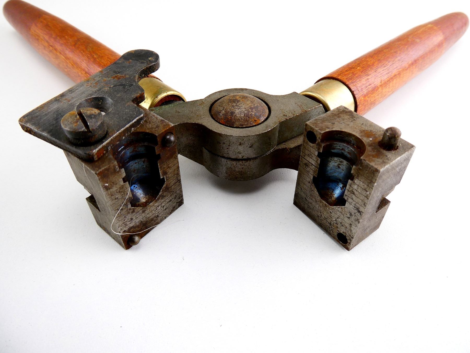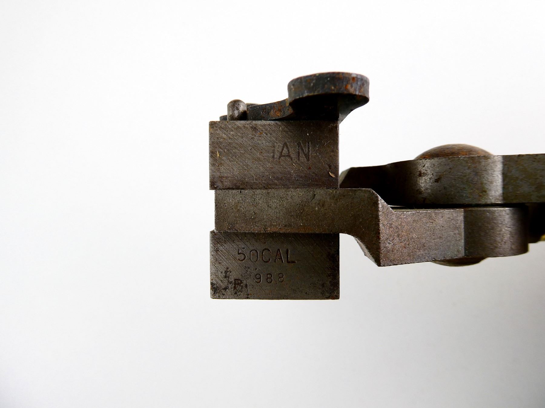 LOT INCLUDES; (1) .50 CAL. SINGLE-CAVITY BULLET MOLD WITH WOOD HANDLES ATTACHED, MOLD MARKED: "LYMAN, .50 CAL., 988". SEE PHOTOS.