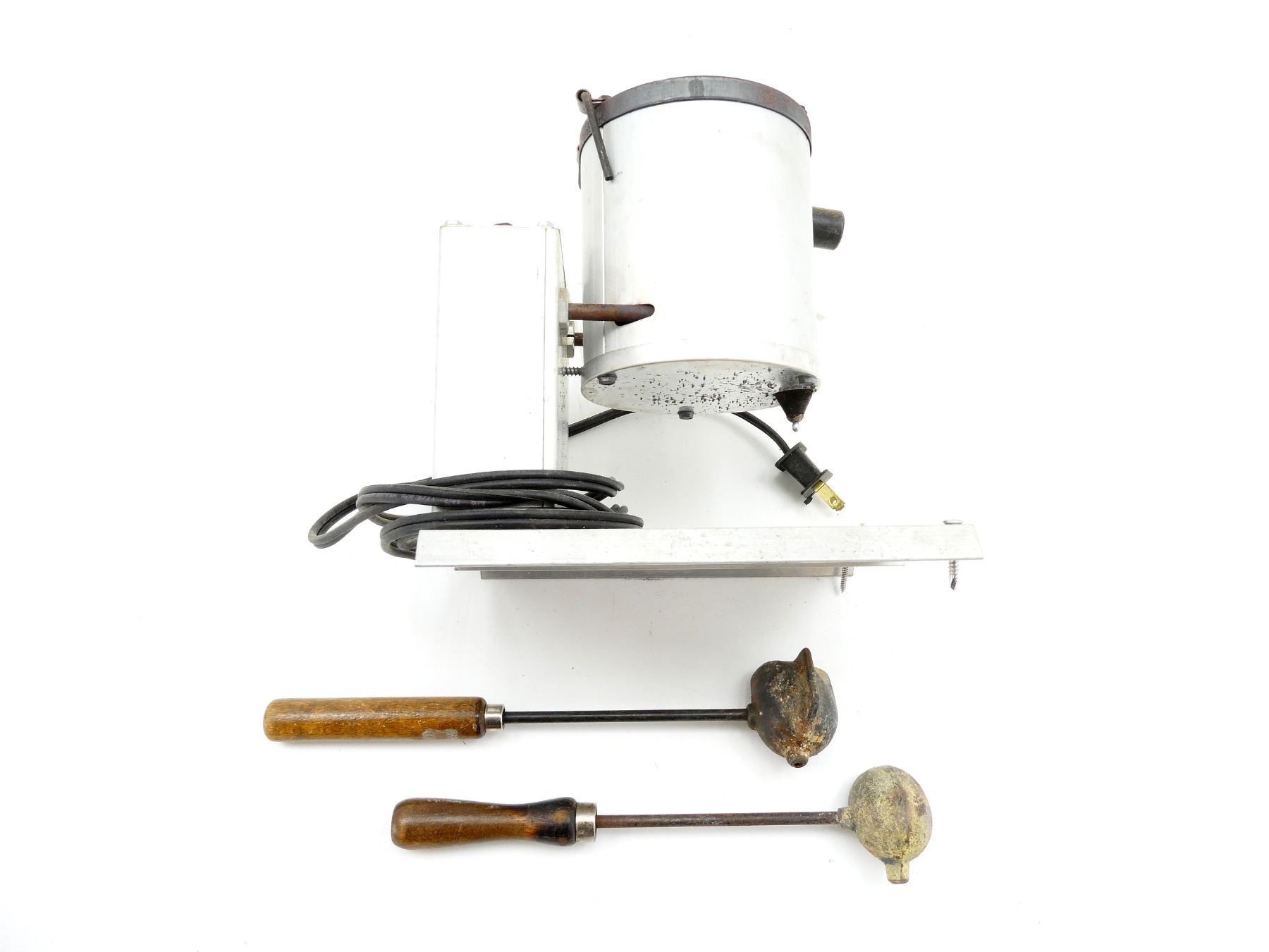LOT INCLUDES; (1) MELTING POT, MARKED: "INFINITE HEAT CONTROL", "500 WATTS", ETC., UN-TESTED & (2) ASSORTED SIZE LEAD DIPPERS. SEE PHOTOS.