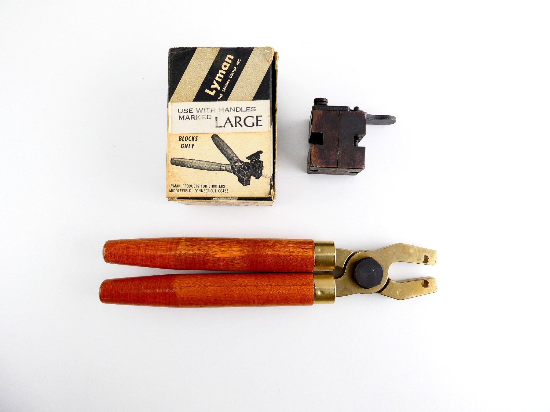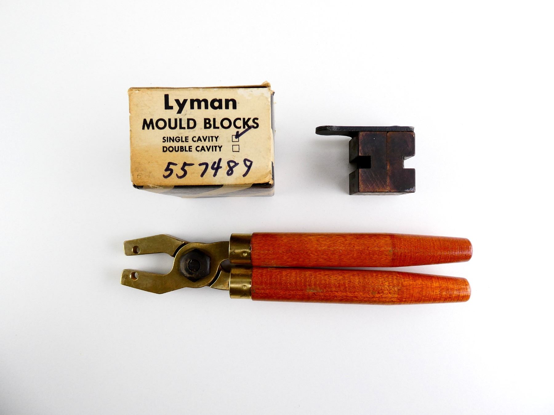 LOT INCLUDES; (1) LYMAN .557 CAL. SINGLE-CAVITY BULLET MOLD, MARKED: "557489, 160", WITH ORIGINAL PACKAGING & (1) SET OF WOOD HANDLES, NOT ATTACHED. SEE PHOTOS.