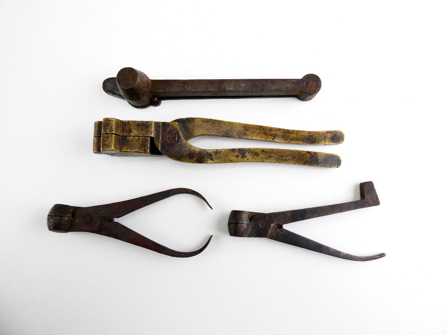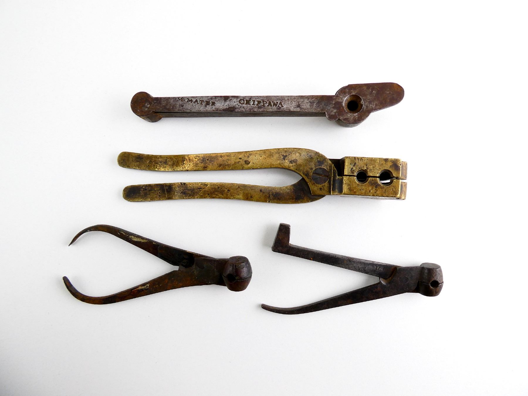 LOT INCLUDES; (3) ASSORTED METAL ROUND BALL MOLDS, SINGLE-CAVITY, MARKED: "6", "100(?)" & "M.MATER, CHIPPAWA" (1) BRASS ROUND BALL & BULLET MOLD, UNMARKED. SEE PHOTOS.