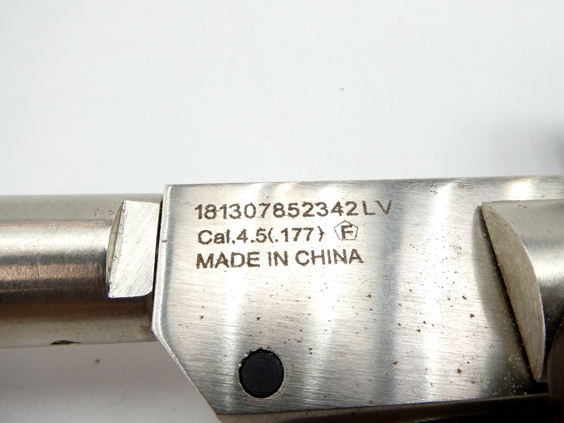 (1) .177 CAL / 4.5MM PELLET, SPRING / AIR POWERED, SINGLE SHOT, BREAK ACTION, SATIN NICKEL PLATED BARREL / RECEIVER, HARDWOOD STOCK WITH RECOIL PAD, APPROX. 495 FPS, VARIOUS MARKINGS, NO COCKING ISSUES, NOT FULLY TESTED, WITH (1) BEEMAN 3-9X32 SCOPE, DUPLEX RETICLE, 1" TUBE DIAMETER, WORKING MAGNIFICATION RING, WINDAGE & ELEVATION KNOBS TURN, SCOPE SHOWS WEAR & TEAR / USE MARKS. SEE PHOTOS.